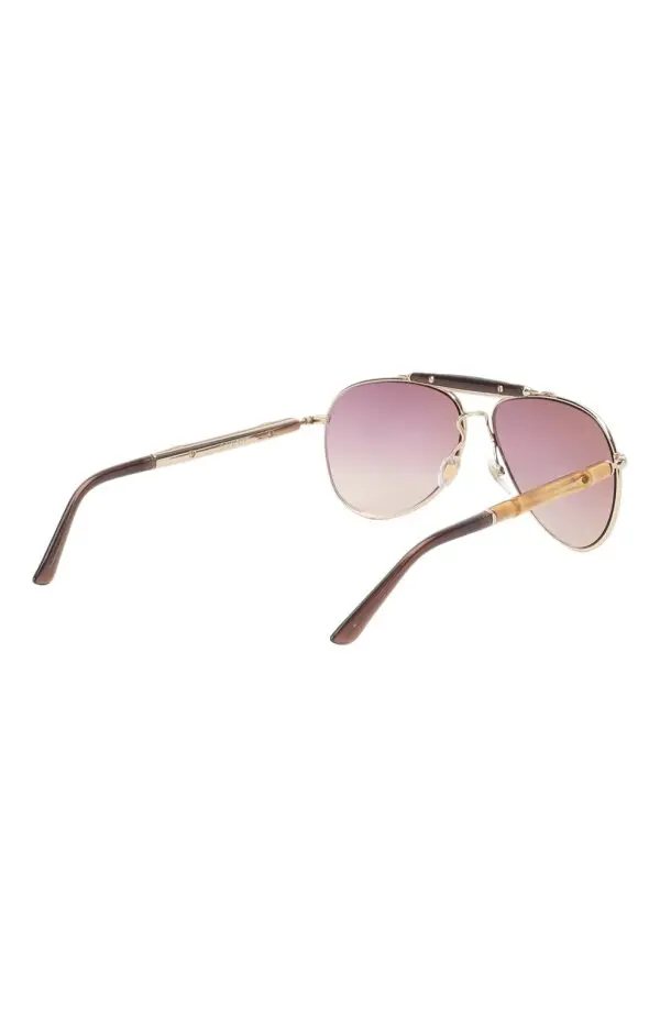 Солнцезащитные очки Gucci с утончённой металлической оправой золотистого оттенка, фиолетовыми градиентными линзами и эффектными вставками из бамбука на переносице и дужках. Такой дизайн придаёт модели лёгкий винтажный и в то же время современный акцент.