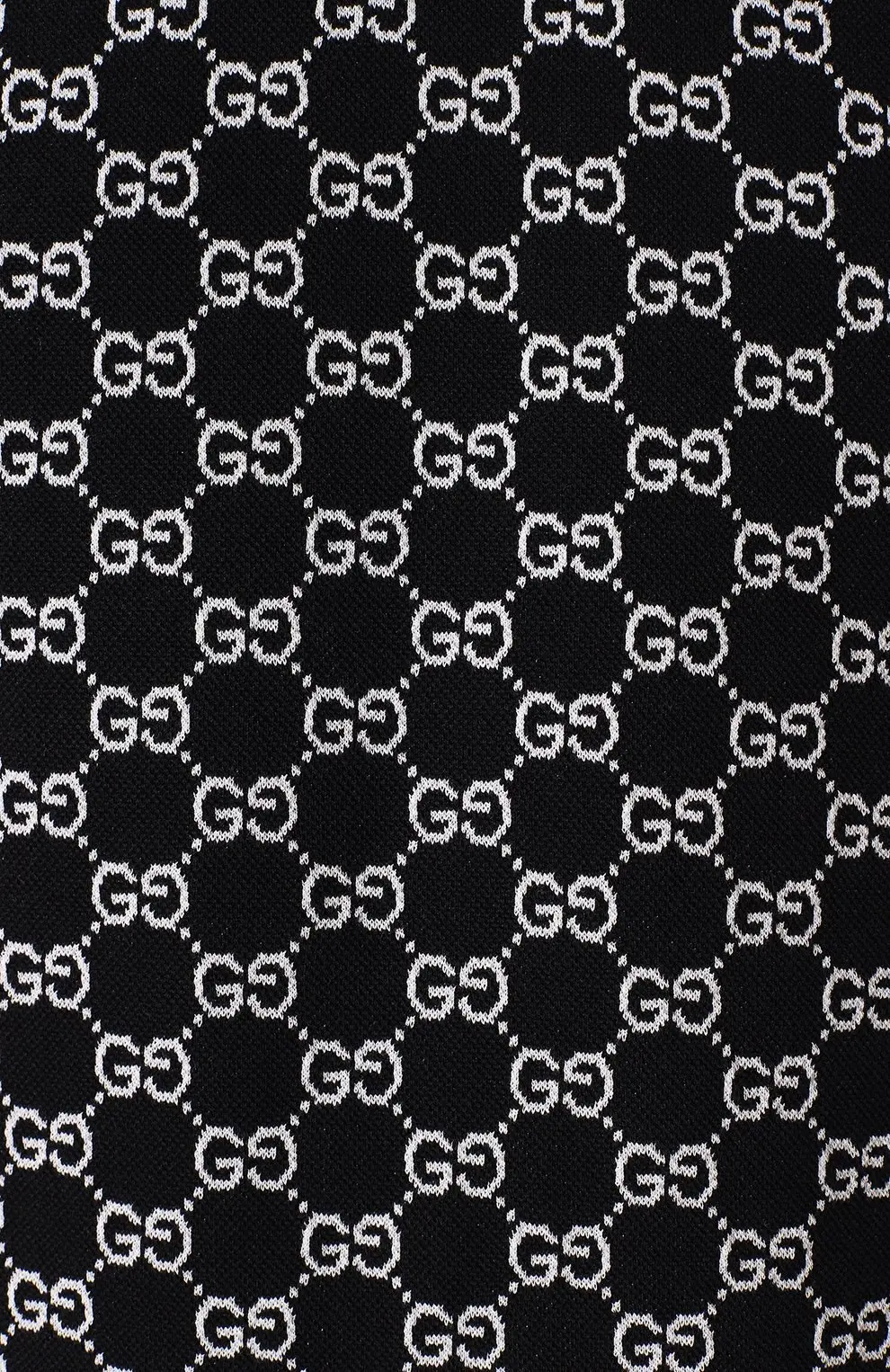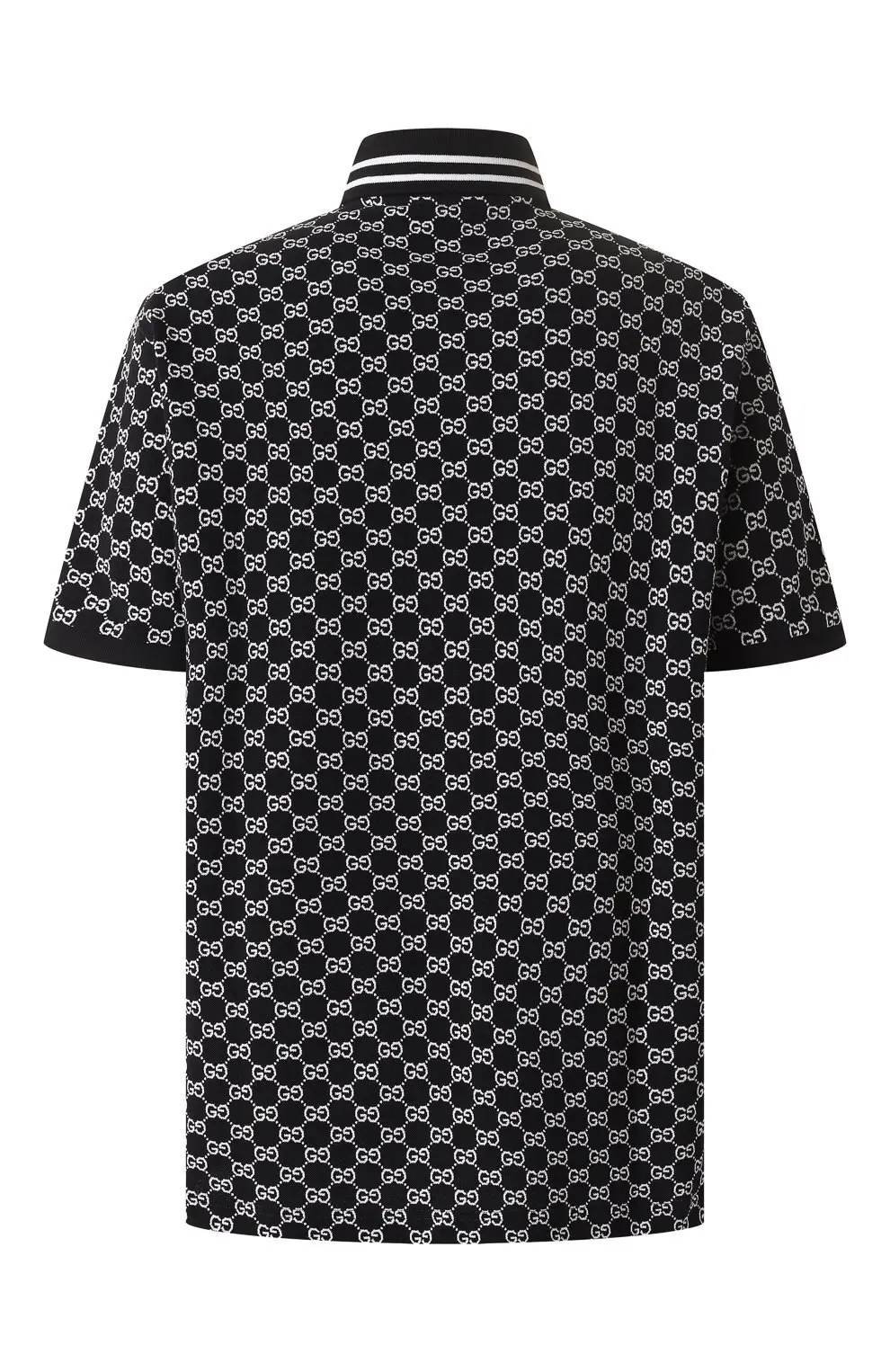 Поло Gucci из мягкого хлопка с классическим кроем. Чёрная ткань полностью украшена культовым узором GG в контрастном белом цвете. Воротник дополнен стильными полосами, подчёркивающими спортивно-элегантный характер модели.