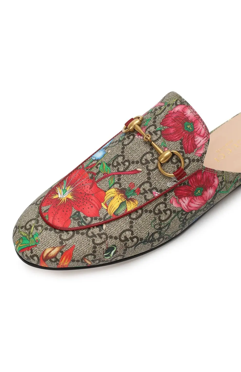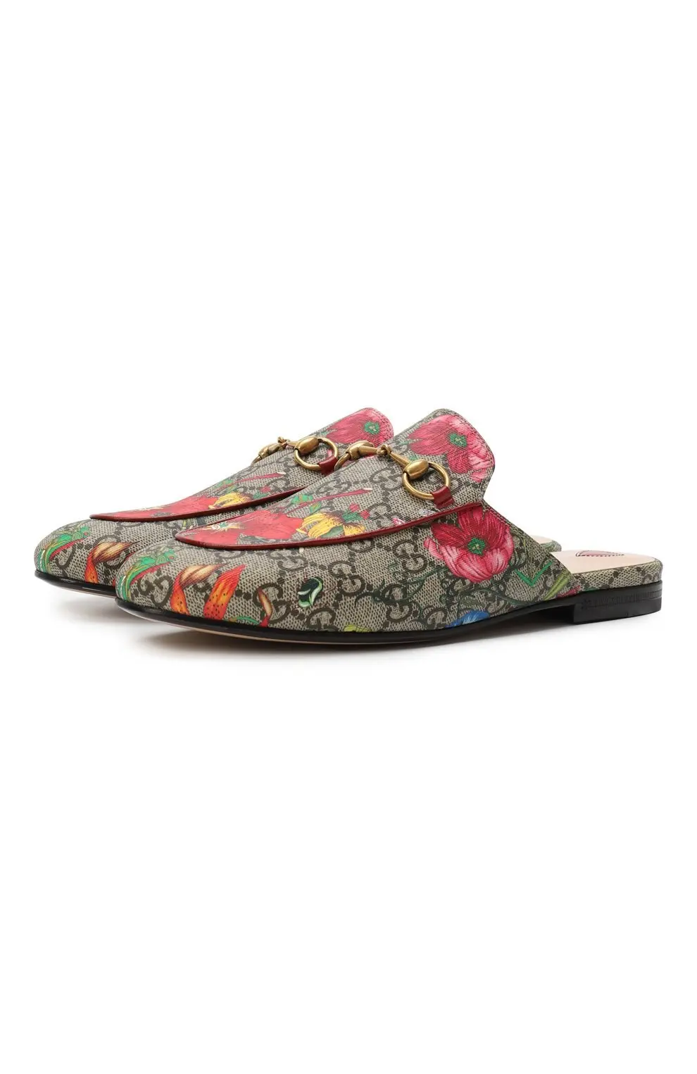 Сабо Princetown Gucci выполнены из канвы GG Supreme с ярким цветочным принтом Flora. Декорированы фирменным золотистым конским трензелем, сочетая элегантность и яркий акцент. Лаконичный силуэт делает модель удобной и стильной для повседневных образов.
