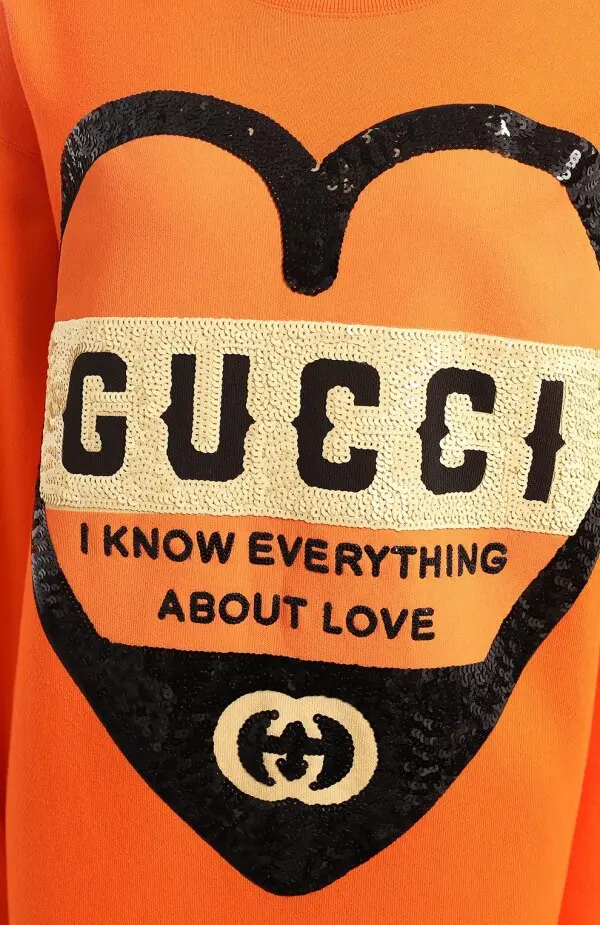 Свитшот Gucci сшили из мягкого хлопка ярко-оранжевого оттенка. Модель прямого кроя оформили крупным принтом в форме сердца с пайетками и контрастной надписью I know everything about love. Акцентный дизайн подчеркивает игривый характер бренда и станет ключевой деталью в повседневных образах.