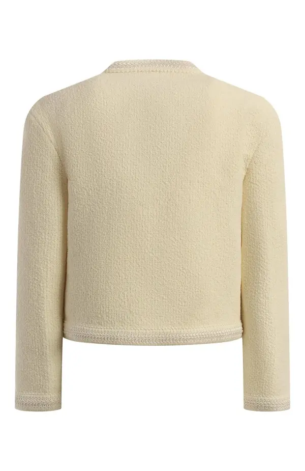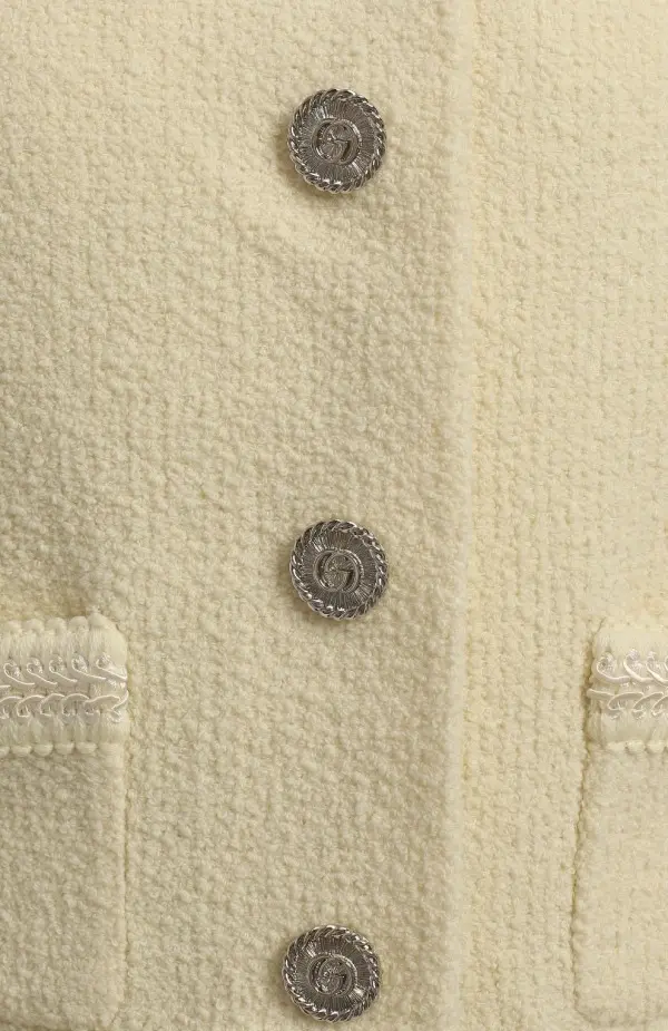 Жакет от Gucci выполнен из мягкой шерсти в светлом оттенке. Модель прямого кроя с округлым вырезом горловины и длинными рукавами украшена декоративной строчкой по краям. Акцент делают металлические пуговицы с рельефным узором. Изделие дополнено накладными карманами спереди.