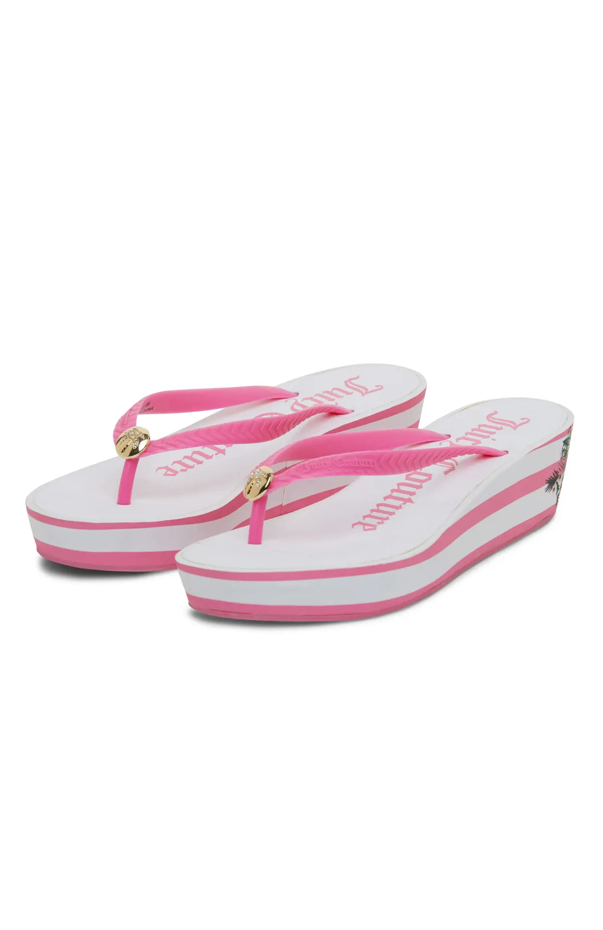 Сланцы выполнены из лёгкого эластичного материала и посажены на клиновидную платформу с контрастными полосами. Межпальцевый ремешок дополнен миниатюрным металлическим декором и обеспечивает комфортное прилегание. Упругая подошва смягчает шаг и визуально вытягивает силуэт.
