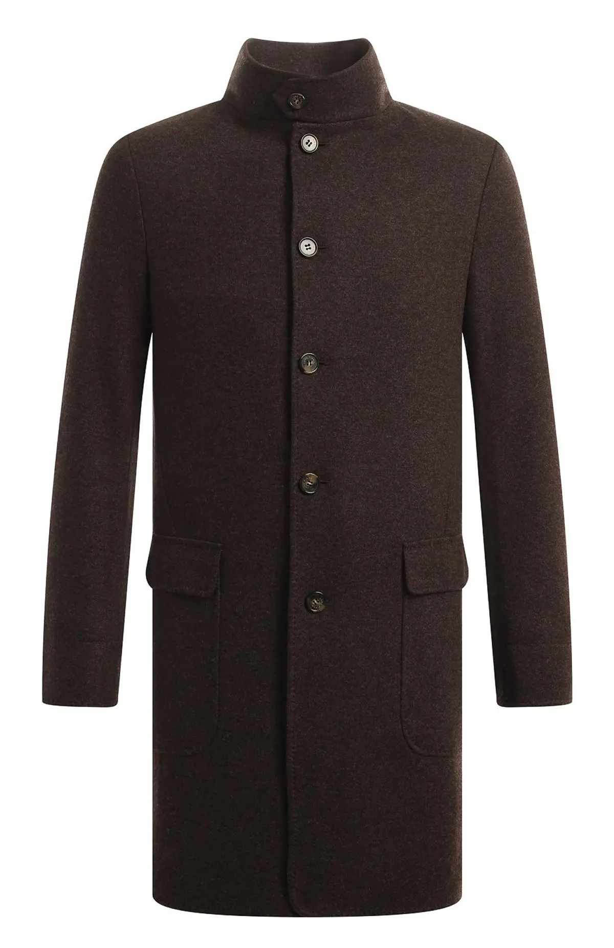 Кашемировое пальто Loro Piana выполнено в элегантном минималистичном стиле. Модель прямого кроя дополнена стойкой-воротником и застежкой на пуговицы. Глубокий коричневый оттенок подчеркивает универсальность и изысканность изделия. Прорезные карманы с клапанами добавляют практичности, а мягкий кашемир обеспечивает комфорт и тепло в холодное время года. Идеальный выбор для создания классического мужского гардероба.