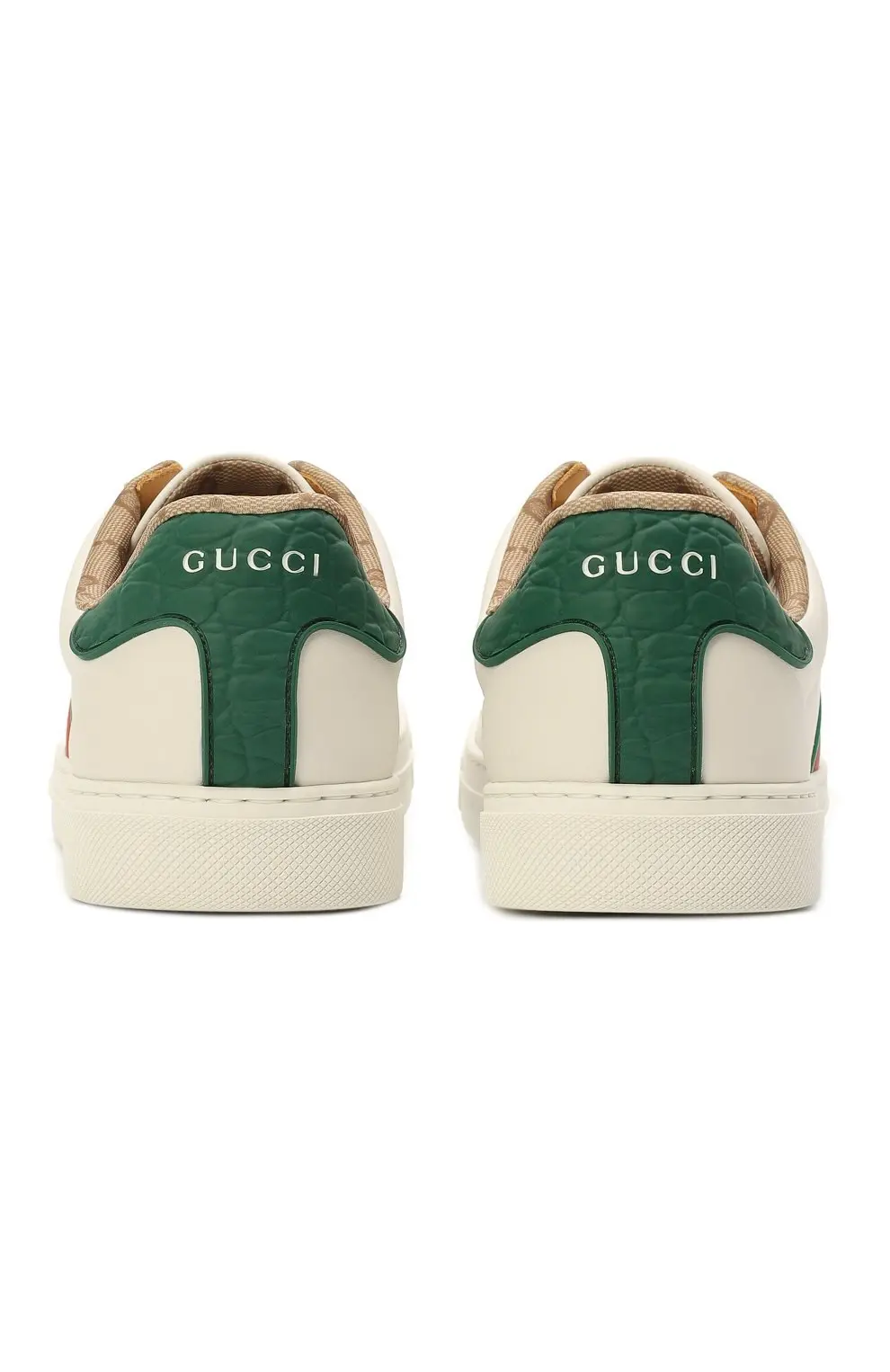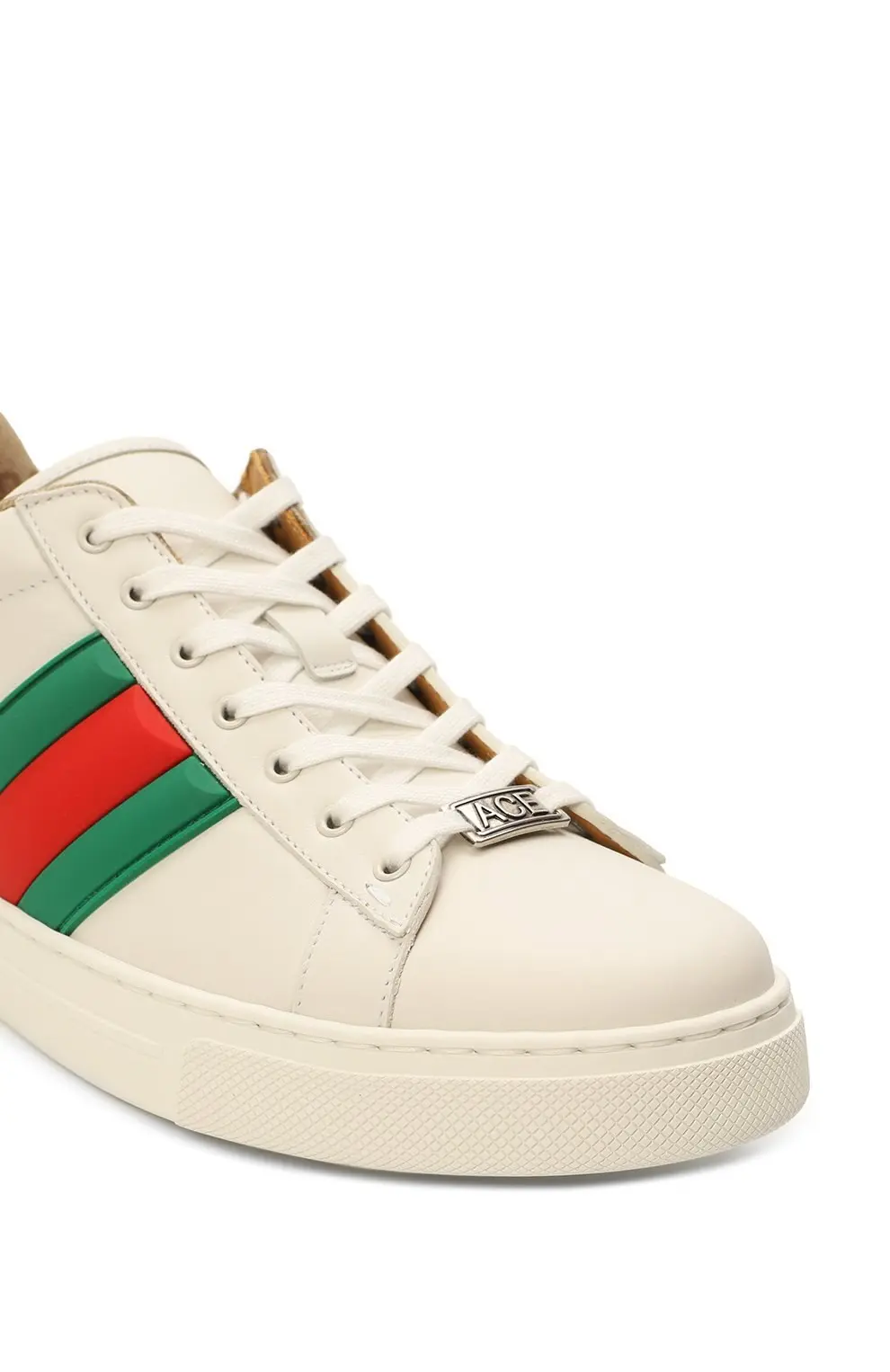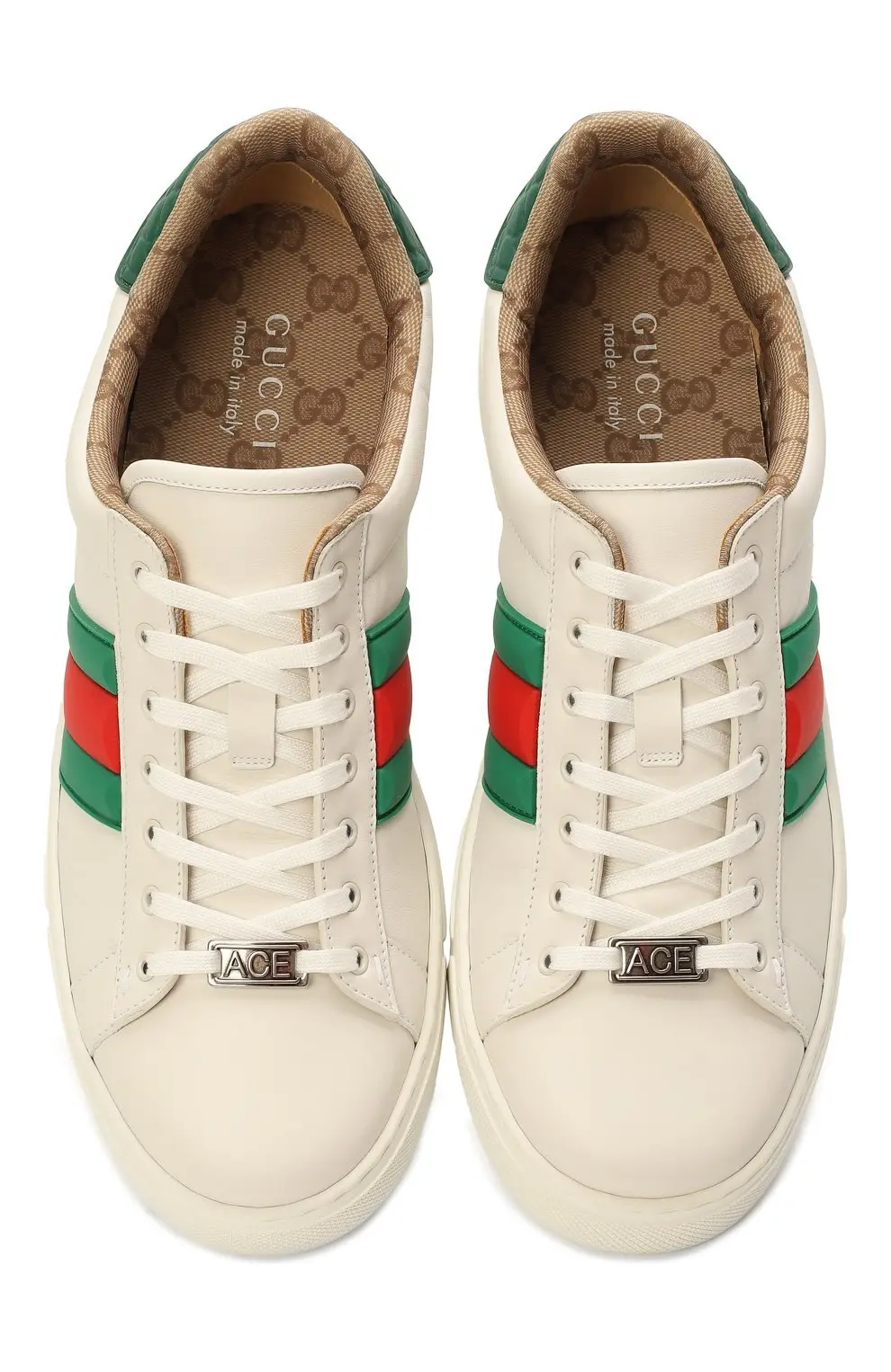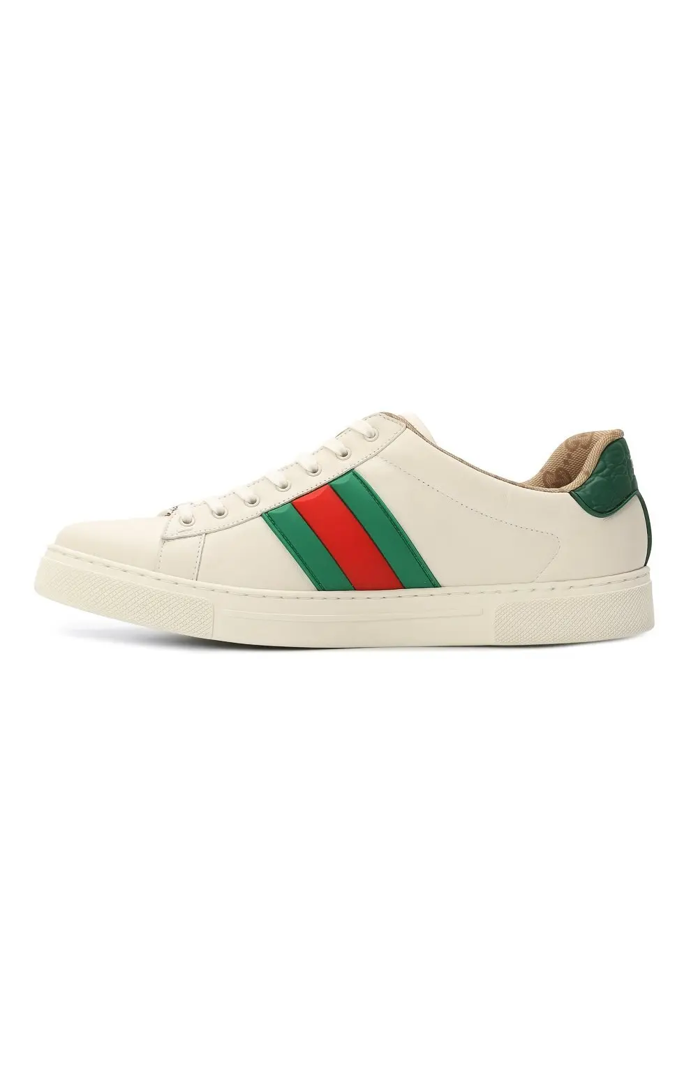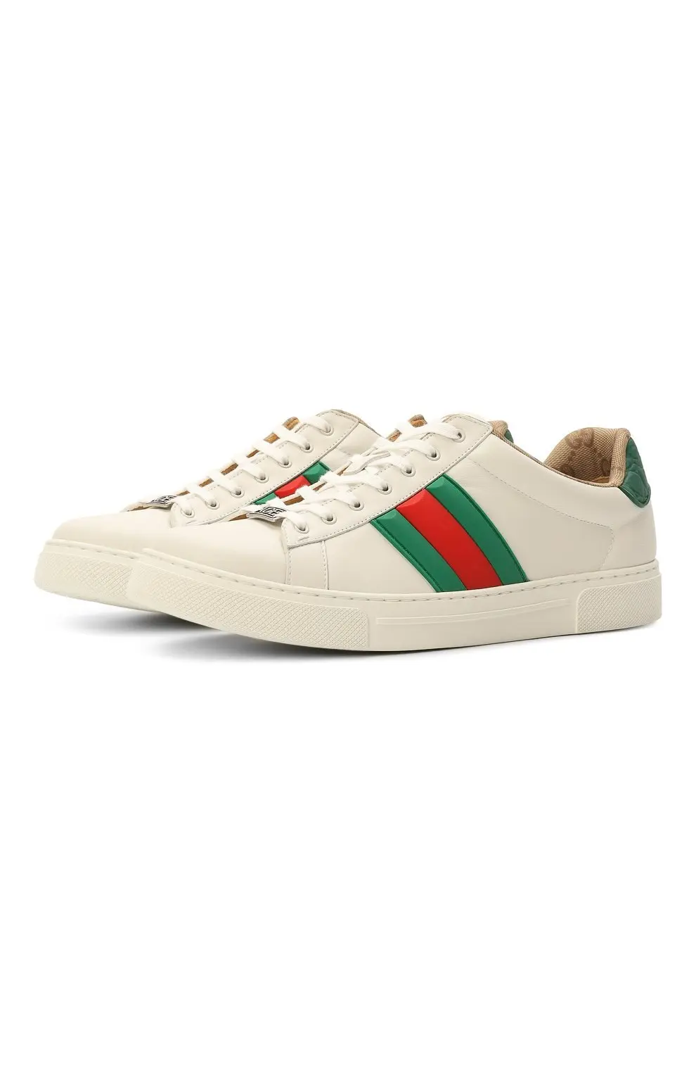 Кеды Gucci Ace из белой кожи с культовыми зелёно-красными полосами бренда. Лаконичный дизайн дополняется прочной резиновой подошвой и удобной шнуровкой. Универсальная пара, которая стильно завершит как повседневный, так и спортивный образ.