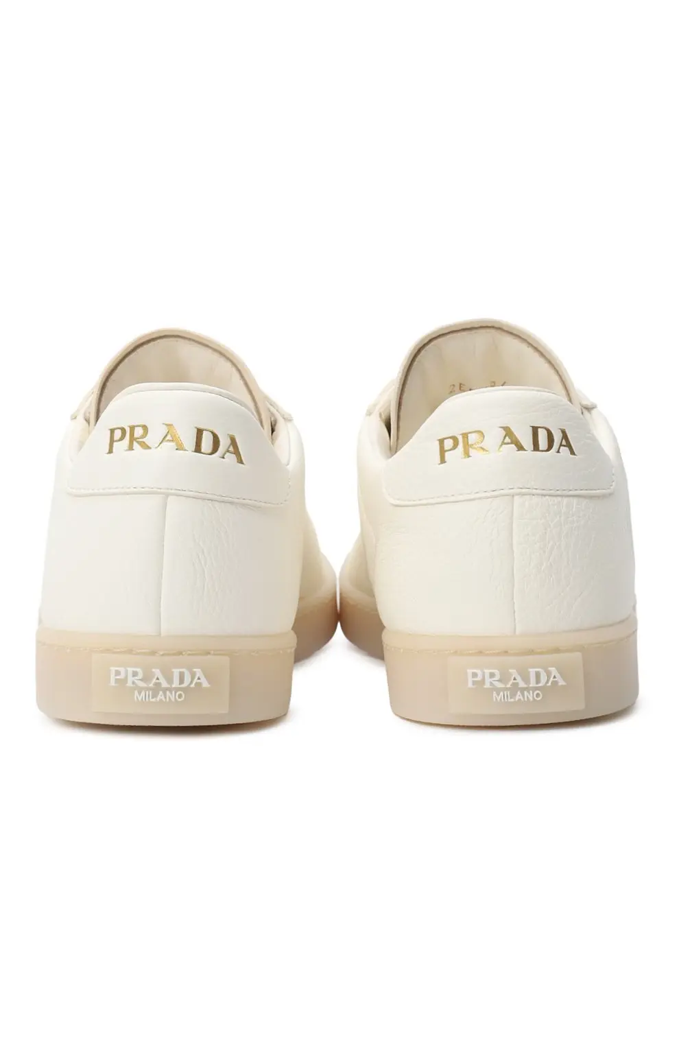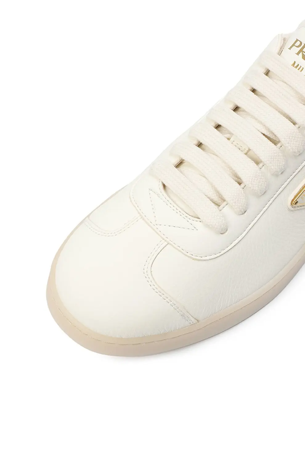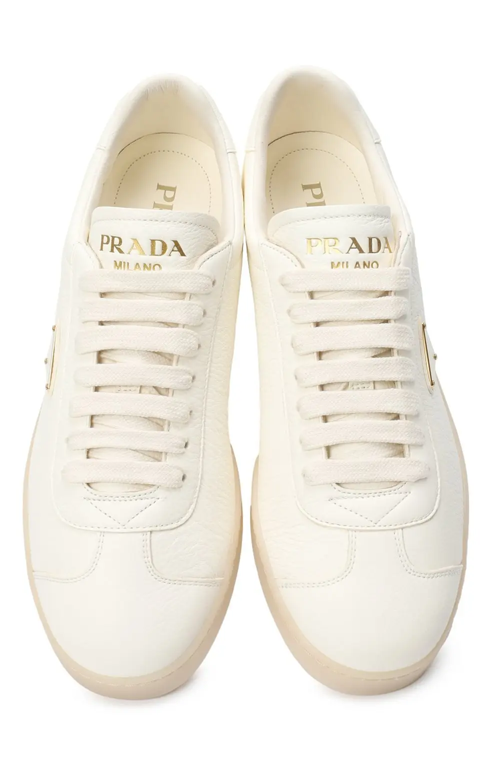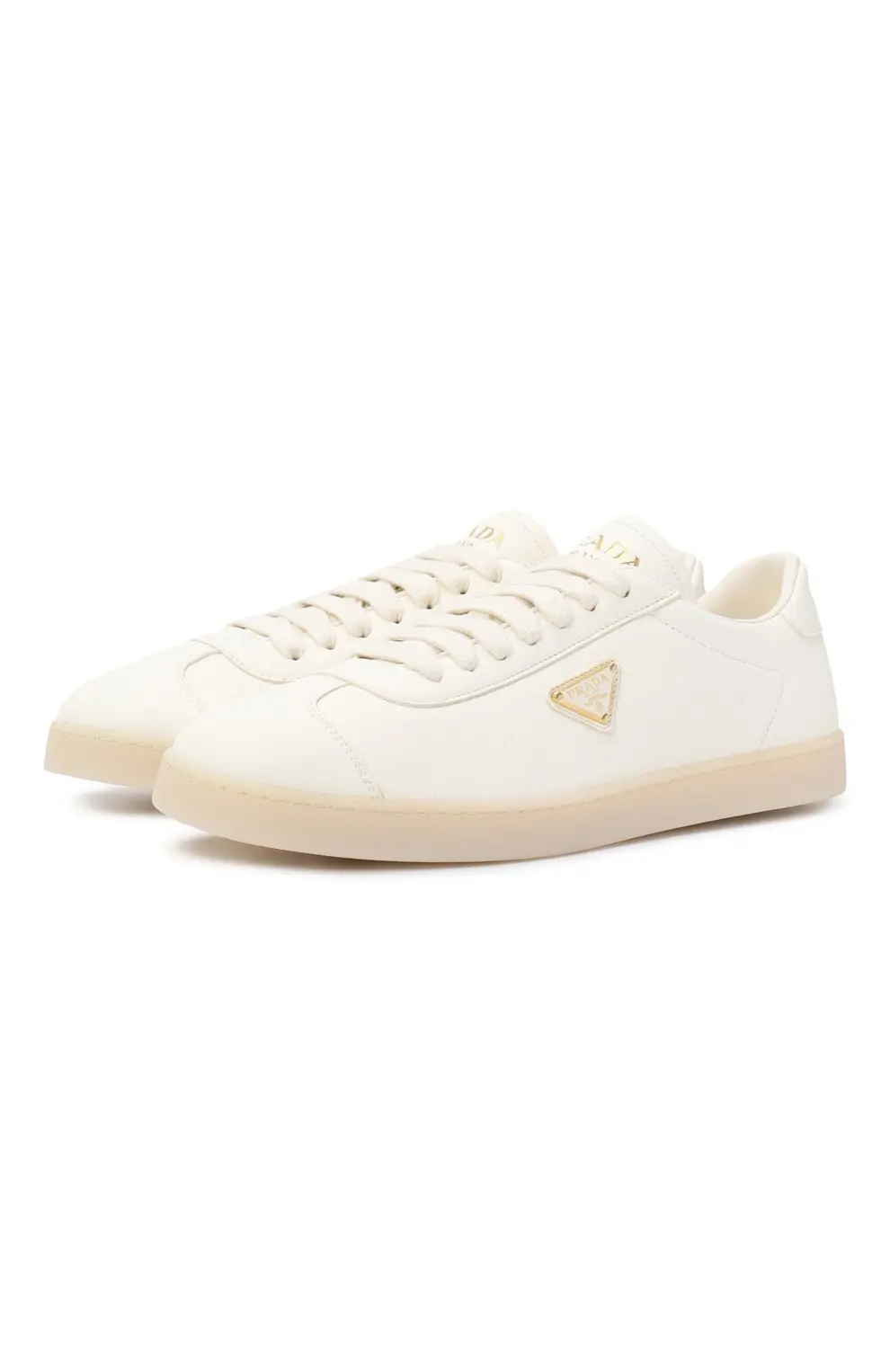 Кеды Lane Prada выполнены из мягкой матовой кожи цвета айвори. Минималистичный дизайн дополнен фирменным треугольным логотипом в золотистом оттенке и подошвой в тон. Лаконичная модель в духе итальянского минимализма, сочетающая комфорт и элегантность.