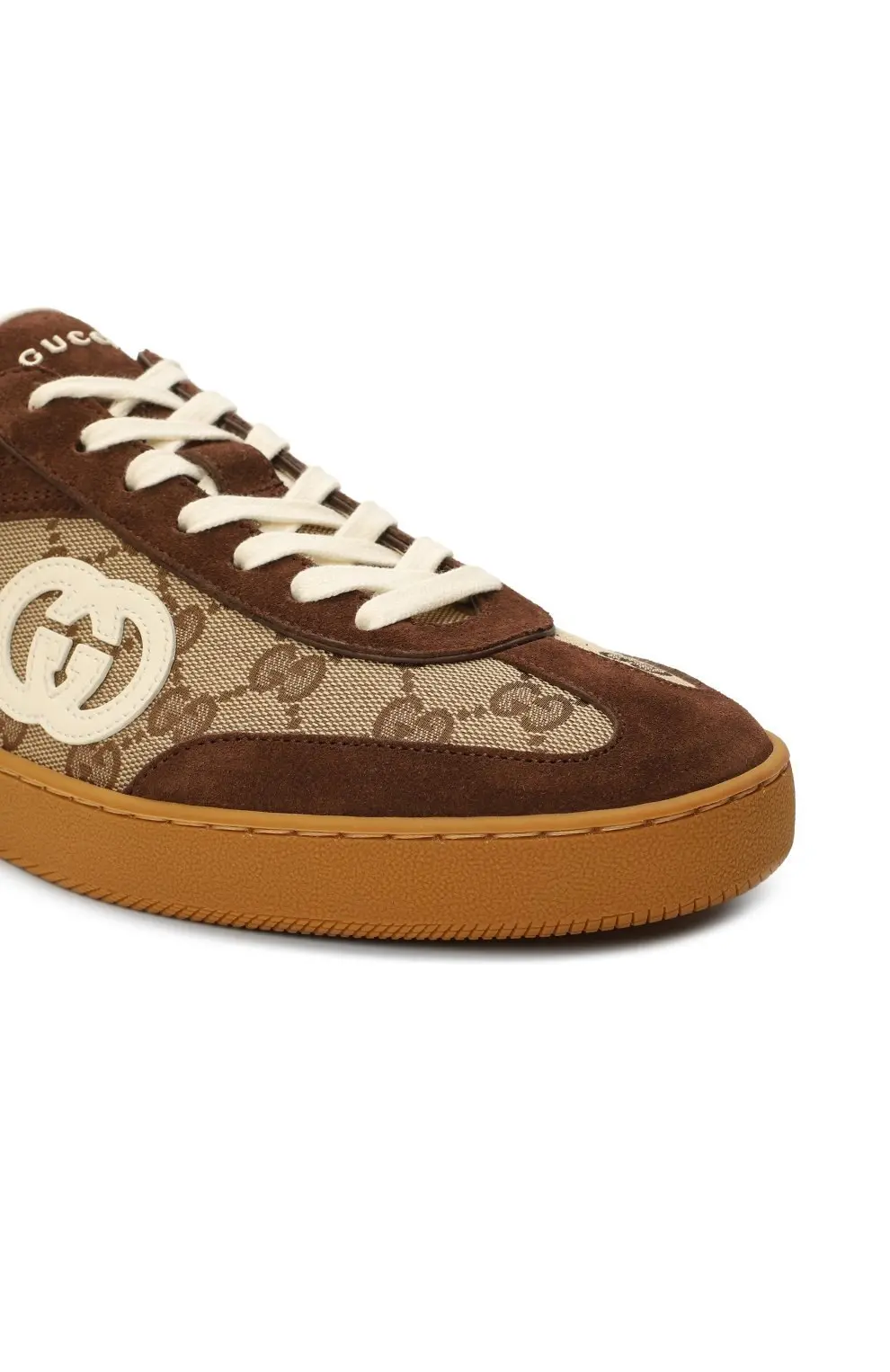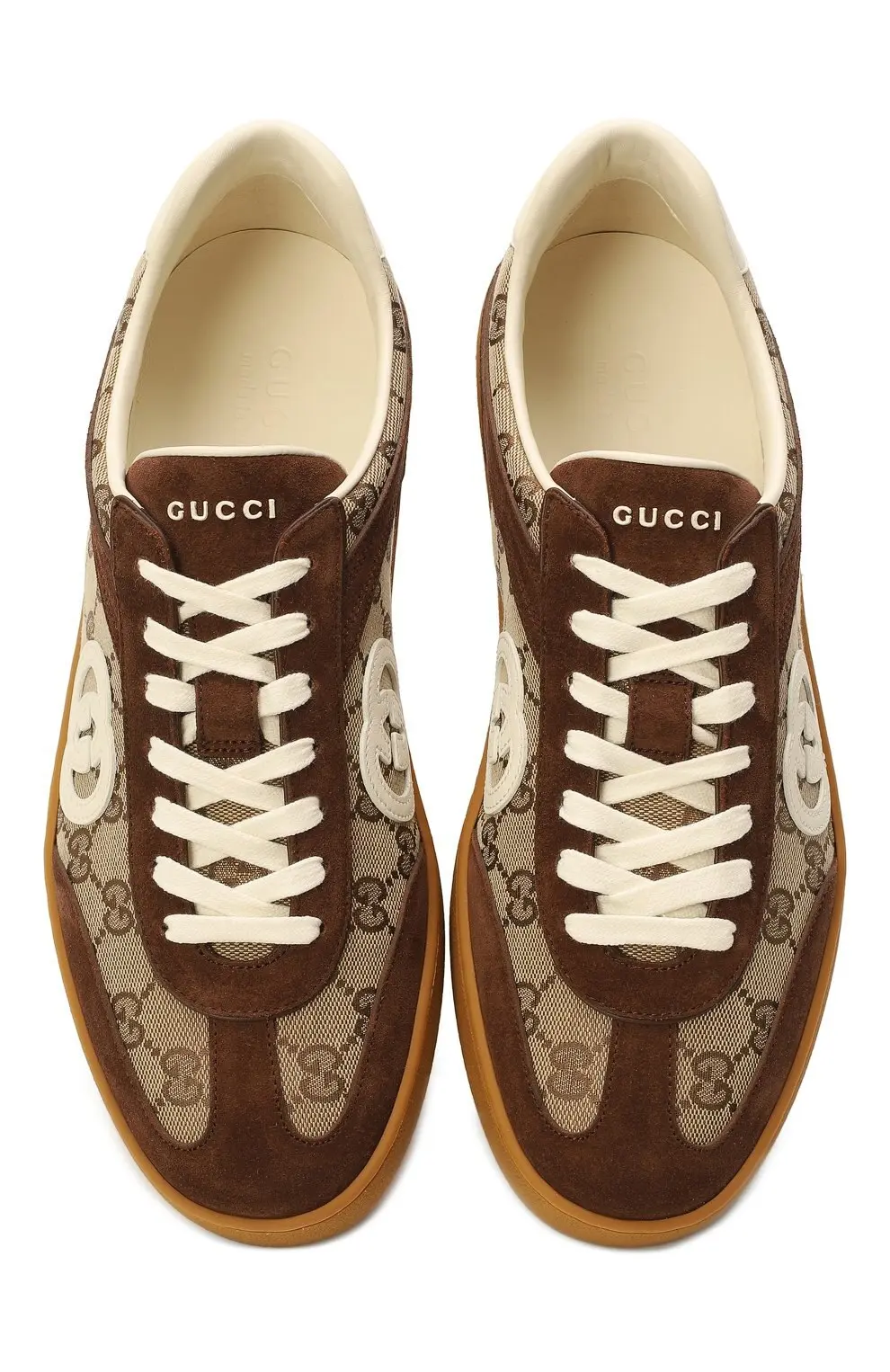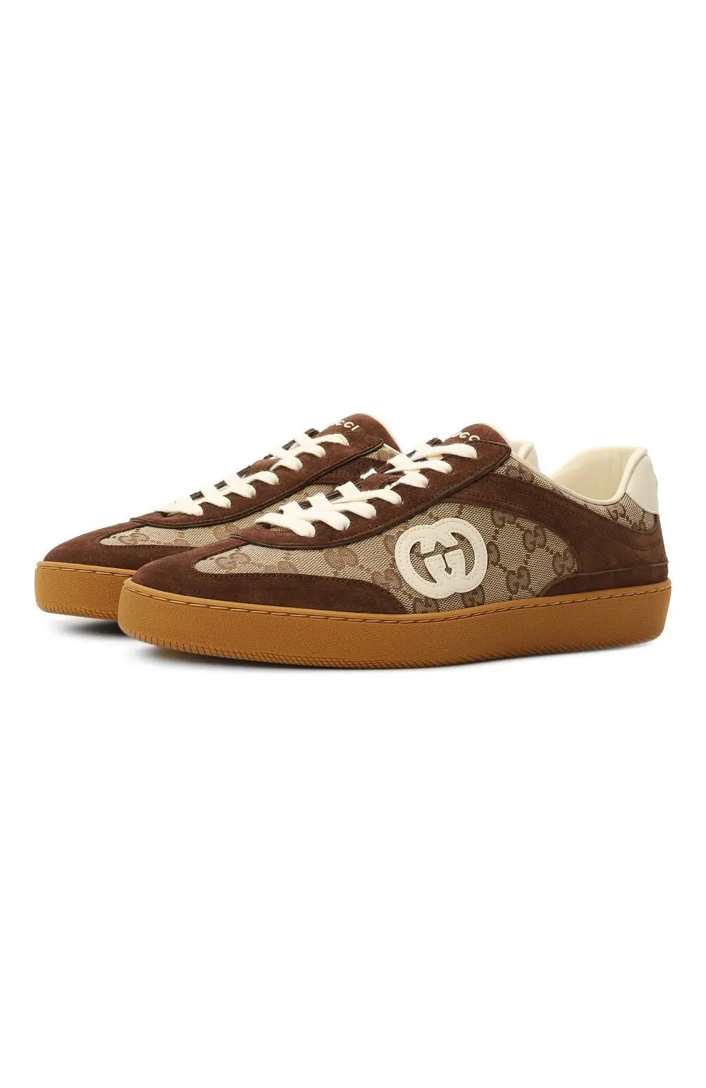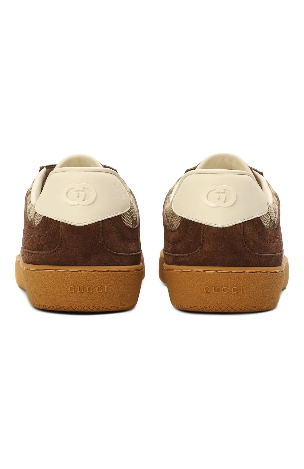 Кеды Gucci G75 в коричневых тонах с фирменным монограммным узором GG. Замшевые вставки и контрастная резиновая подошва придают модели винтажный характер. Стильная и удобная обувь для повседневного образа с акцентом на классику бренда.