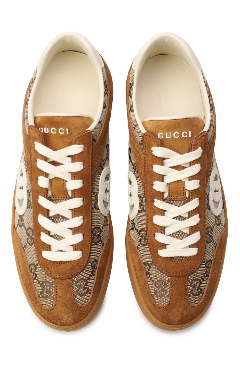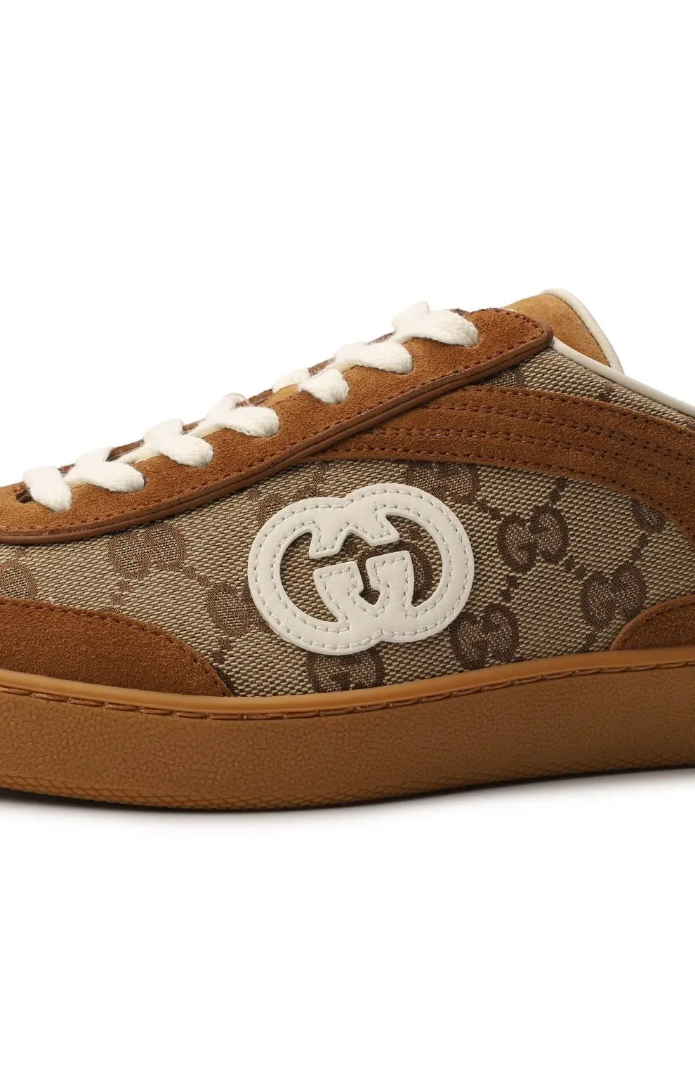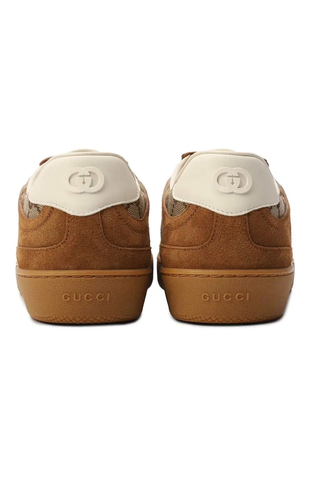Кеды Gucci G75 в светло-коричневом оттенке с фирменным монограммным узором GG. Замшевые вставки и контрастная резиновая подошва создают стильный ретро-образ. Универсальная модель, которая отлично подойдёт для повседневной носки.