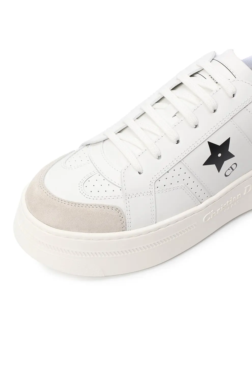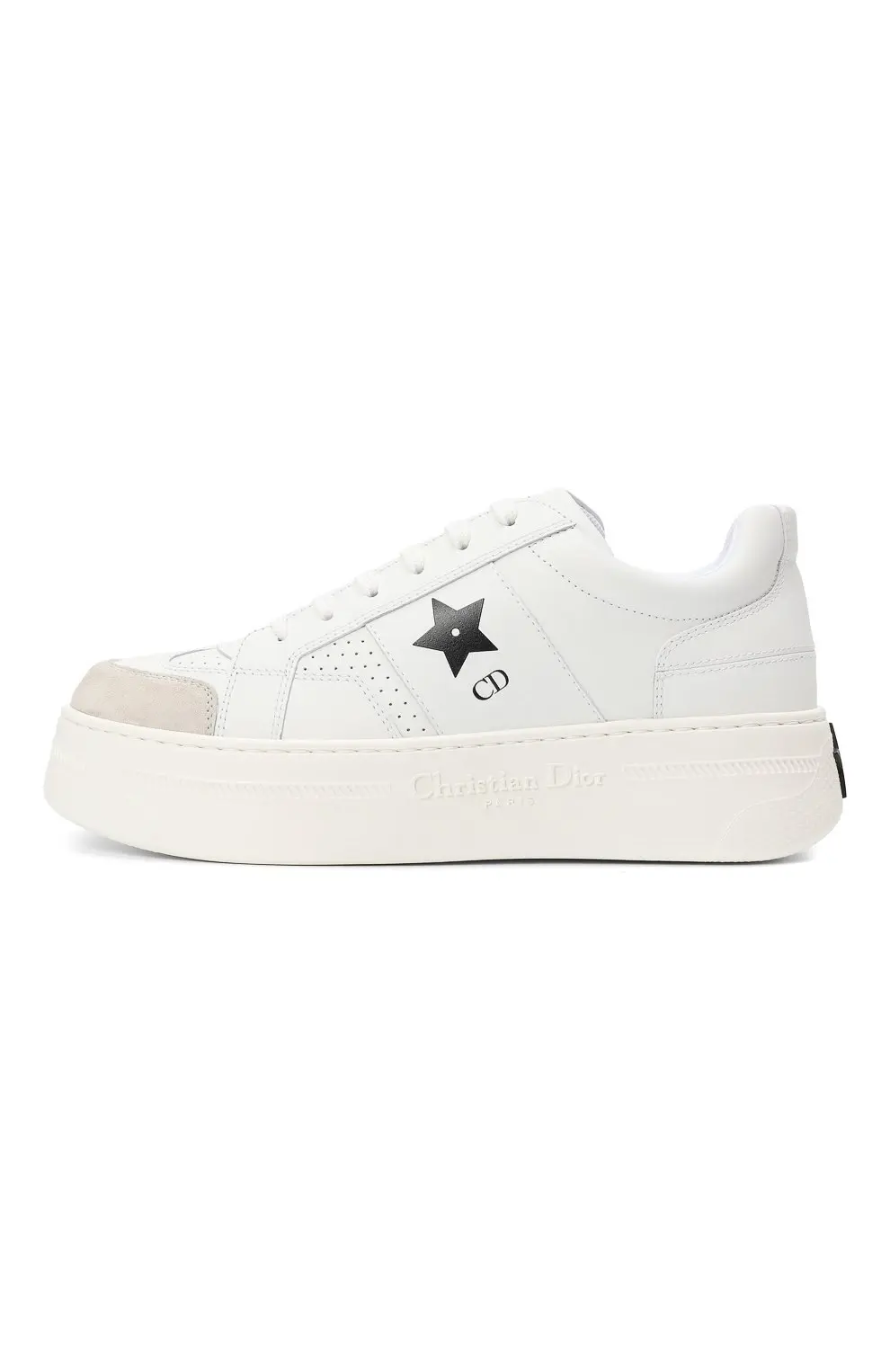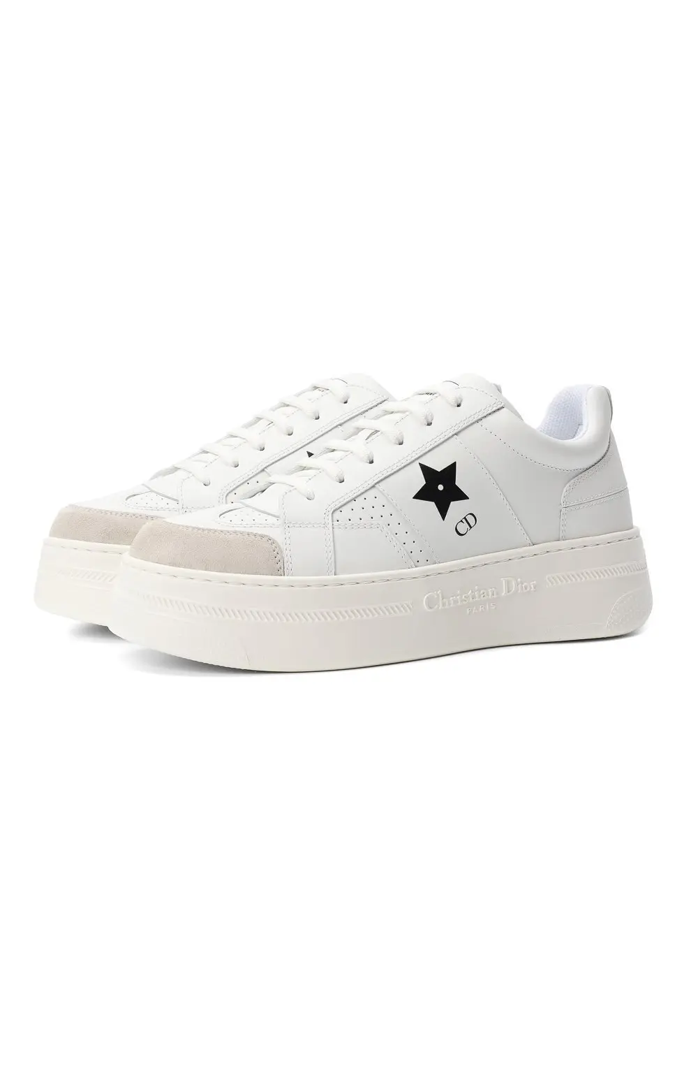 Кеды Dior Star выполнены из гладкой белой кожи и дополнены замшевой вставкой на мысе. Боковую часть украшает чёрная звезда с инициалами CD, а на массивной подошве тиснением нанесён логотип Christian Dior Paris. Дизайн сочетает минимализм и узнаваемые фирменные акценты, делая модель универсальной для повседневного стиля.