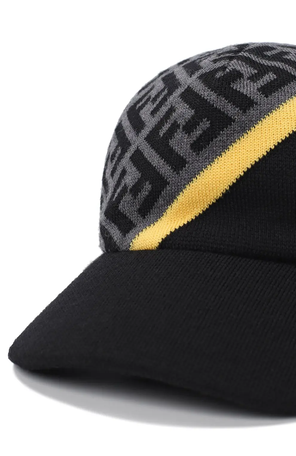 Шерстяная кепка от Fendi выполнена в чёрно-сером цвете с акцентной жёлтой полосой, которая придаёт модели динамичный характер. Декорирована культовым монограммным узором FF, создающим узнаваемый стиль бренда. Изготовленная из мягкой и тёплой шерсти, кепка сочетает комфорт и современный дизайн, идеально завершая повседневные и спортивные образы.