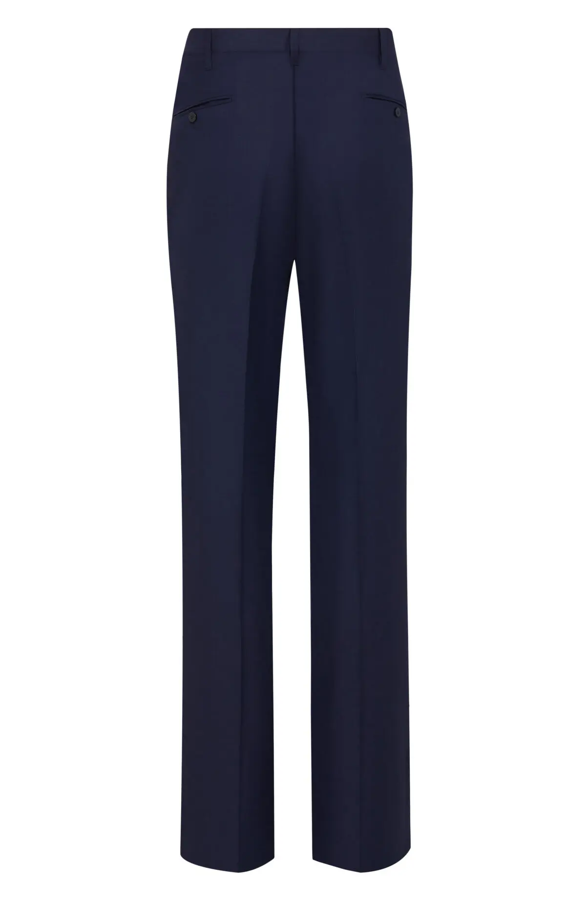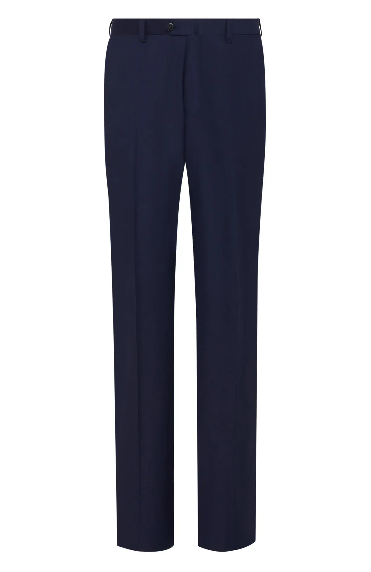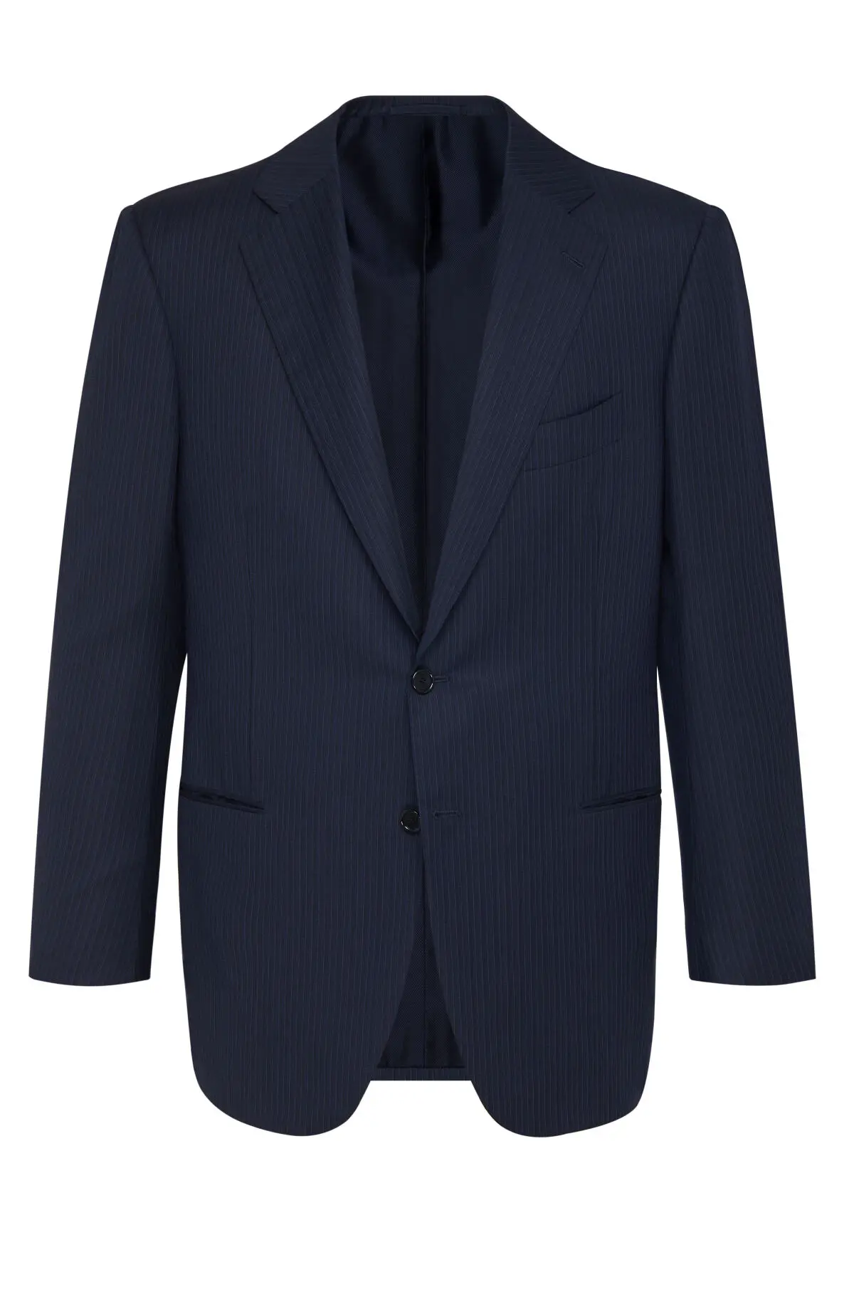 Классический костюм темно-синего оттенка выполнен из тонкой шерсти с едва заметной полоской. Однобортный пиджак с заостренными лацканами и прорезными карманами дополнен прямыми брюками со стрелками. Тщательная посадка подчеркивает силуэт и обеспечивает комфорт в течение всего дня. Лаконичный дизайн уместен как в деловом гардеробе, так и на торжественных мероприятиях.