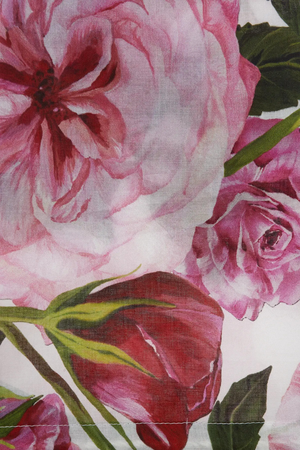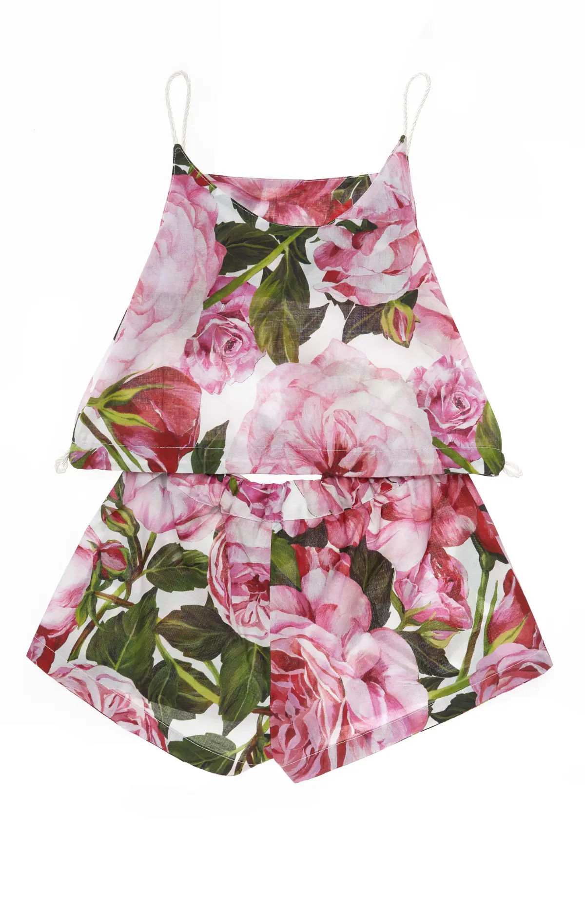 Костюм выполнен из лёгкой хлопковой ткани с гладкой текстурой, обеспечивающей комфорт в тёплую погоду. Яркий цветочный принт с розами создаёт выразительный акцент и придаёт образу свежесть и романтичность. Свободный крой топа на тонких бретелях и шорты с удобной посадкой обеспечивают свободу движений и лёгкость силуэта.