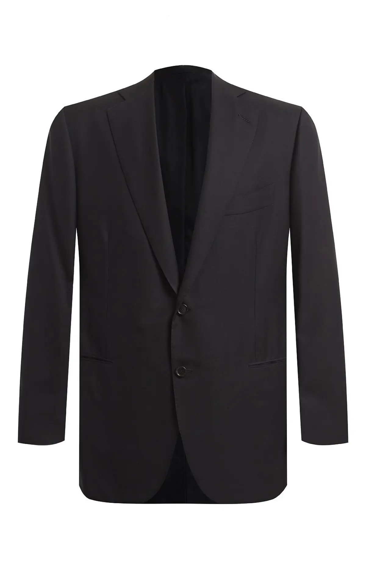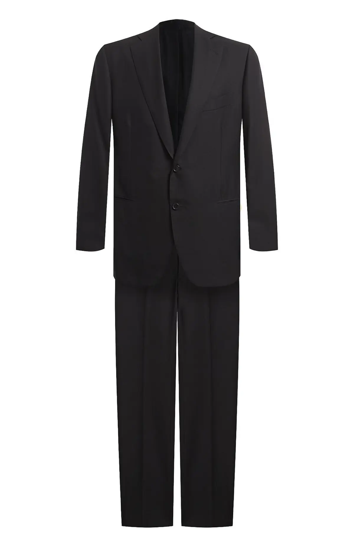 Классический костюм Cesare Attolini из высококачественной шерсти в элегантном черном цвете. Пиджак выполнен с утонченным кроем: строгий лацкан, два прорезных кармана с клапанами и нагрудный карман придают образу изысканность. Брюки прямого силуэта с четкой стрелкой завершают ансамбль, подчеркивая итальянскую традицию безупречного пошива. Лаконичный дизайн и благородная ткань делают костюм универсальным выбором для деловых встреч, официальных мероприятий и особых случаев.