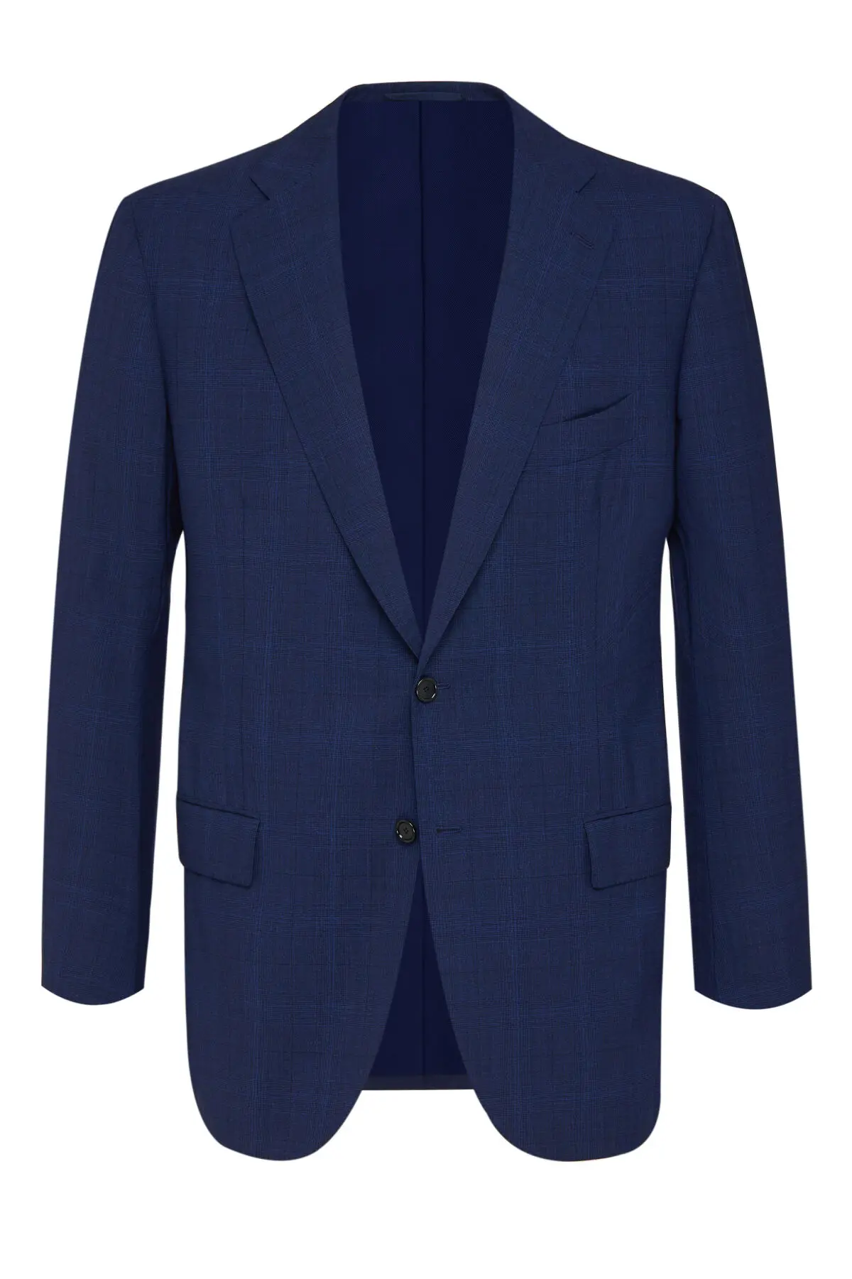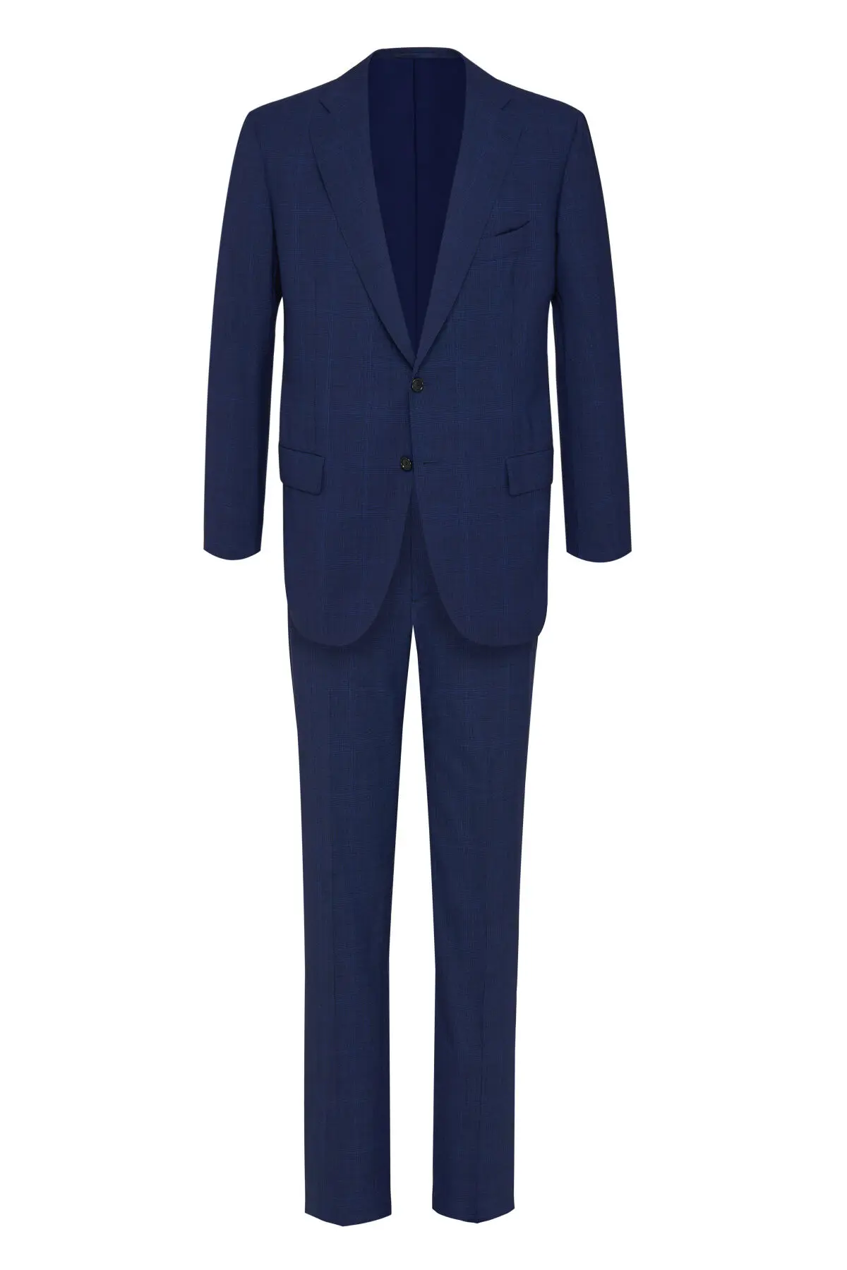 Костюм Cesare Attolini выполнен в благородном синем оттенке с едва заметным перекрестным рисунком, придающим ткани глубину и фактуру. Однобортный пиджак с классическими лацканами и клапанами карманов сочетается с прямыми брюками со стрелками, формируя вытянутый силуэт. Лаконичный дизайн делает модель универсальным вариантом для деловых встреч и торжественных мероприятий.
