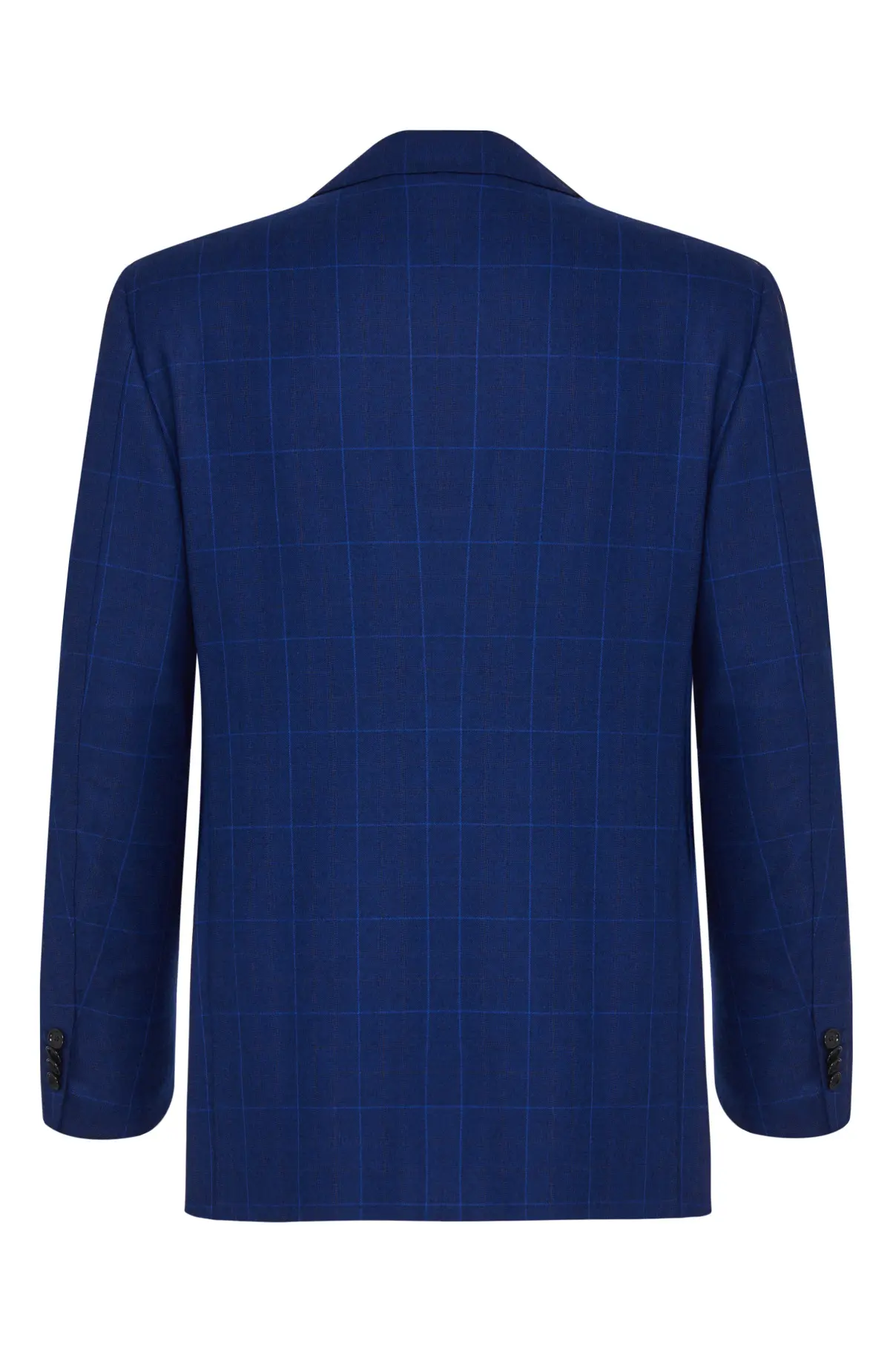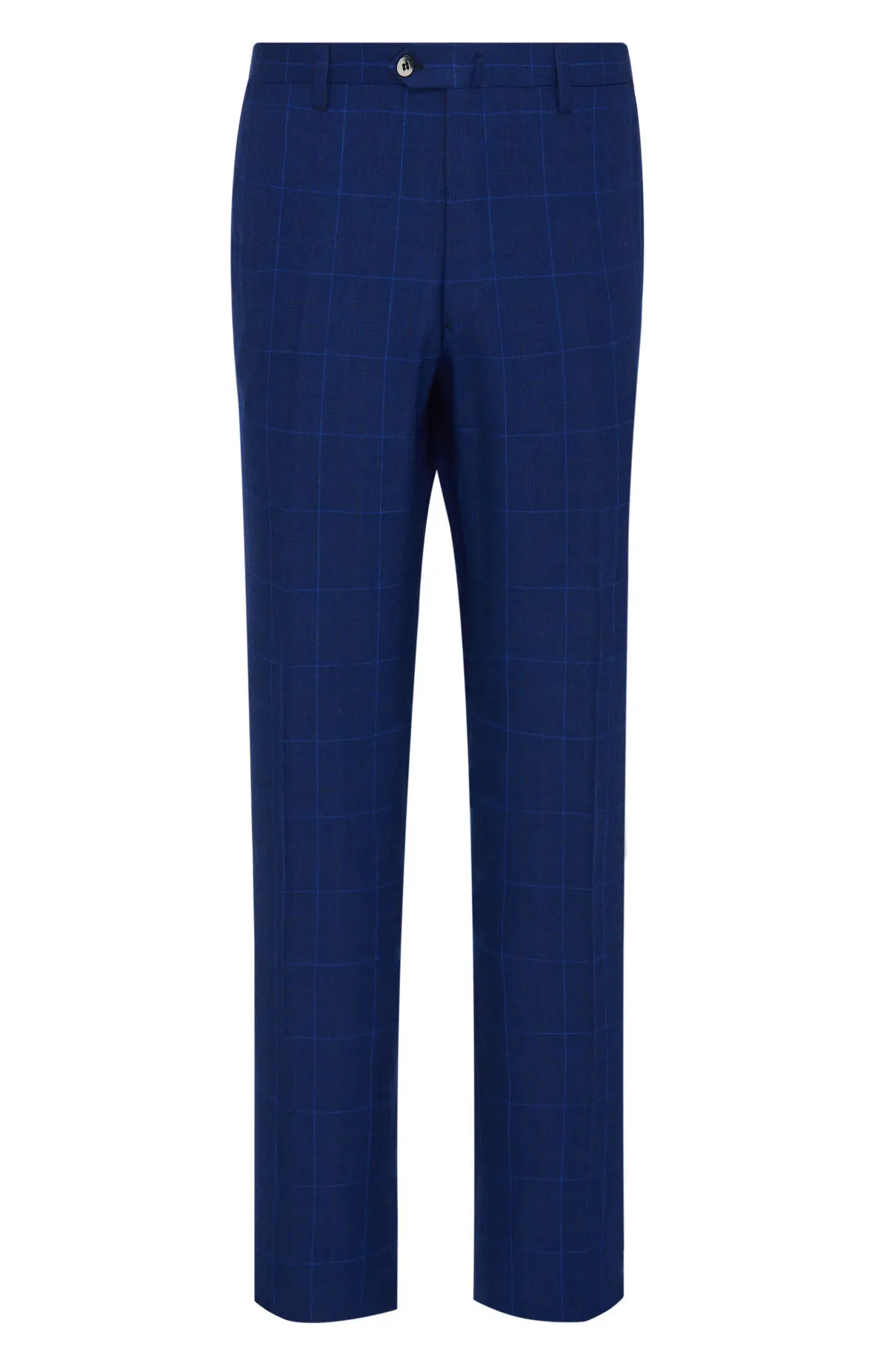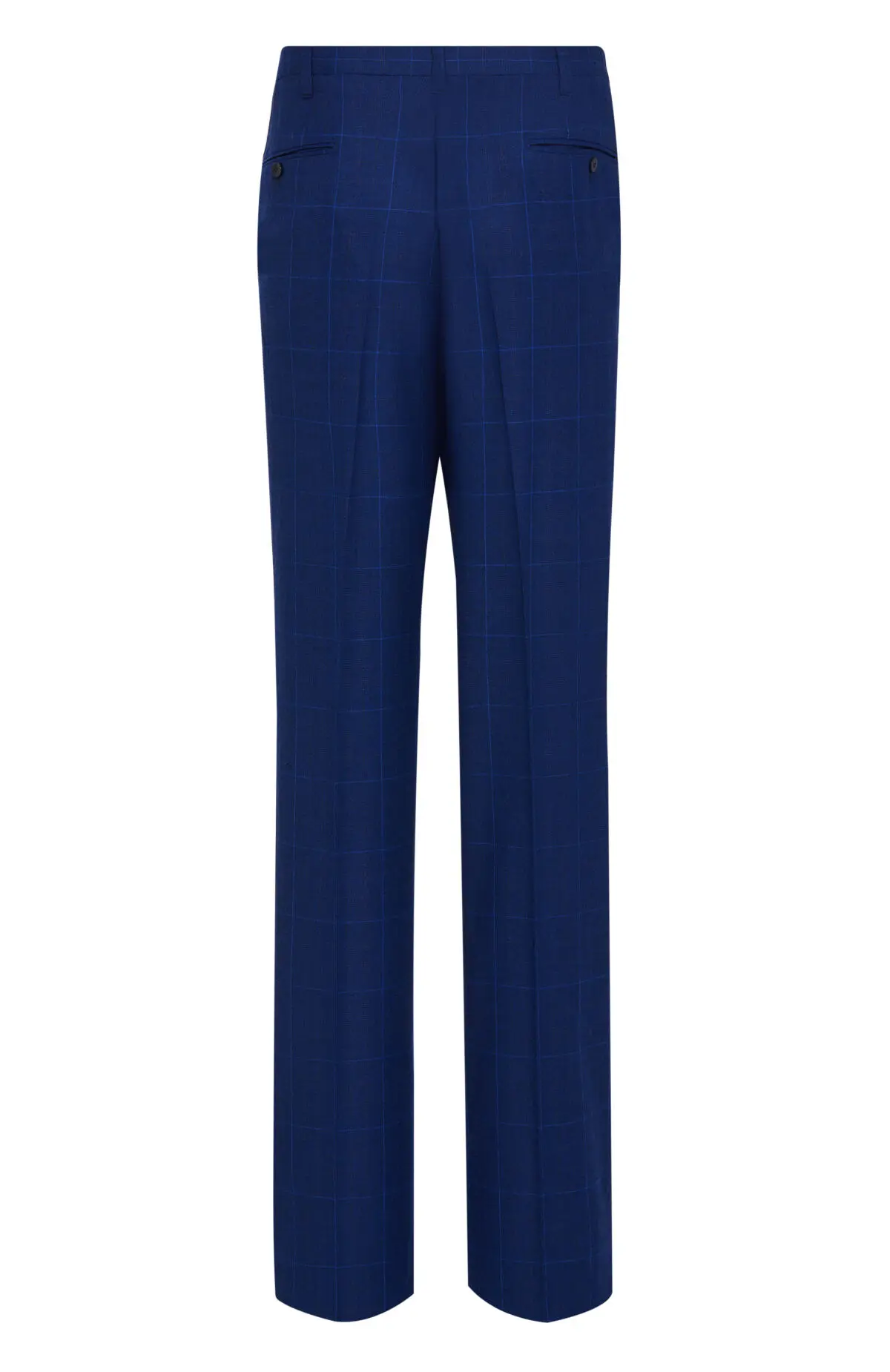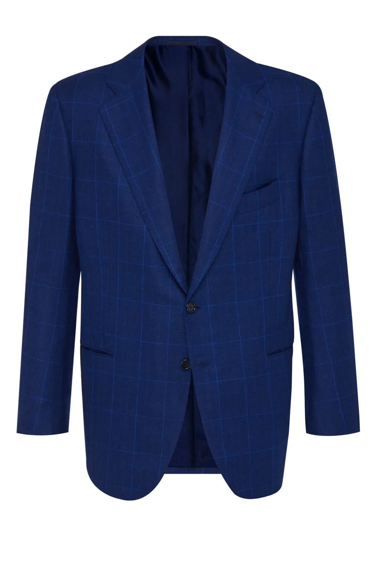 Костюм насыщенного синего оттенка с крупной клеткой выполнен из тонкой шерсти. Однобортный пиджак с заостренными лацканами и прорезными карманами дополнен прямыми брюками со стрелками. Тщательная посадка подчеркивает силуэт и обеспечивает комфорт в течение дня. Модель подойдет для деловых встреч и торжественных мероприятий.