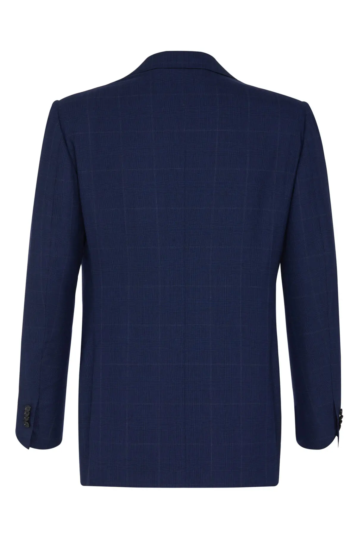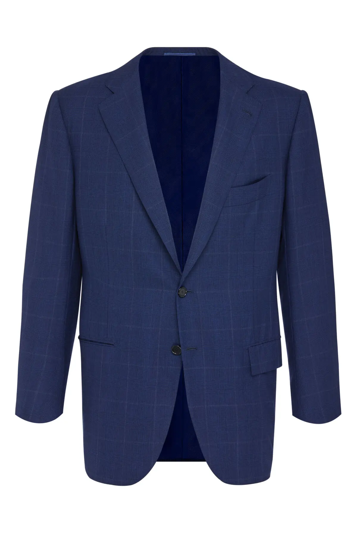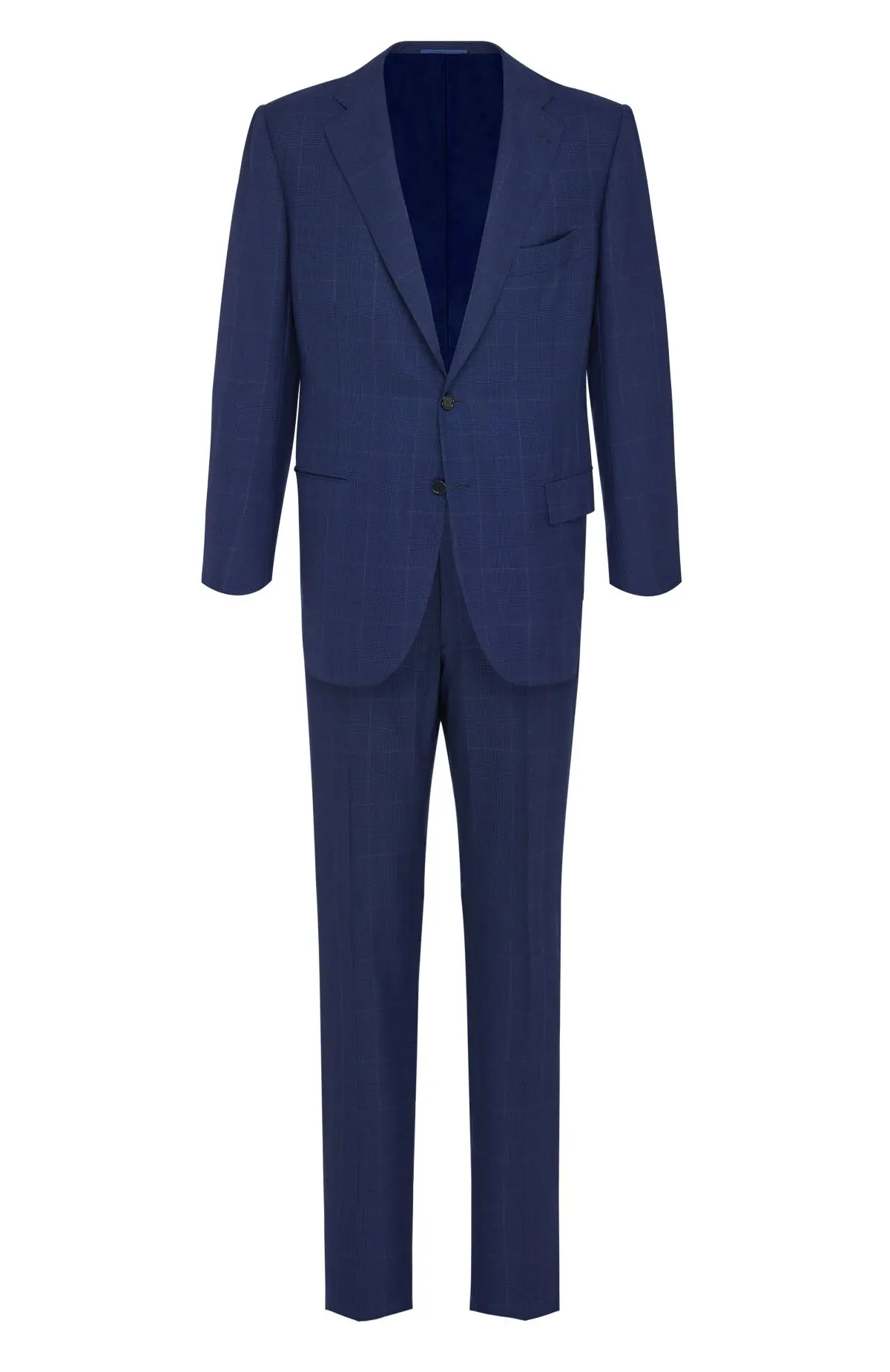 Однобортный костюм насыщенного синего цвета выполнен из тонкой шерсти и украшен едва заметным геометричным рисунком, который придает ткани глубину и делает образ более динамичным. Пиджак с мягкой линией плеч, широкими лацканами и аккуратными накладными карманами сочетается с прямыми брюками со стрелками, формируя стройный силуэт. Универсальная модель уместна как в офисе, так и на торжественных мероприятиях в паре с хлопковой сорочкой и классическими дерби.