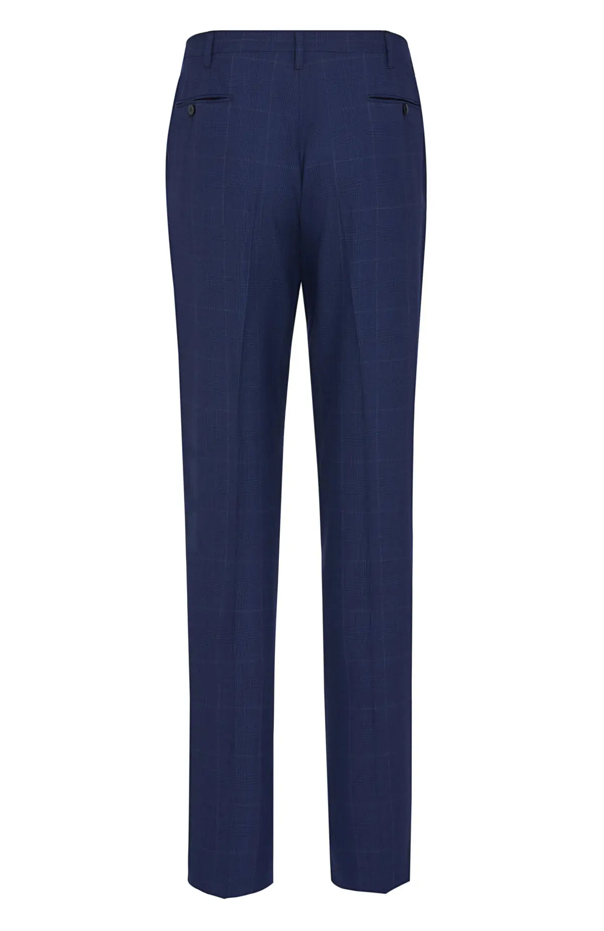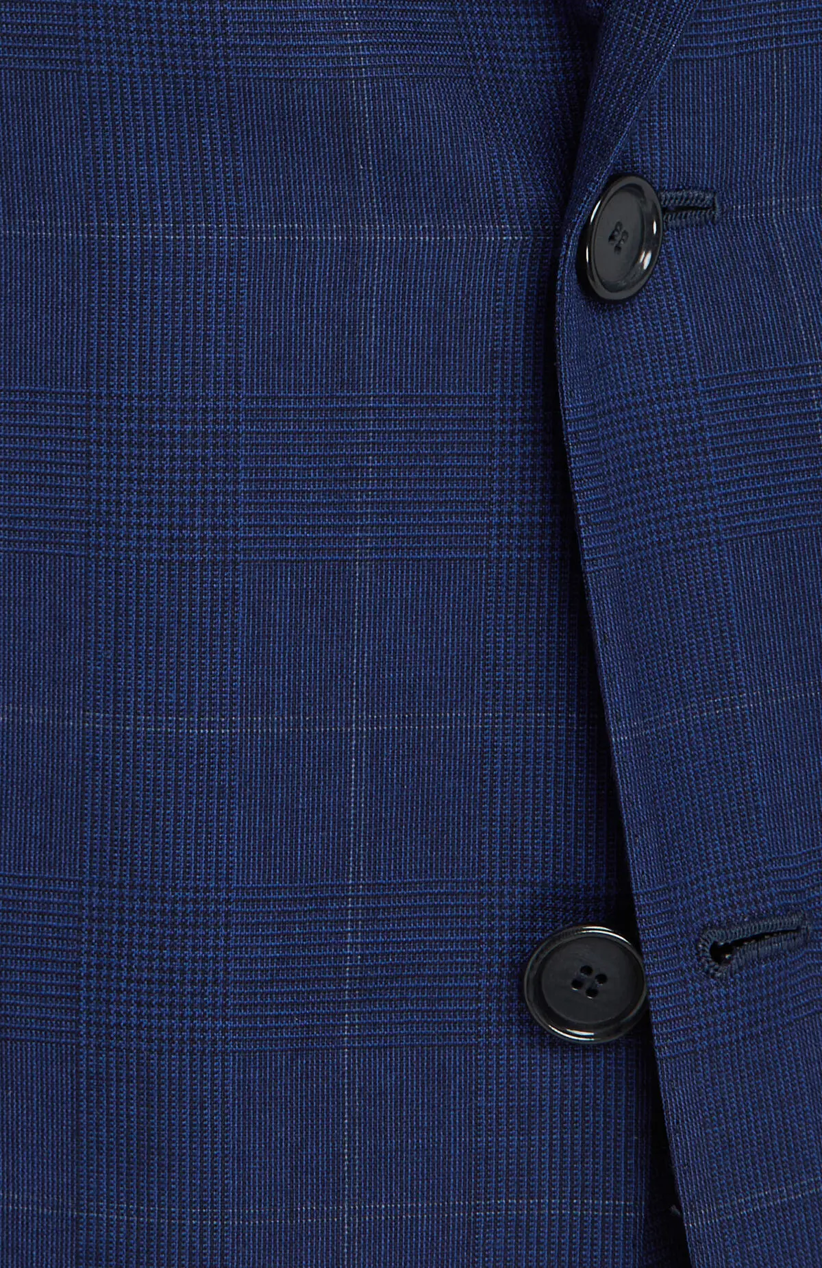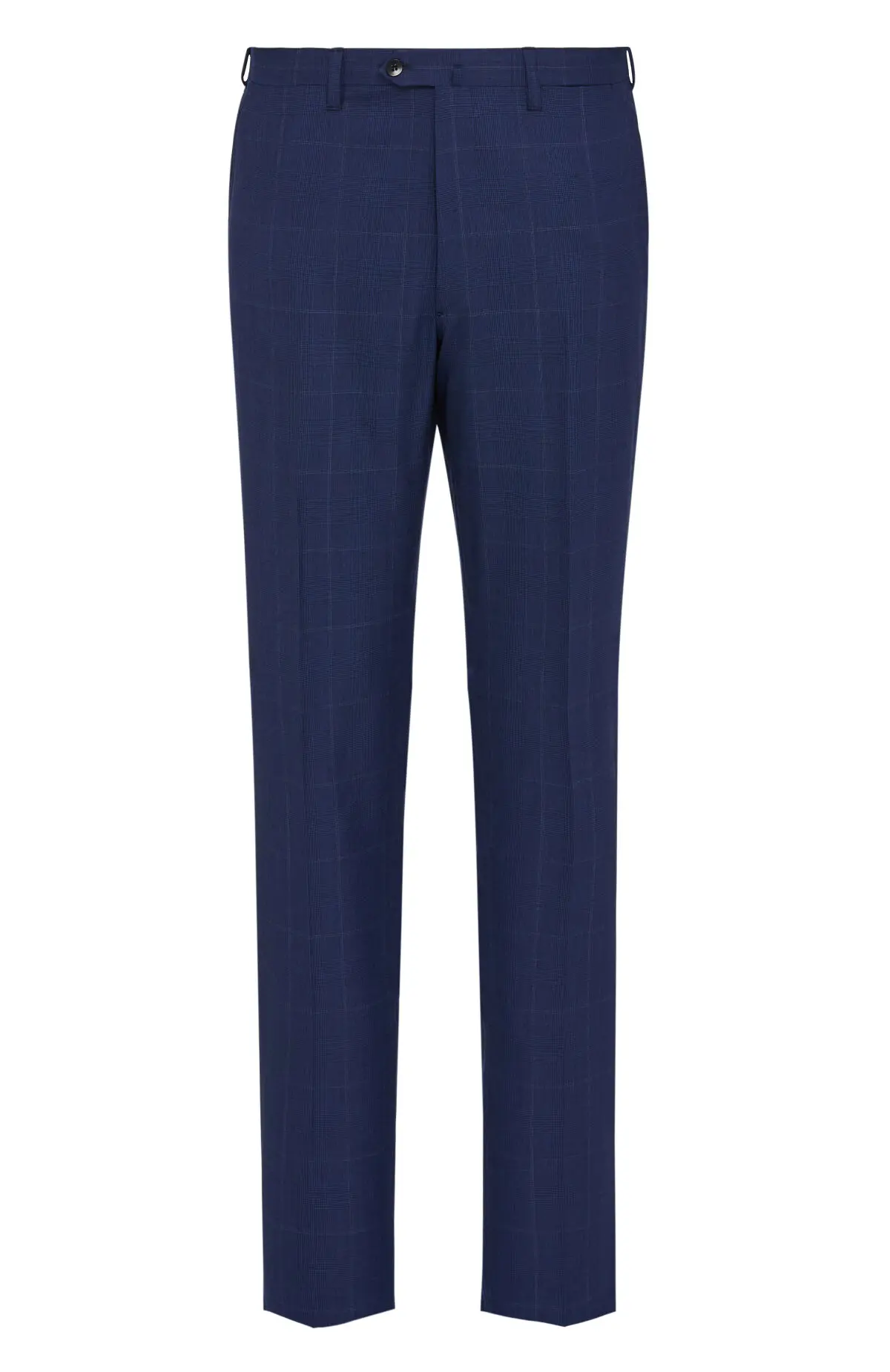 Однобортный костюм насыщенного синего цвета выполнен из тонкой шерсти и украшен едва заметным геометричным рисунком, который придает ткани глубину и делает образ более динамичным. Пиджак с мягкой линией плеч, широкими лацканами и аккуратными накладными карманами сочетается с прямыми брюками со стрелками, формируя стройный силуэт. Универсальная модель уместна как в офисе, так и на торжественных мероприятиях в паре с хлопковой сорочкой и классическими дерби.