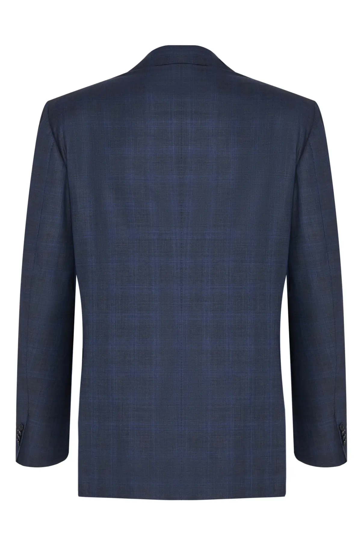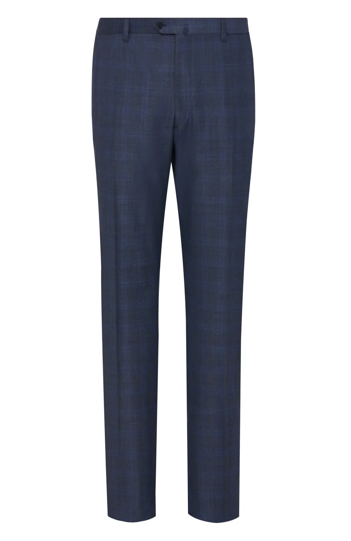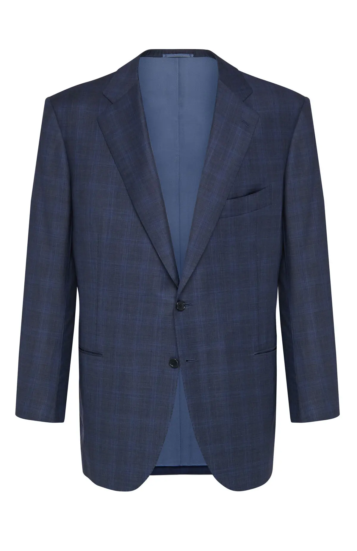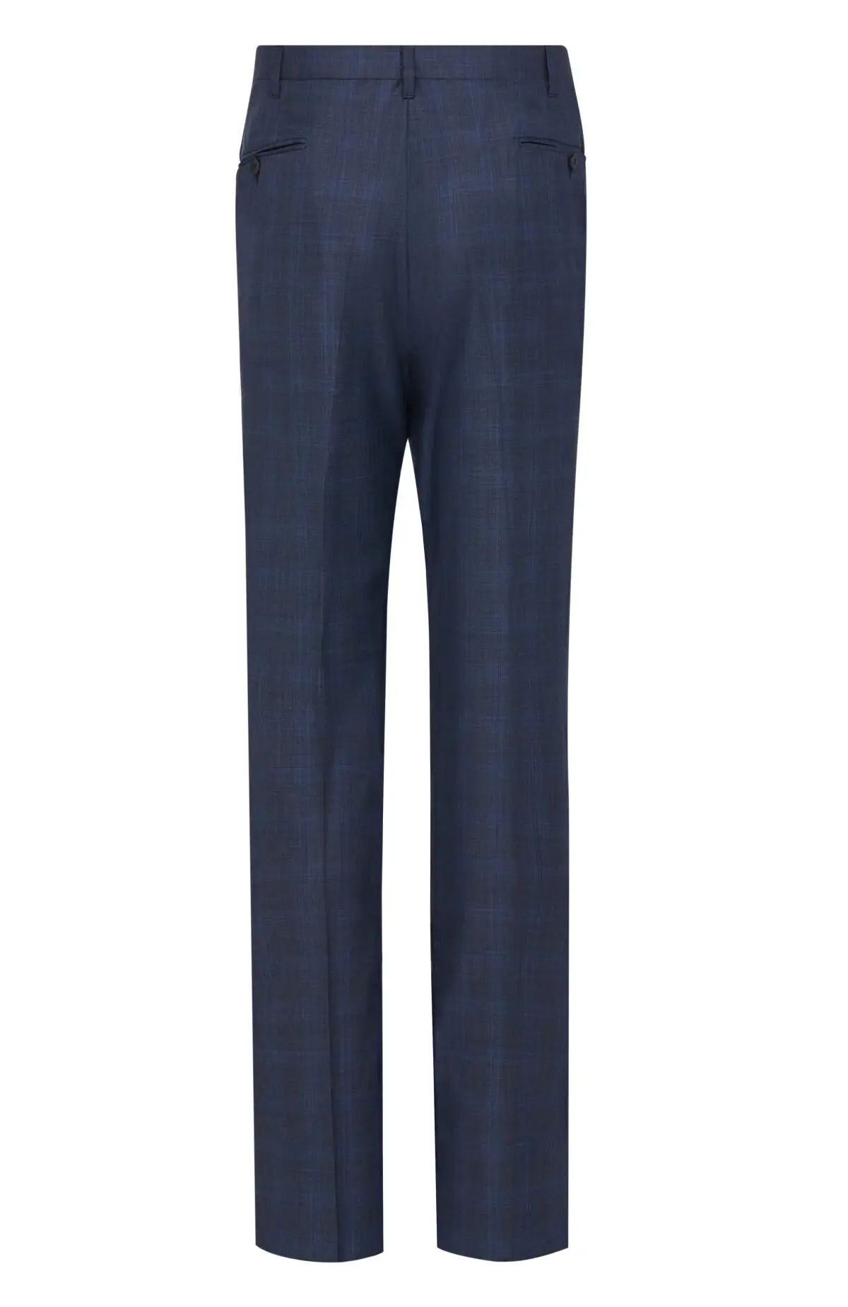 Костюм темно-синего оттенка с клетчатым рисунком выполнен из тонкой шерсти. Однобортный пиджак с классическими лацканами и прорезными карманами дополняют прямые брюки со стрелками. Тщательная посадка подчеркивает силуэт и обеспечивает комфорт в течение дня. Модель уместна как в деловом гардеробе, так и на торжественных мероприятиях.
