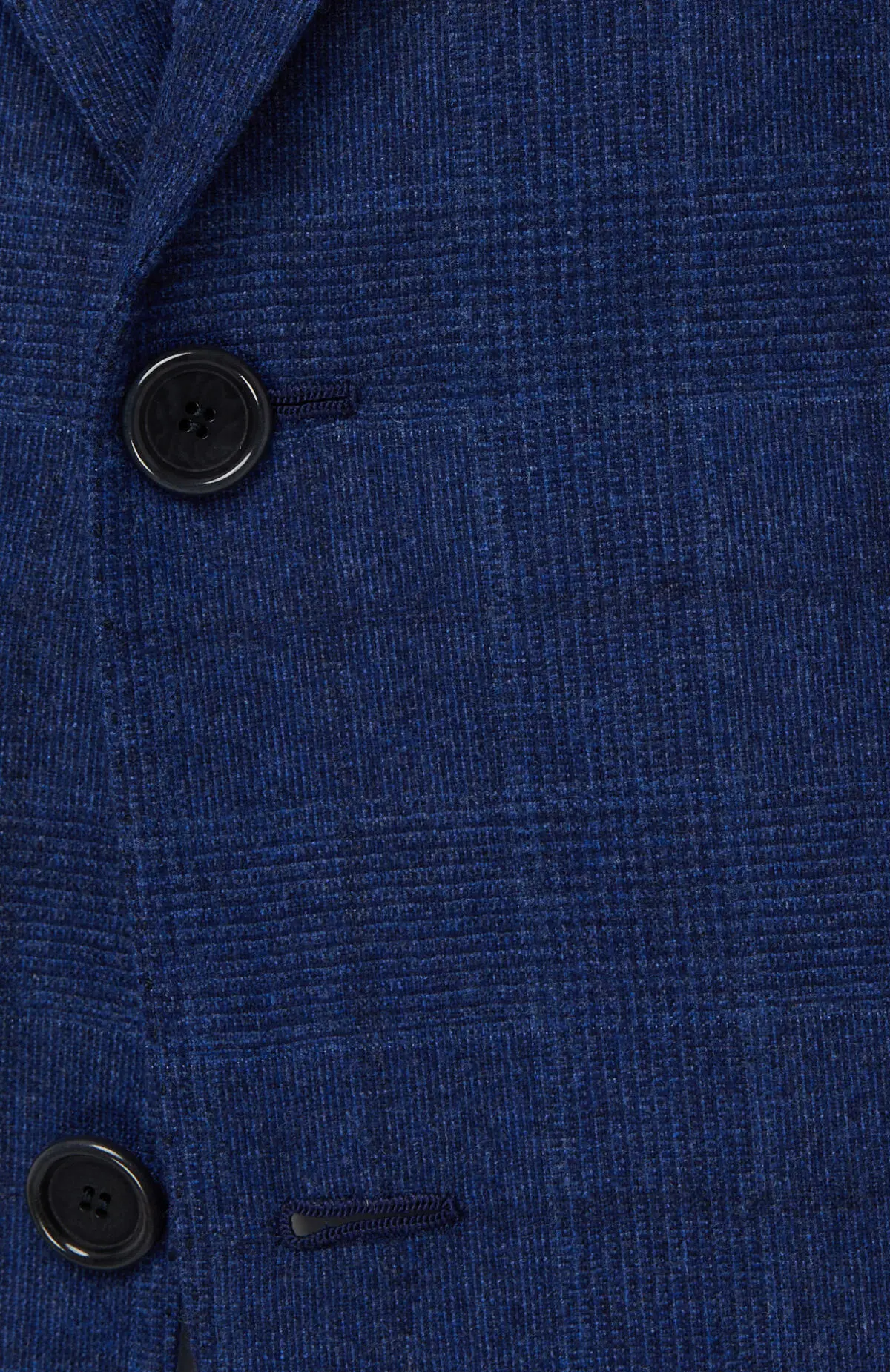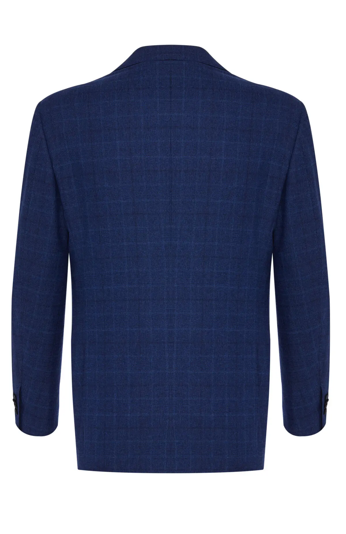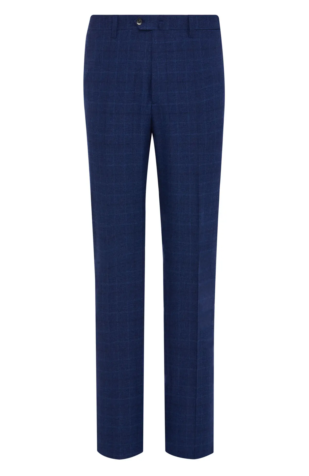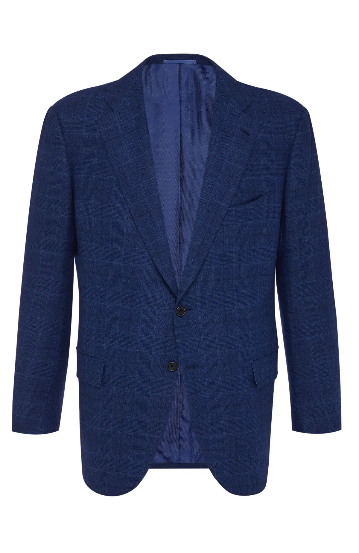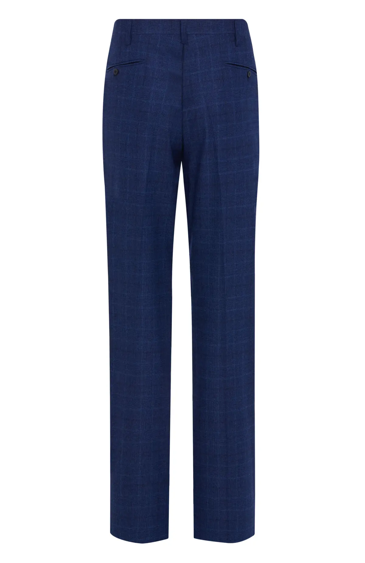 Костюм из тонкой шерсти выдержан в благородном синем оттенке и украшен деликатным клетчатым рисунком. Приталенный однобортный пиджак с заостренными лацканами и клапанами карманов сочетается с прямыми классическими брюками, формируя стройный силуэт. Лаконичный дизайн и спокойная гамма делают модель универсальным выбором для делового гардероба и торжественных случаев.