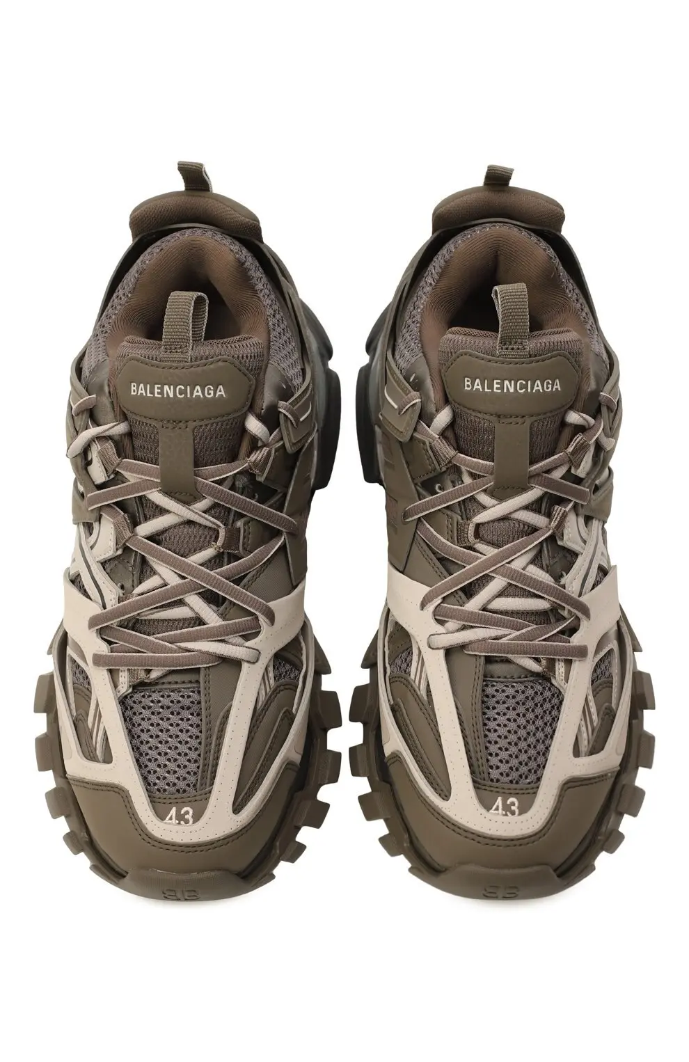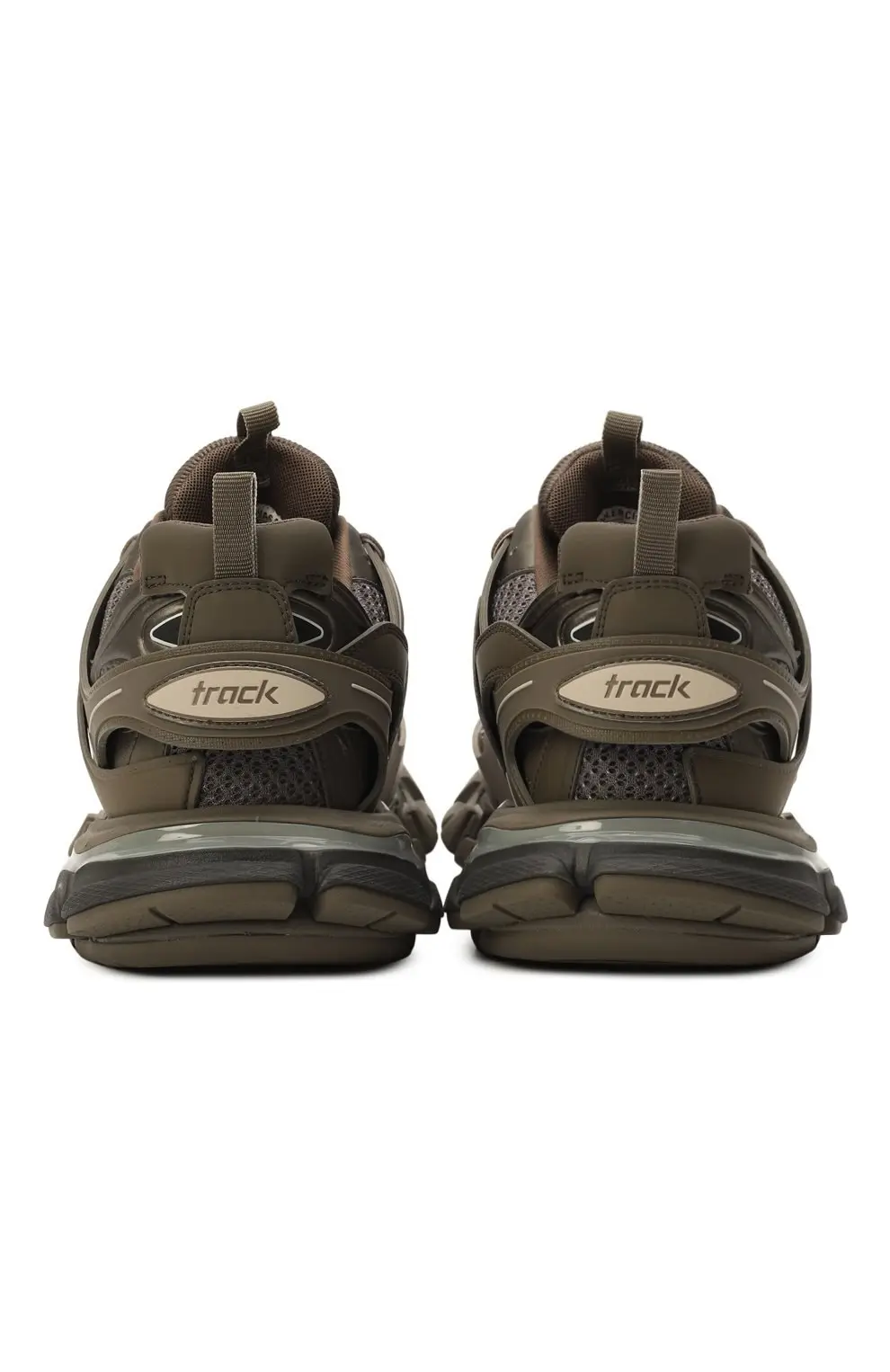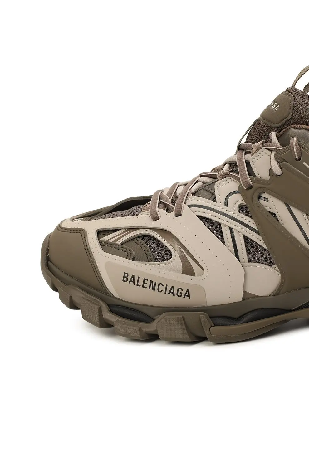 Кроссовки Track Balenciaga в бежево-оливковом цвете выполнены в многослойном дизайне из сетчатого текстиля и резиновых накладок. Массивная подошва с рельефным протектором обеспечивает устойчивость и комфорт. Логотип бренда выделен на боковой части, подчеркивая характерный стиль Balenciaga.