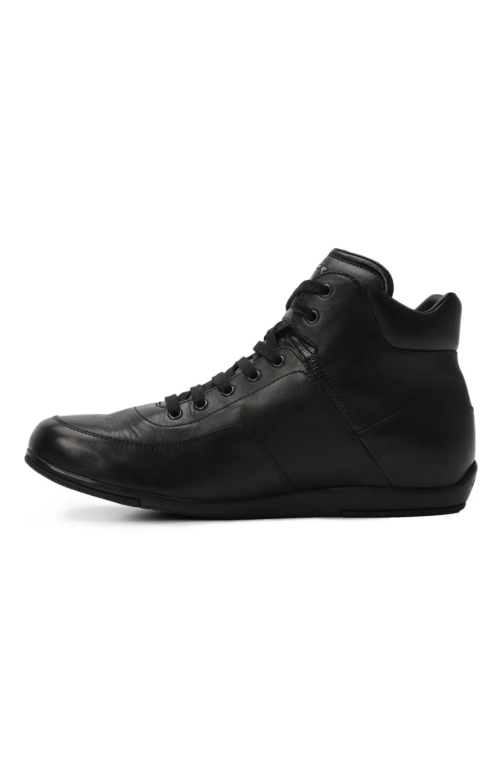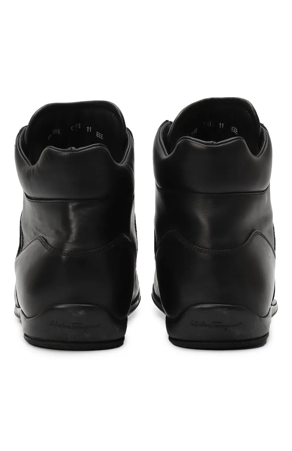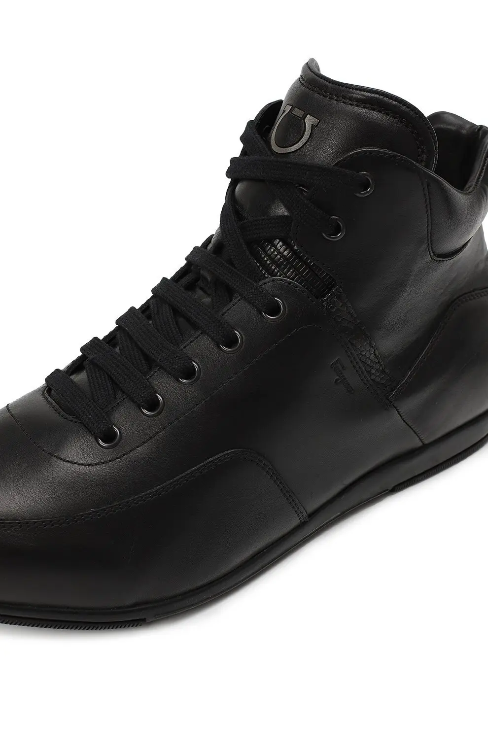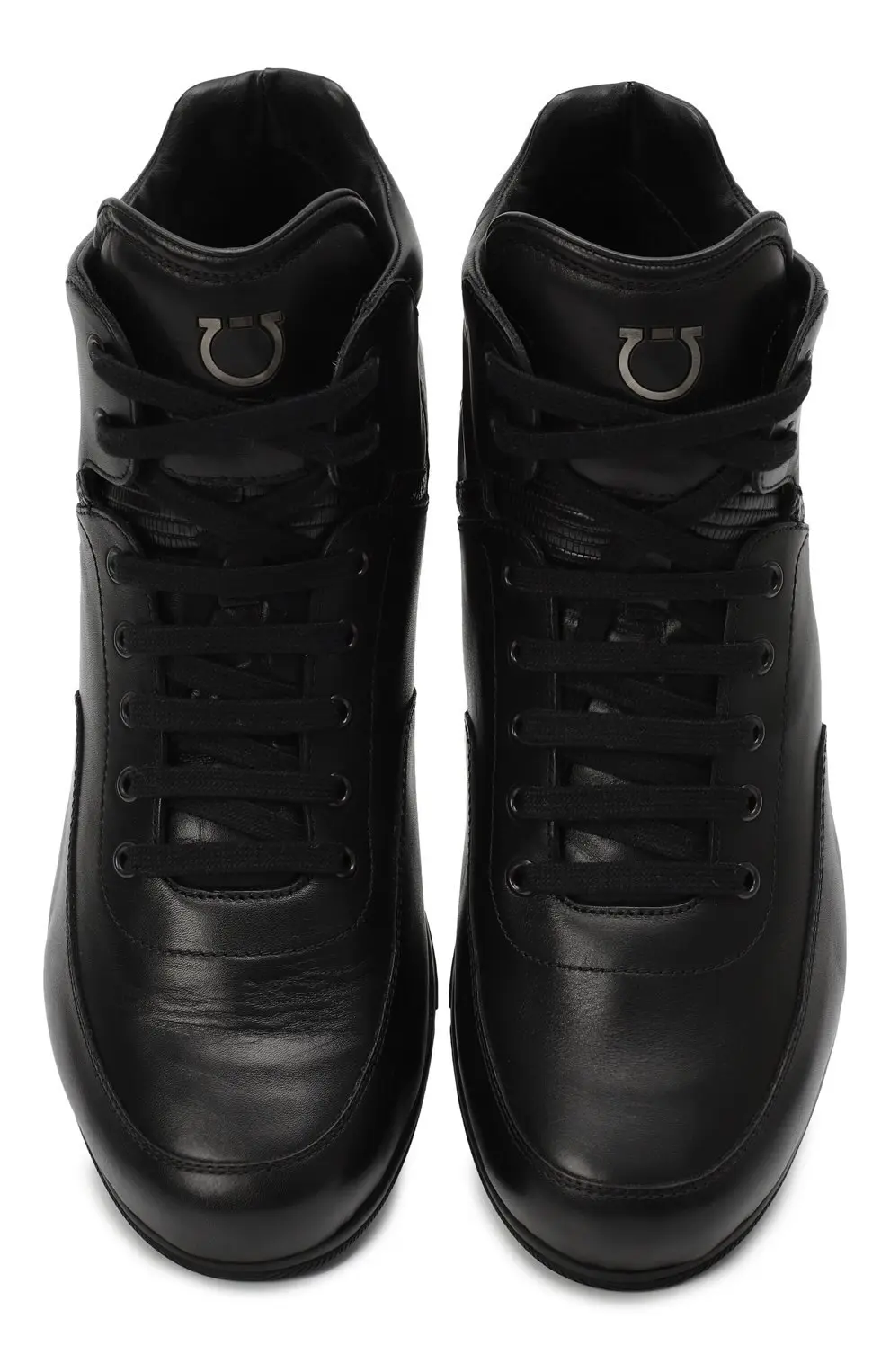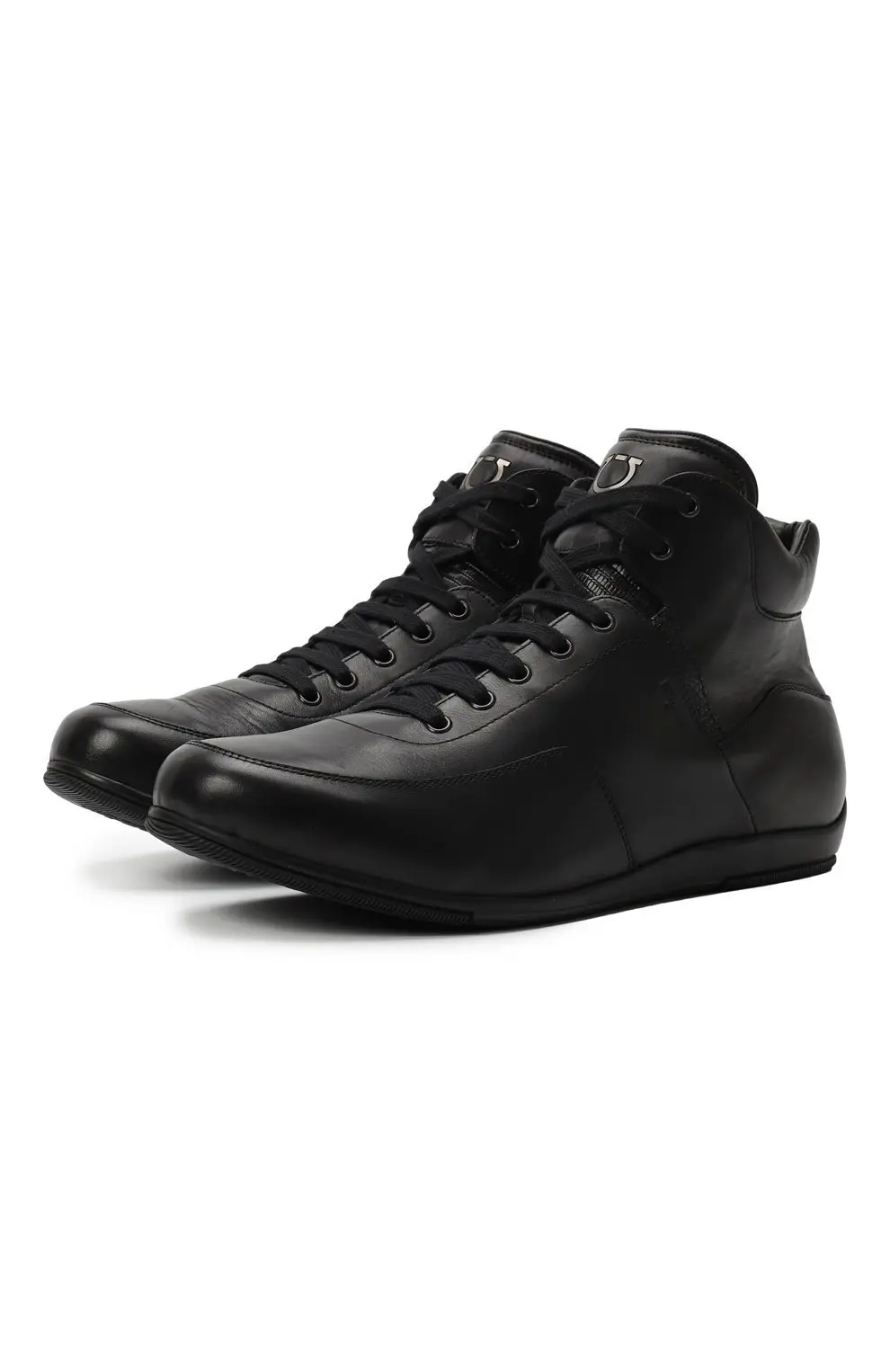 Кеды Salvatore Ferragamo выполнены из гладкой чёрной кожи и оформлены в лаконичном минималистичном стиле. Высокий силуэт с шнуровкой и мягким воротником обеспечивает удобную посадку, а металлический логотип бренда на язычке добавляет фирменный акцент. Лёгкая подошва делает модель комфортной для повседневной носки.