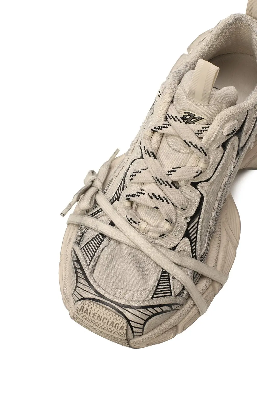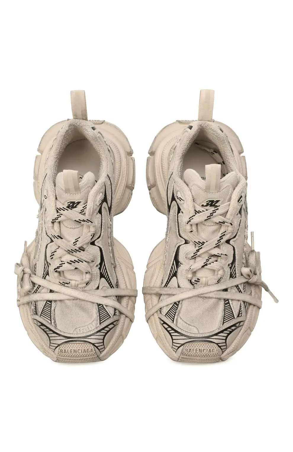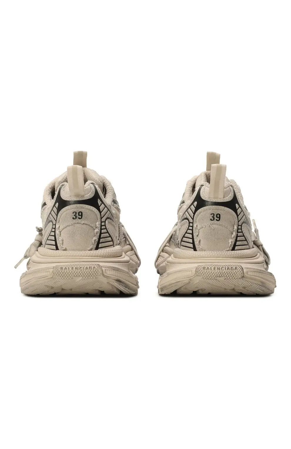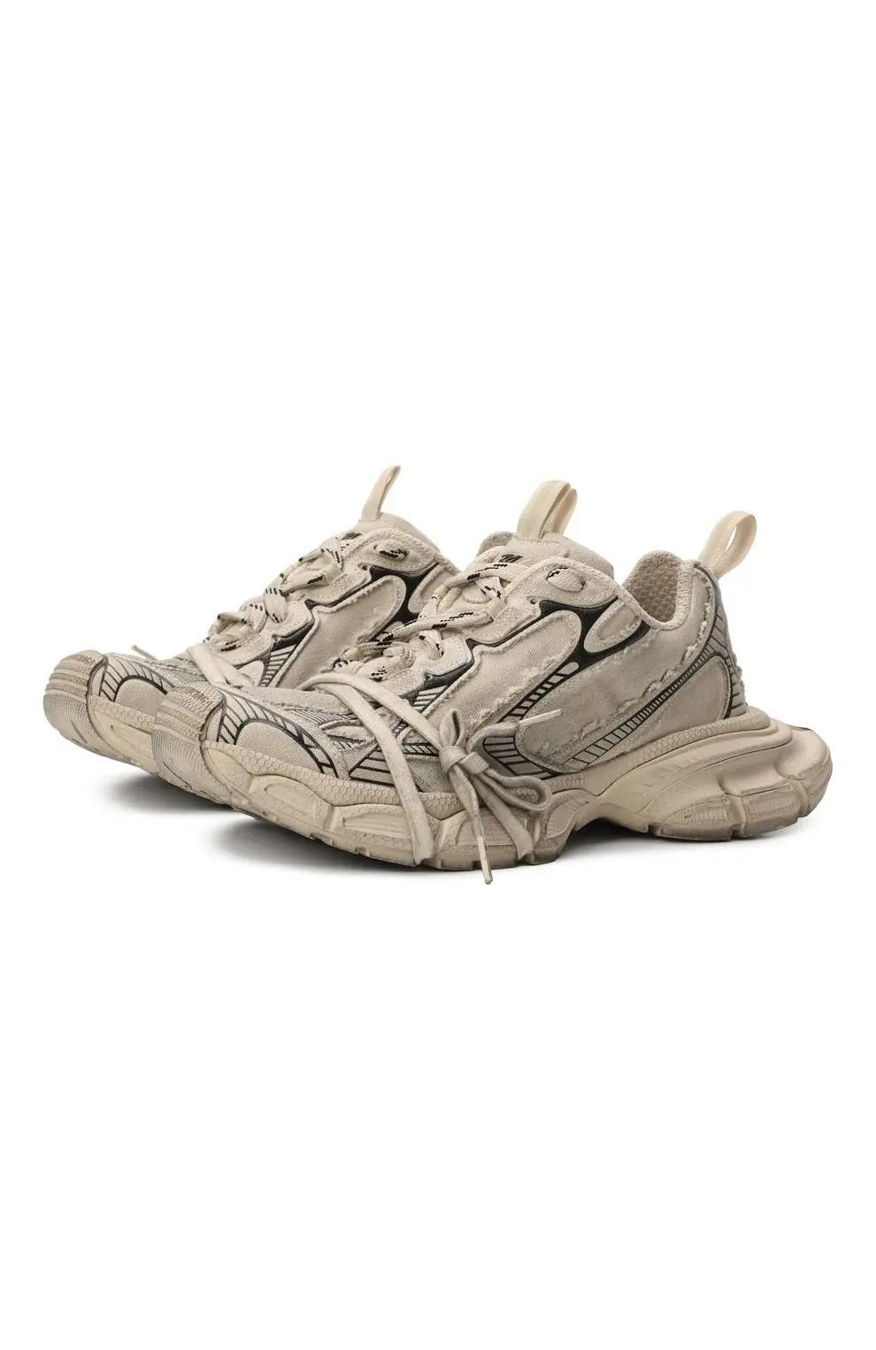 Кроссовки Track Balenciaga выполнены в бежевом цвете с эффектом потертости, подчеркивающим винтажный стиль бренда. Сложная многослойная конструкция и массивная подошва обеспечивают комфорт и устойчивость. Характерный дизайн с переплетением деталей делает модель выразительной и легко узнаваемой.