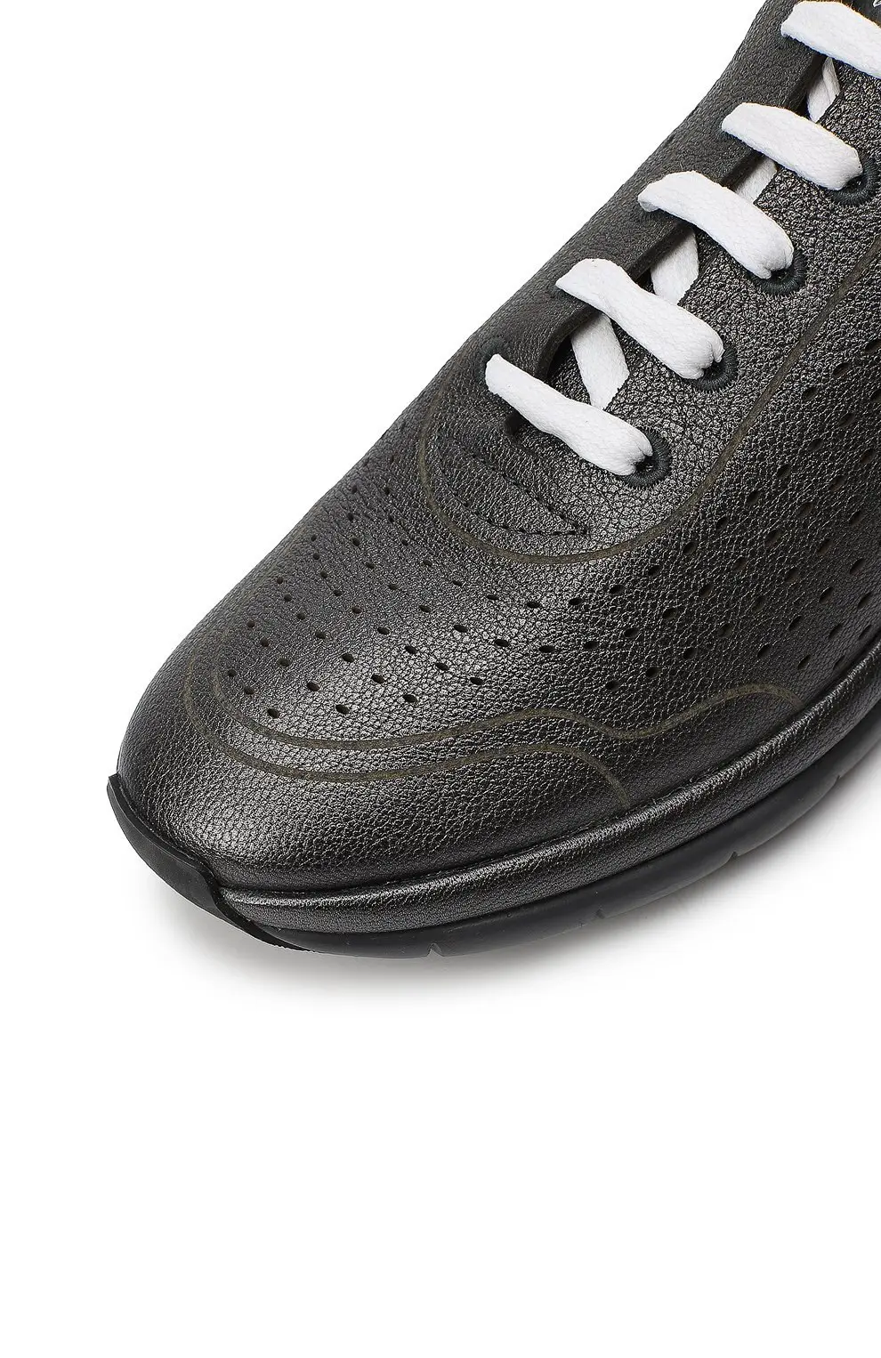 Кроссовки Gils от Salvatore Ferragamo выполнены из мягкой перфорированной кожи металлического оттенка, обеспечивая лёгкость и вентиляцию, дополнены контрастной чёрной подошвой с фирменными амортизирующими вставками и белыми шнурками для современного акцента. Модель сочетает в себе спортивный комфорт и элегантный минимализм, идеально подходя для динамичного городского стиля.