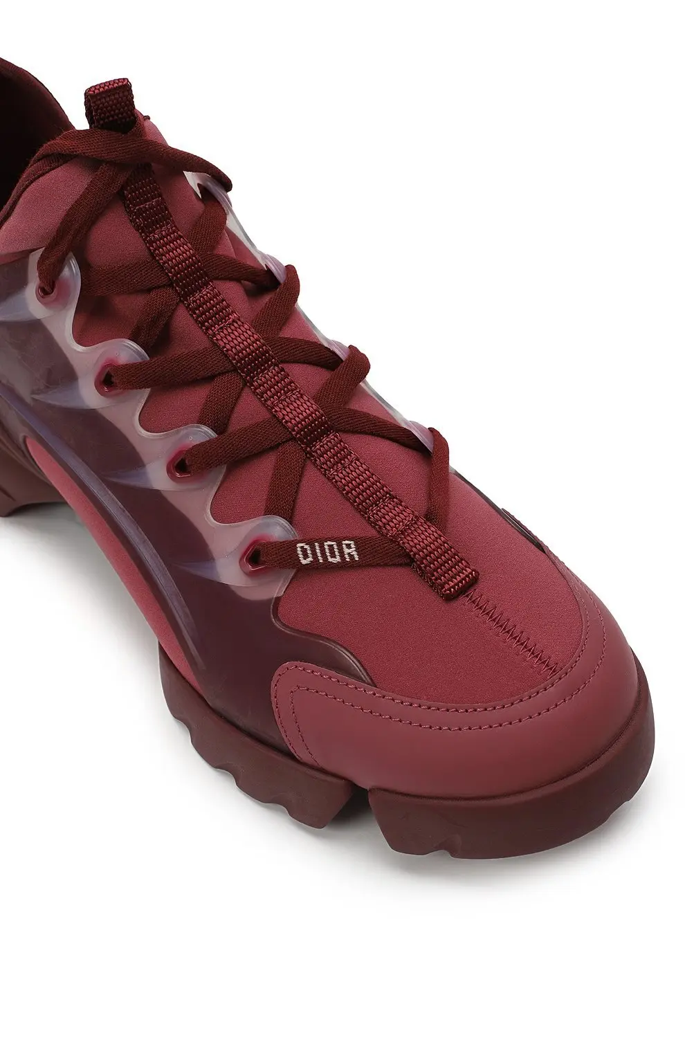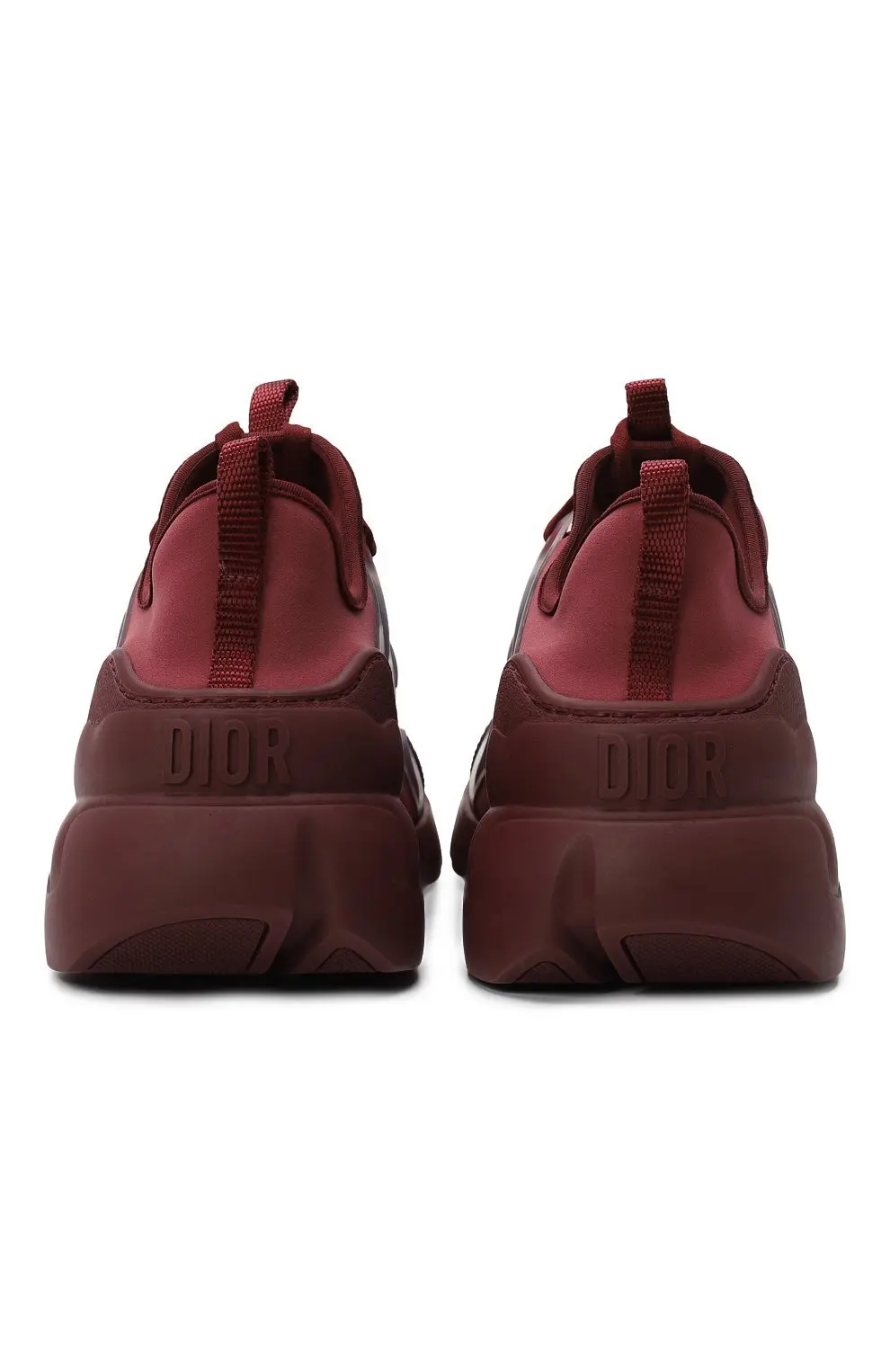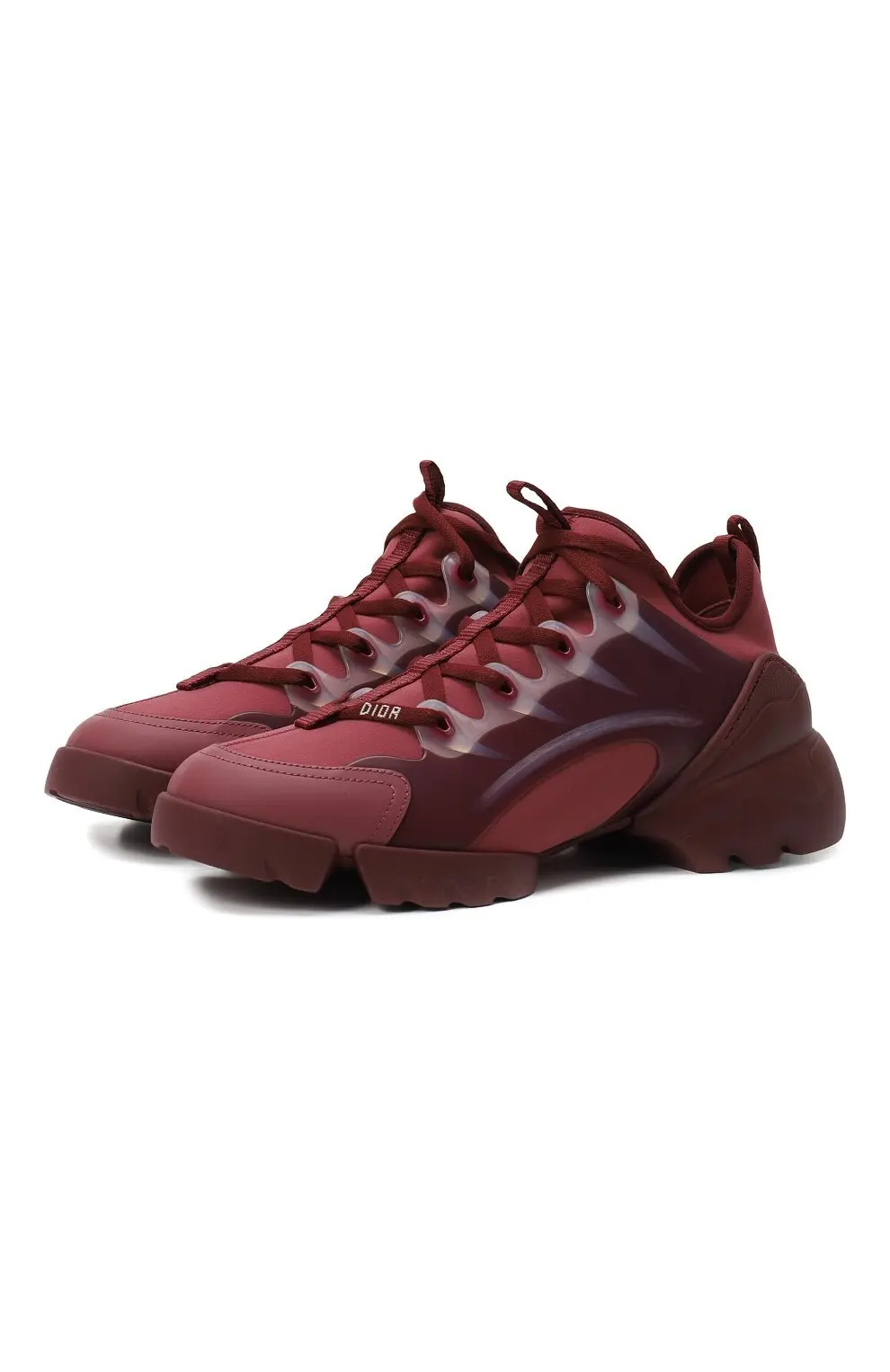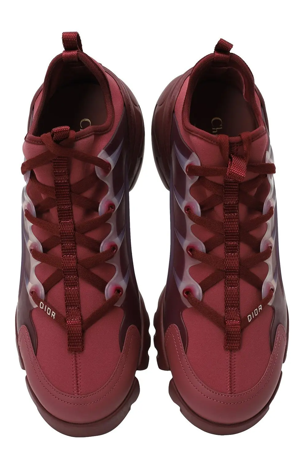 Кроссовки D-Connect Dior в насыщенном бордовом цвете сочетают футуристичный дизайн с практичностью. Верх выполнен из технической ткани с полупрозрачными накладками, а массивная рельефная подошва придаёт динамичный силуэт и обеспечивает комфорт при носке. Логотип Dior на шнурках подчеркивает фирменный стиль.