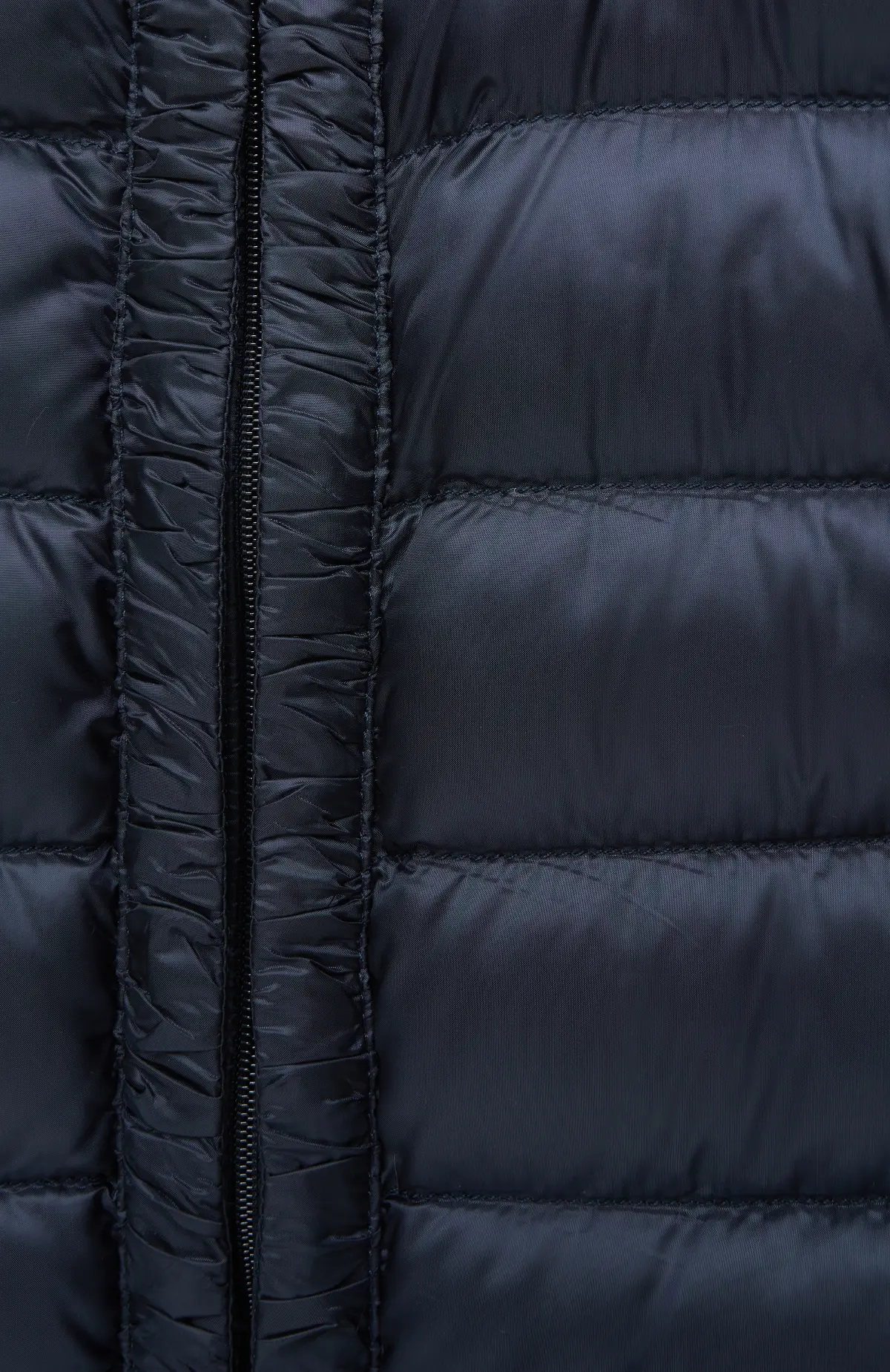 Куртка выполнена из лёгкого стёганого материала с гладкой поверхностью и мягким блеском. Прямой крой создаёт аккуратный, лаконичный силуэт и обеспечивает комфортное прилегание. Капюшон и эластичная отделка по краю добавляют модели практичность и подчёркивают её функциональный характер.