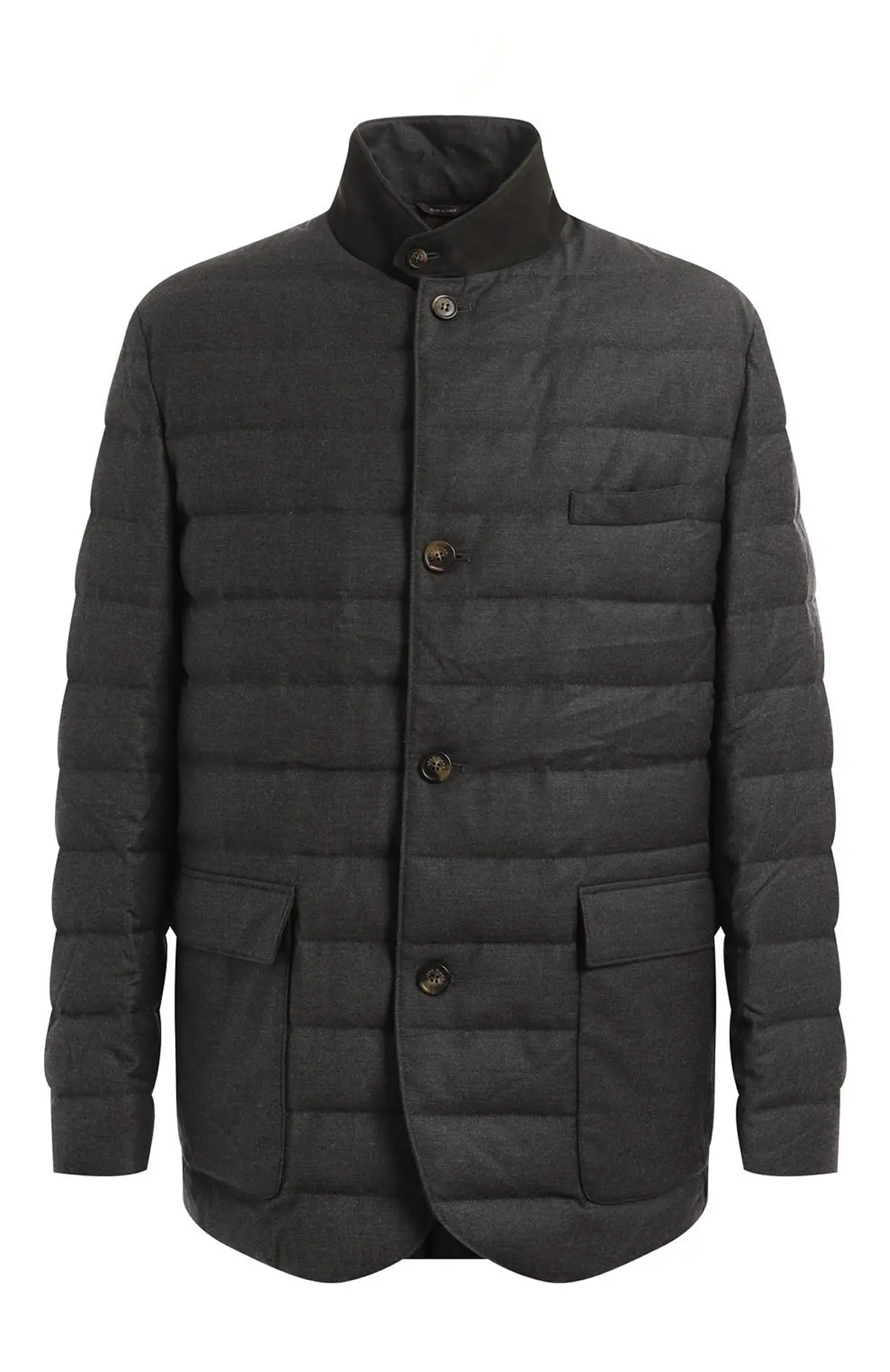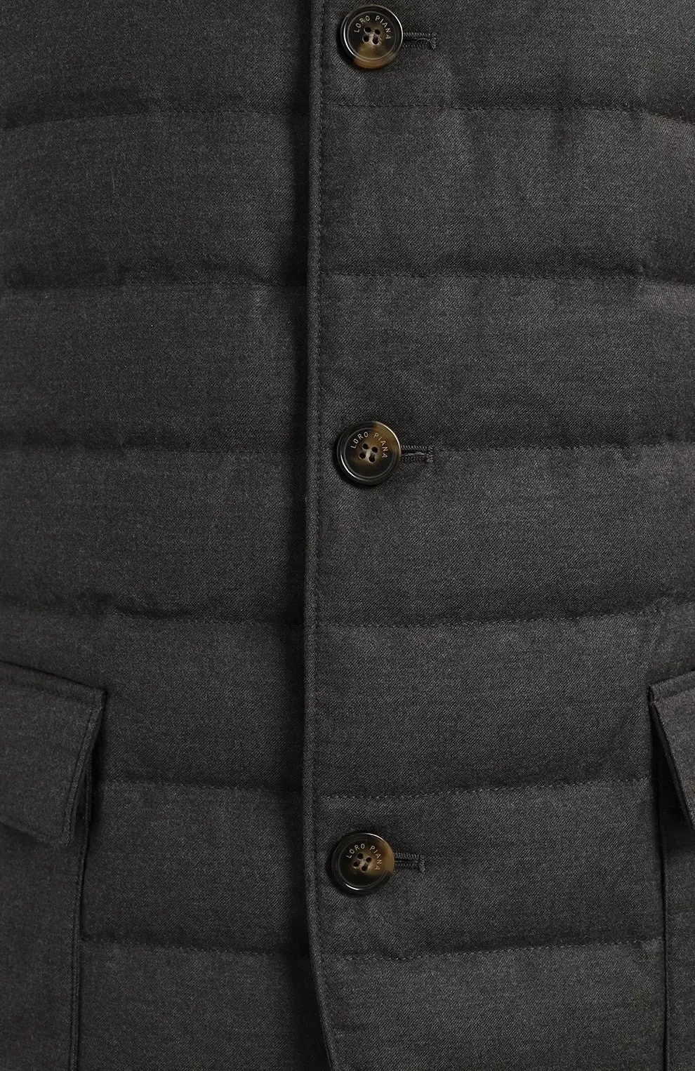 Стильный пуховик Loro Piana в тёмно-сером оттенке выполнен из шерстяной ткани с водоотталкивающей пропиткой. Прямой силуэт дополнен горизонтальной стёжкой, воротником-стойкой с замшевой отделкой и застёжкой на пуговицы. Практичные накладные карманы и лёгкий утеплитель обеспечивают комфорт и защиту в холодное время года.