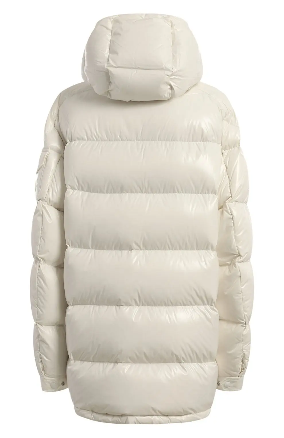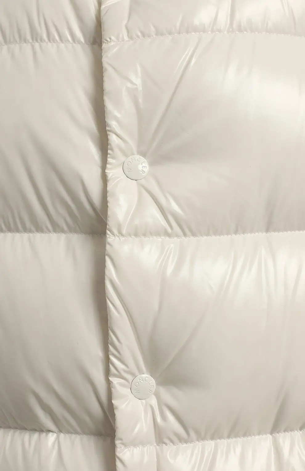Пуховик от Moncler выполнен из гладкого материала с лёгким блеском в молочном оттенке. Объёмная модель с горизонтальной стёжкой и утеплителем из пуха и пера обеспечивает максимальное тепло и комфорт. Куртка оснащена высоким воротником и капюшоном с кулиской, застёгивается на молнию и планку с кнопками. Функциональные карманы на молниях и клапанах подчёркивают практичность, а лаконичный дизайн отражает современный стиль бренда.