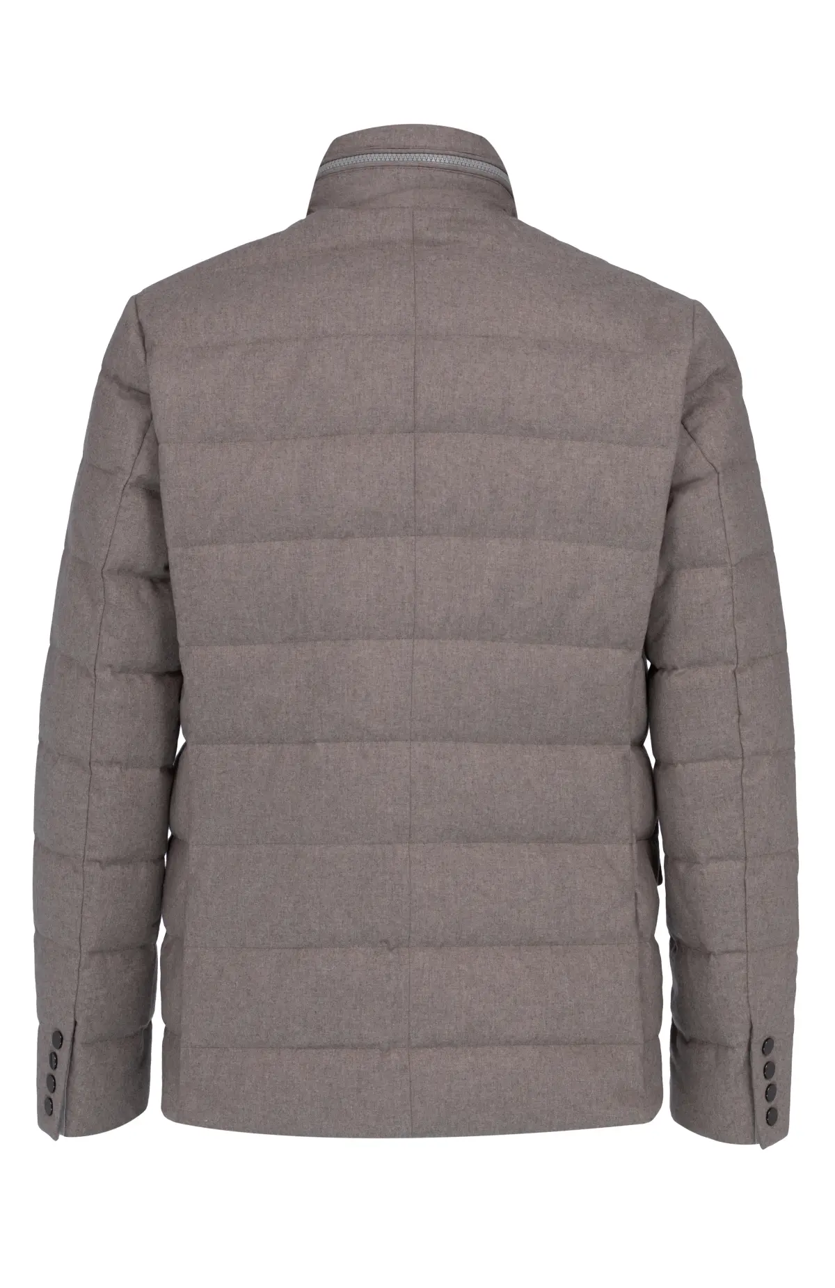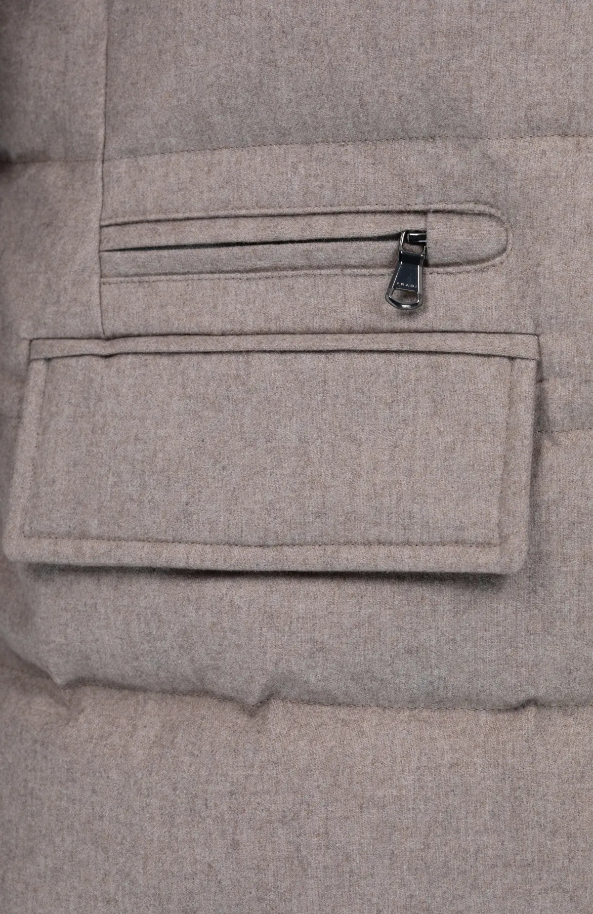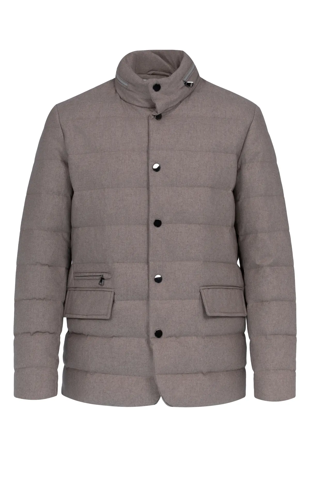 Куртка выполнена из плотного материала с добавлением кашемира, отличающегося мягкой фактурой и благородной матовой поверхностью. Наполнитель из пуха обеспечивает лёгкость и эффективное сохранение тепла, создавая ощущение комфорта в прохладную погоду. Модель дополнена аккуратной стёжкой, воротником-стойкой и функциональными карманами, формируя сдержанный и современный силуэт.