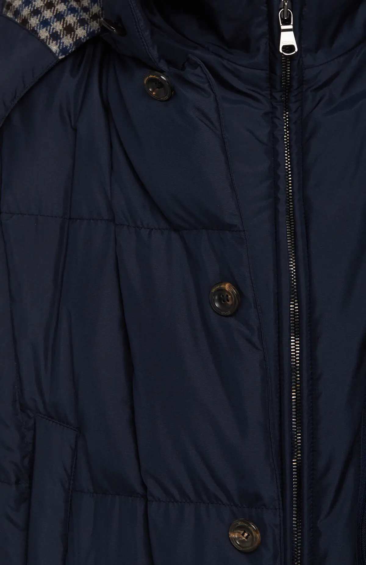 Утепленная куртка глубокого синего оттенка выполнена в удлиненном силуэте и дополнена объемным стеганым рисунком. Модель оснащена высоким воротником и капюшоном с контрастной подкладкой в клетку, которые надежно защищают от ветра и холода. Практичные накладные и прорезные карманы позволяют разместить необходимые мелочи, а застежка на пуговицы и планка придают изделию аккуратный, гармоничный вид.