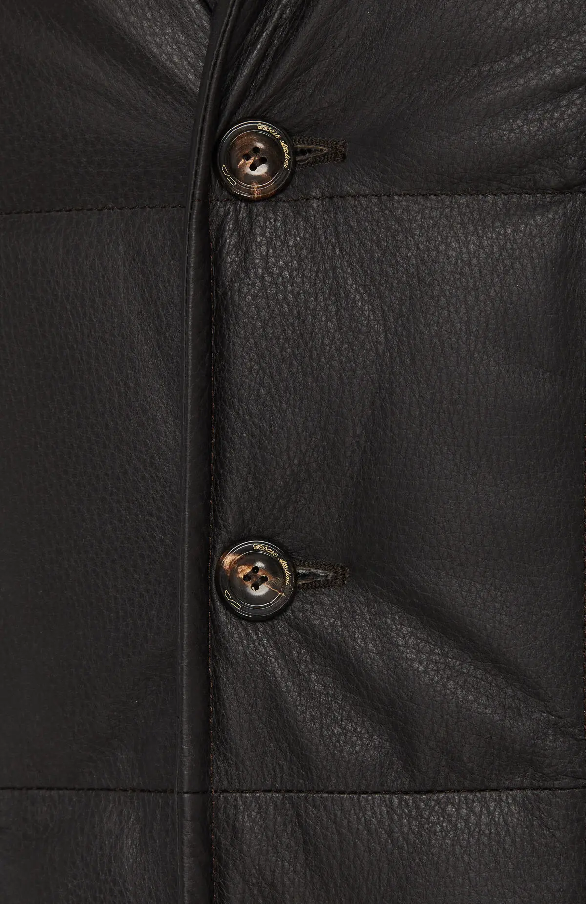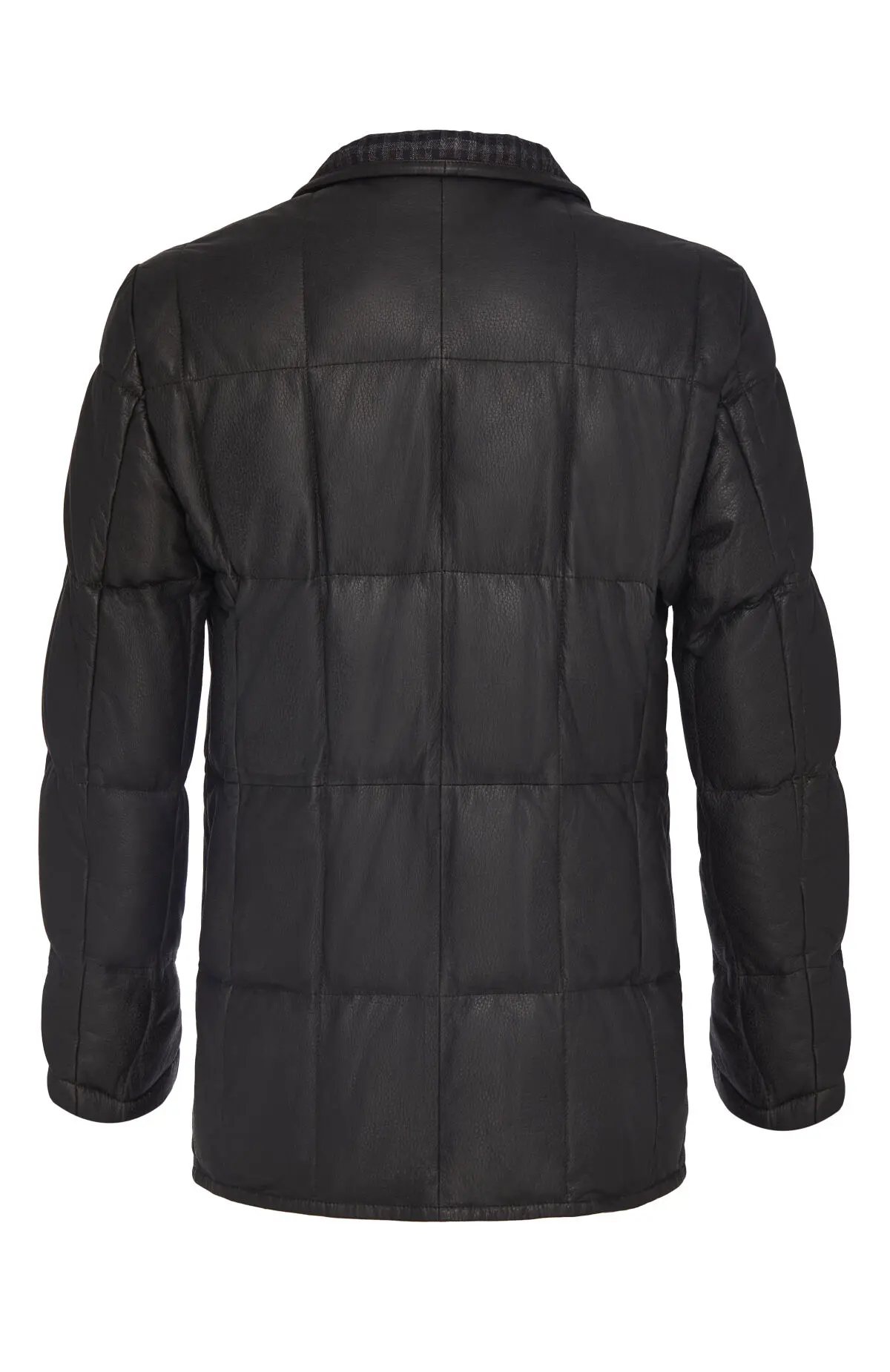 Куртка из мягкой тёмной кожи выполнена в стёганом дизайне с деликатной фактурой. Модель с лацканами, застёжкой на пуговицы и наклонными прорезными карманами сочетает формальный силуэт пиджака и комфорт тёплой верхней одежды. Клетчатая подкладка добавляет образу графичный акцент и обеспечивает дополнительный уют в прохладную погоду.