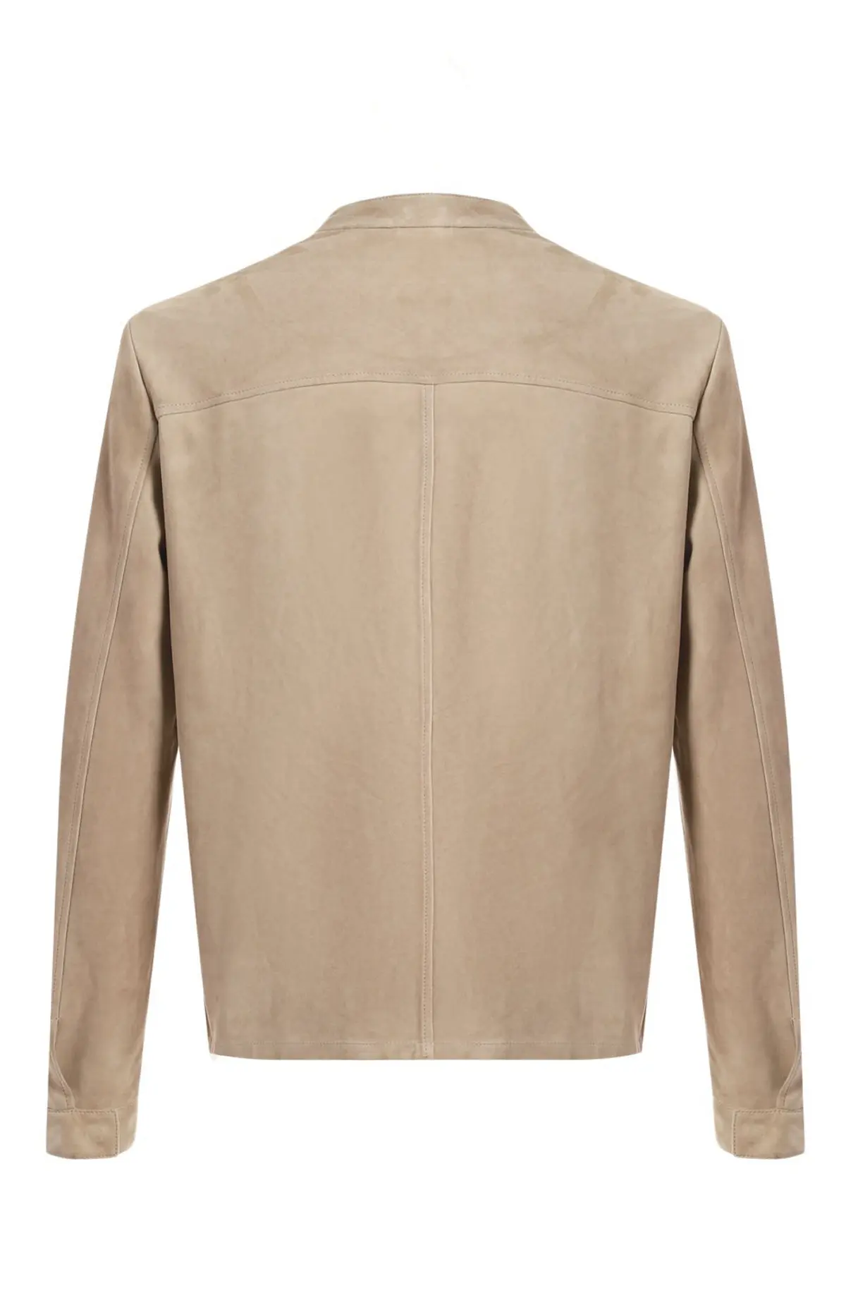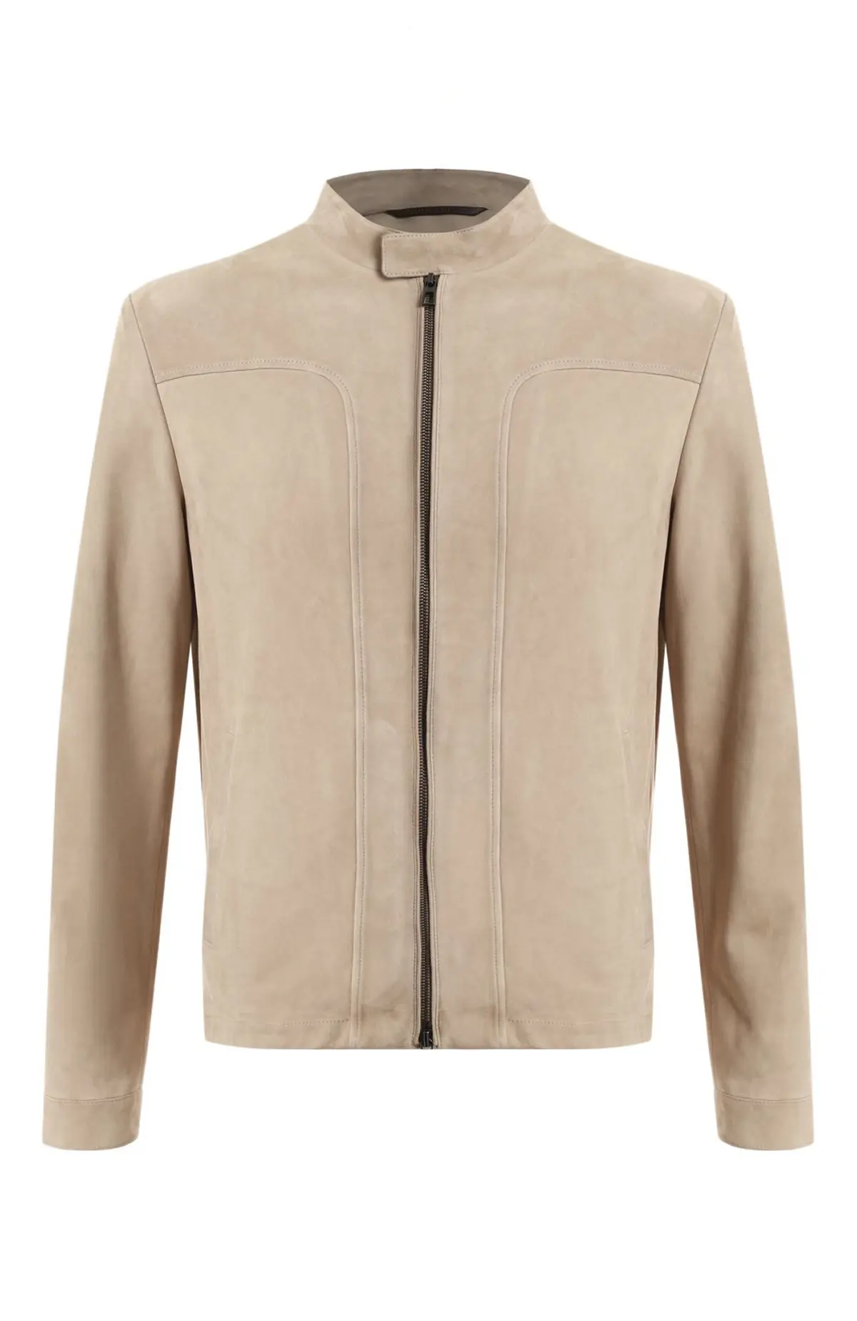 Замшевая куртка от Loro Piana выполнена в элегантном бежевом оттенке и отличается лаконичным дизайном с акцентом на премиальное качество материала. Прямой крой с аккуратными вертикальными швами визуально вытягивает силуэт, а застежка на молнию с высоким воротником-стойкой придает модели современный и функциональный вид. Мягкая замша обеспечивает комфорт и утонченность, делая куртку универсальным выбором как для повседневных, так и для более изысканных образов.