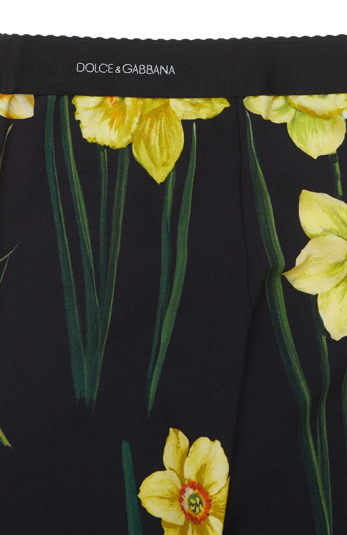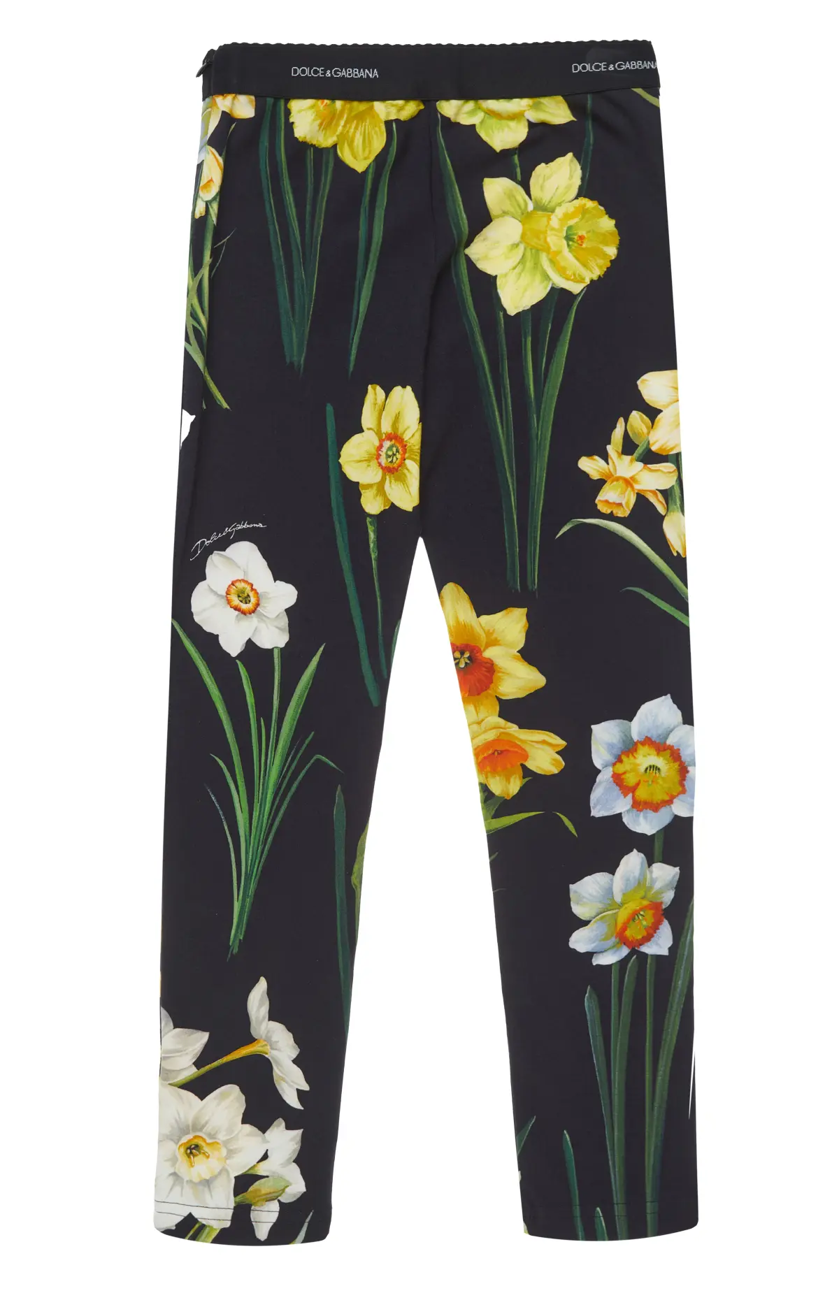 Леггинсы выполнены из эластичного материала с эффектным цветочным принтом на тёмном фоне. Модель с комфортной посадкой и мягким поясом, украшенным логотипом бренда, обеспечивает удобство в течение всего дня. Яркие изображения нарциссов и изящные детали придают образу выразительность и подчёркивают фирменный стиль.