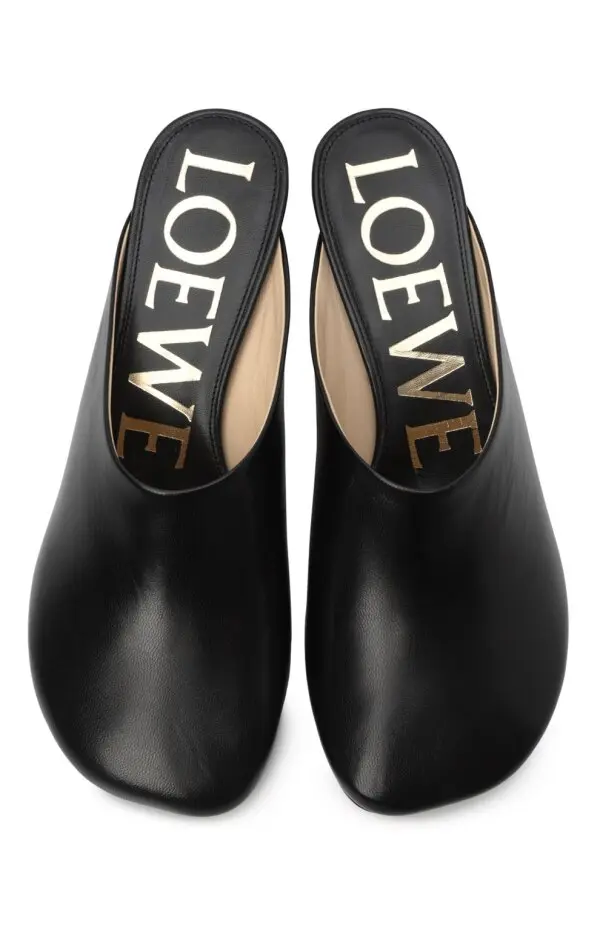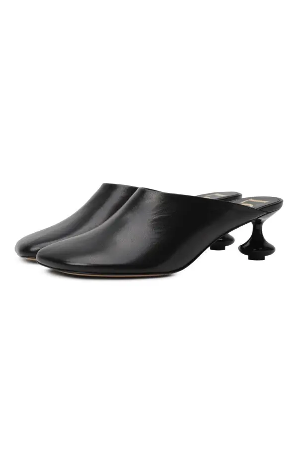 Мюли Toy от Loewe из гладкой чёрной кожи. Отличительной чертой модели является оригинальный фигурный каблук, который придаёт обуви современный и концептуальный вид. Минималистичный верх гармонично сочетается с авангардным дизайном подошвы, делая пару универсальной и стильной.