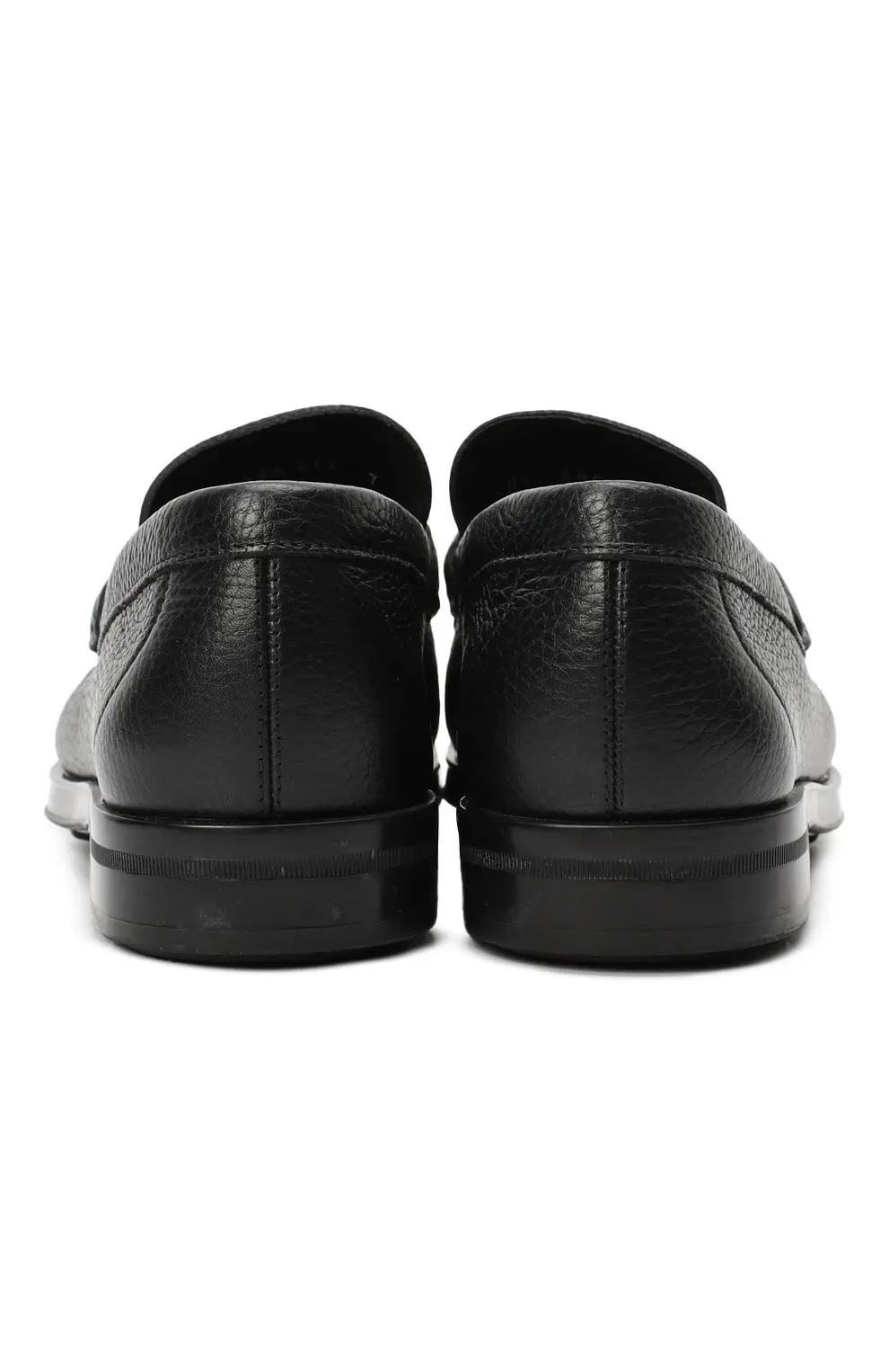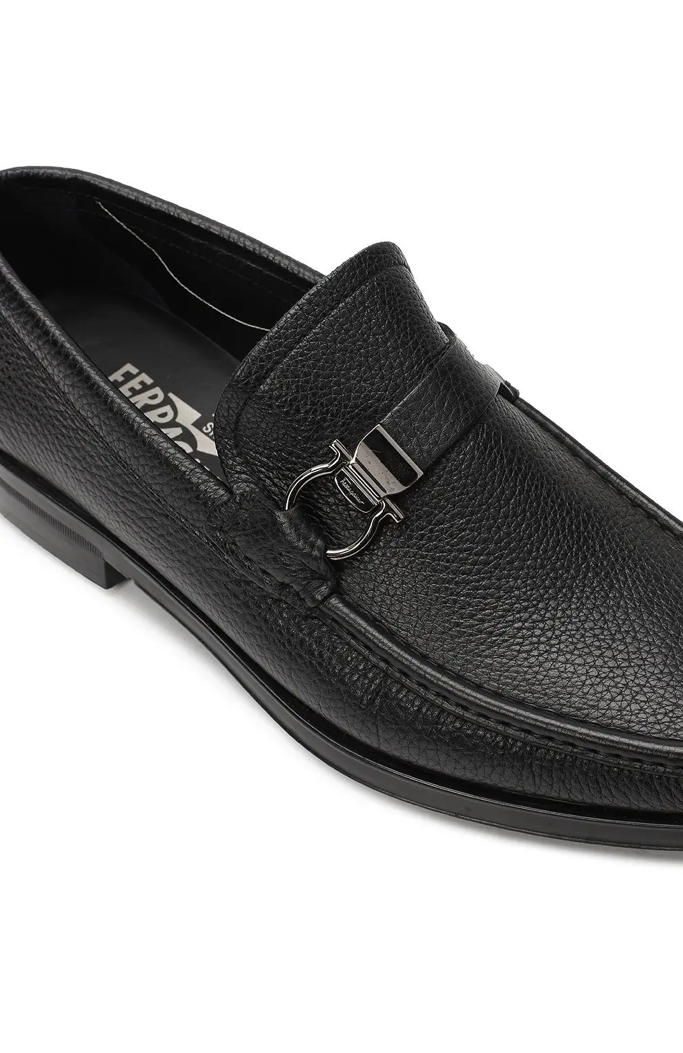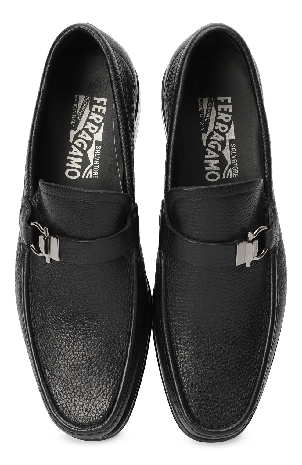 Лоферы Salvatore Ferragamo — элегантная пара из мягкой зернистой черной кожи с фирменной металлической пряжкой Gancini. Классическая форма с закругленным мысом и аккуратной прострочкой подчеркивает итальянский стиль и безупречное мастерство бренда. Гибкая подошва обеспечивает комфорт при ходьбе, делая эту модель идеальным выбором для повседневного делового образа.