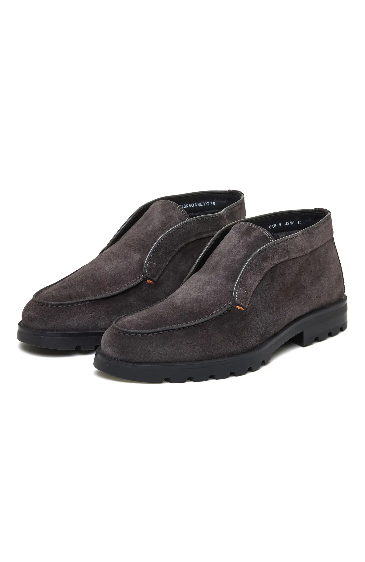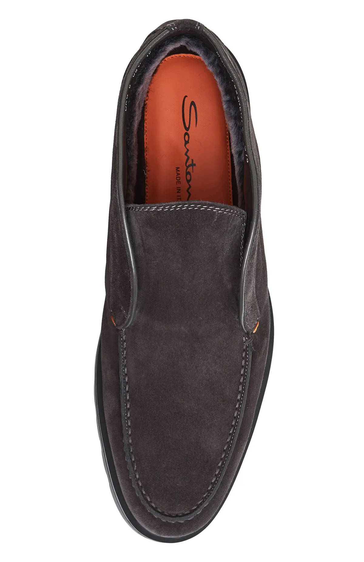 Лоферы Santoni — стильная модель из мягкой замши глубокого серого оттенка. Элегантная форма с округлым мыском и прорезными деталями дополнена прочной рифлёной подошвой, обеспечивающей комфорт и устойчивость при ходьбе. Контрастная прострочка и аккуратные декоративные элементы подчеркивают безупречное итальянское мастерство бренда. Эти лоферы идеально подойдут для повседневного гардероба в стиле smart casual.