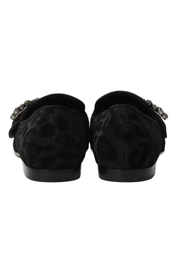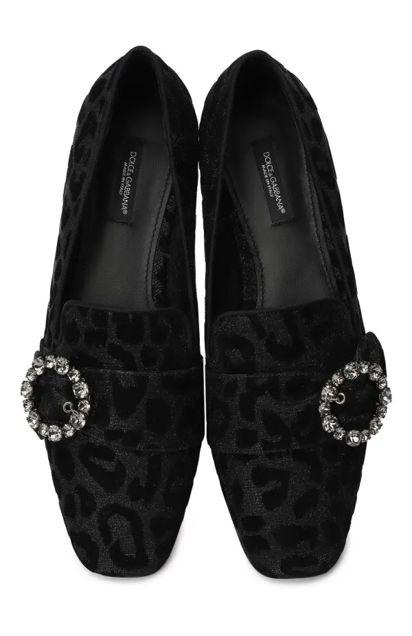 Замшевые лоферы Dolce & Gabbana выполнены из мягкой черной замши с бархатистой фактурой и леопардовым тиснением, придающим модели благородный акцент. Декоративная пряжка с инкрустацией кристаллами подчеркивает роскошный стиль бренда, а лаконичный силуэт и плоская подошва обеспечивают комфорт и универсальность. Эти лоферы идеально сочетают элегантность и практичность, дополняя как повседневные, так и вечерние образы.