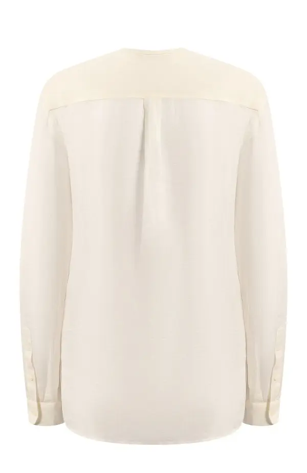 Блузка Loro Piana из лёгкого шелка кремового оттенка. Лаконичный дизайн с потайной планкой подчёркивает утончённость силуэта, делая модель универсальной для делового и повседневного гардероба.