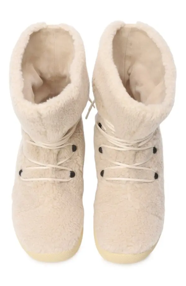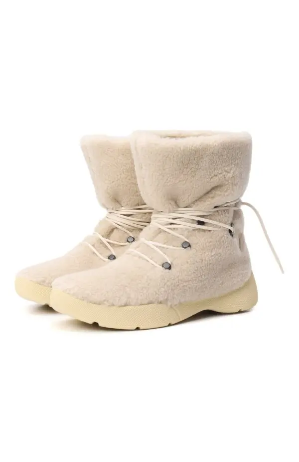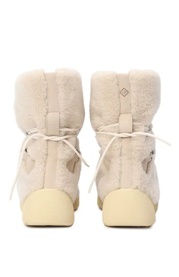 Сапоги Trace Loro Piana выполнены из мягкой овчины цвета айвори, которая обеспечивает максимальный комфорт и тепло в холодное время года. Модель имеет современный дизайн с функциональной шнуровкой и лёгкой подошвой, что делает обувь практичной и удобной для повседневной носки. Сочетание премиальных материалов и минималистичного стиля подчёркивает фирменную эстетику бренда, объединяя роскошь и комфорт.