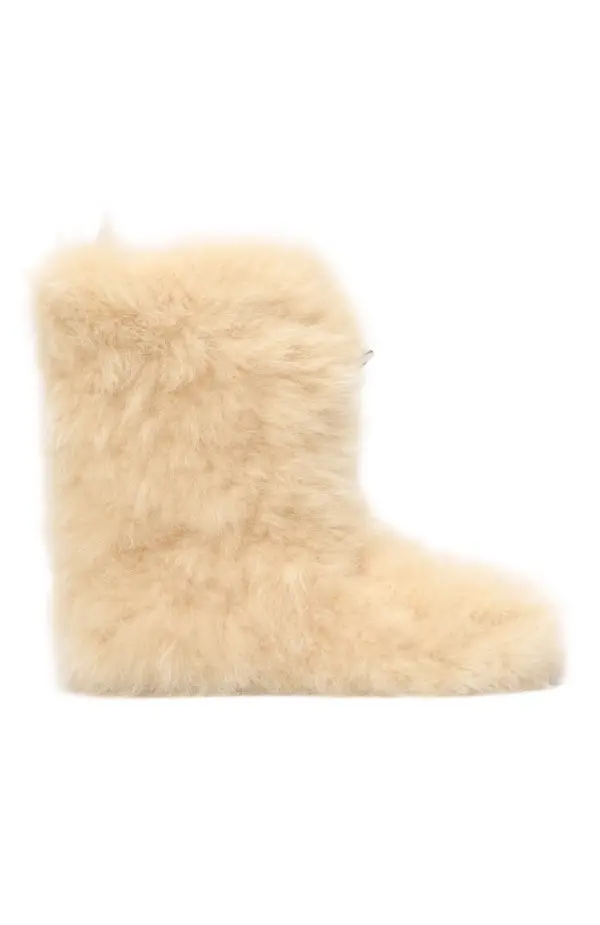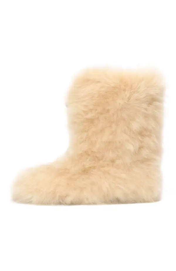 Женские ботинки от Loro Piana выполнены из мягкого овечьего меха в светлом бежевом оттенке. Модель с объемным силуэтом и высокой голенью обеспечивает тепло и комфорт в холодное время года. Акцентом служит изящная декоративная деталь с логотипом бренда. Обувь сочетает уют и утончённый стиль, отражая фирменную эстетику Loro Piana.