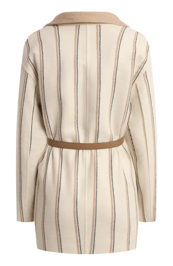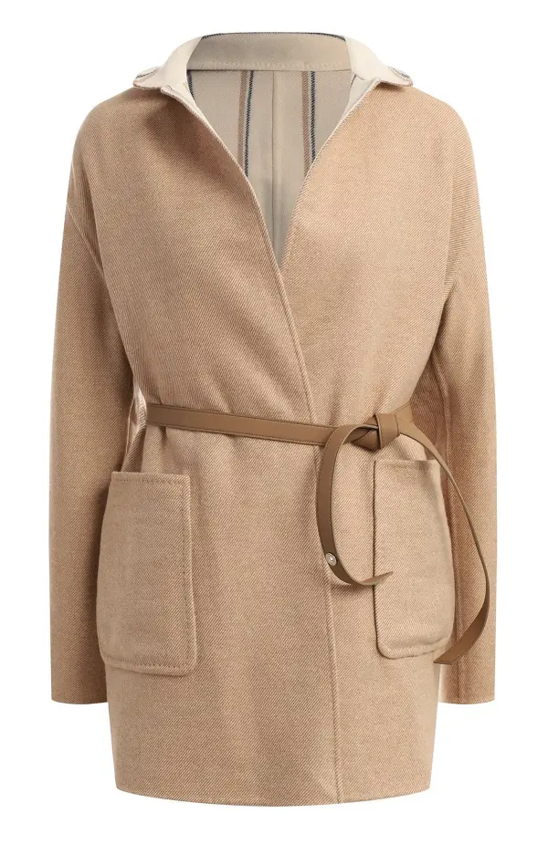 Двусторонний жакет Loro Piana выполнен из мягкой кашемировой ткани в универсальной длине и застёгивается на тонкий кожаный пояс. С одной стороны модель представлена в классическом бежевом оттенке с крупными накладными карманами, с другой — в светлой полоске с акцентом на минимализм. Лаконичный крой и возможность менять оформление делают жакет функциональным элементом гардероба, подходящим как для повседневных, так и для элегантных образов.