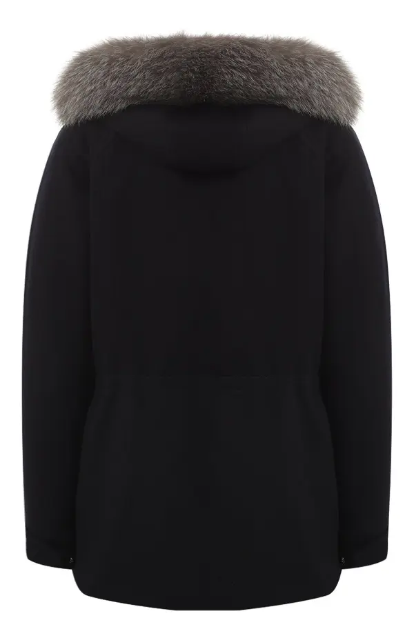 Черное полупальто Loro Piana сочетает в себе элегантность и функциональность. Модель выполнена из мягкого кашемира, утеплена и дополнена капюшоном с роскошной отделкой из натурального меха, что придаёт образу статусность и обеспечивает комфорт в холодное время года. Лаконичный крой и скрытая застёжка подчеркивают утончённый стиль бренда.