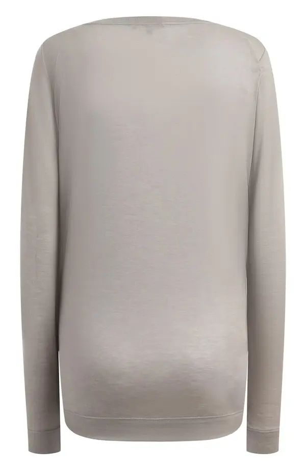 Тонкий лонгслив Loro Piana выполнен из мягкого кашемира с добавлением шелка, что придаёт ткани изысканный блеск и комфортное ощущение на коже. Модель с округлым вырезом и длинными рукавами идеально подходит для многослойных образов. Нейтральный серо-бежевый оттенок делает вещь универсальной базой в гардеробе.