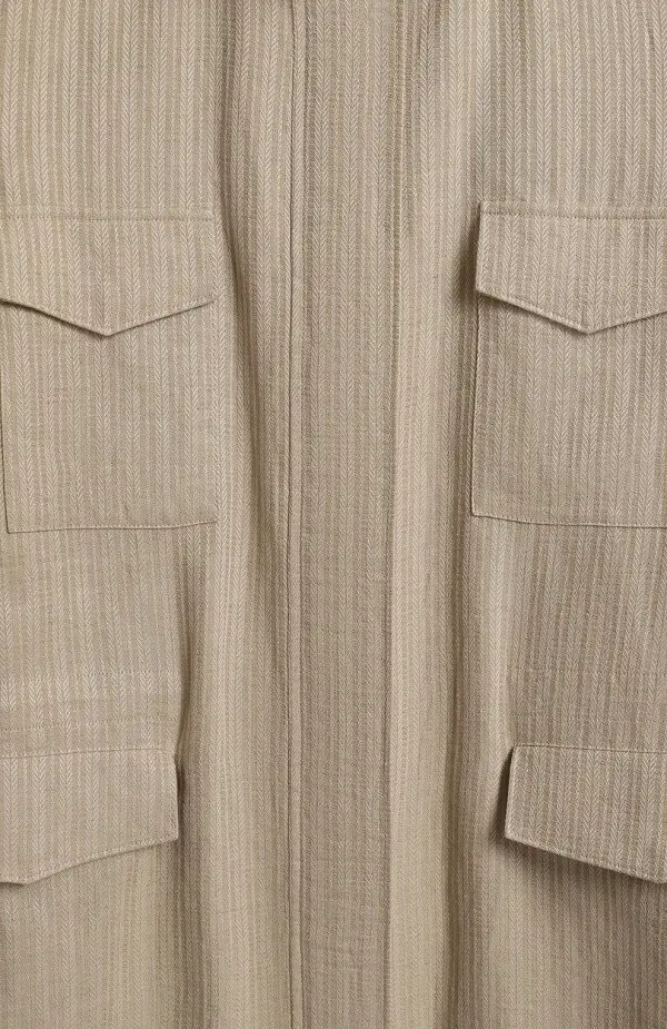 Изысканная полевая куртка Loro Piana из льняной ткани бежевого цвета в елочку. Он отличается высокой горловиной, скрытой застежкой на пуговицы спереди, передними карманами с клапанами, длинными рукавами с манжетами на пуговицах, внутренним шнурком на талии и внутренней частью без подкладки.