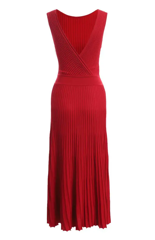 Платье из шелка и хлопка Loro Piana в насыщенном красном оттенке выполнено в изысканном минималистичном стиле. Фактурный трикотаж с мелким рубчиком мягко подчеркивает фигуру, а расклешённый книзу силуэт добавляет легкости движений. Лаконичный крой без рукавов делает модель универсальной — она одинаково уместна как для дневного выхода, так и для вечернего образа.