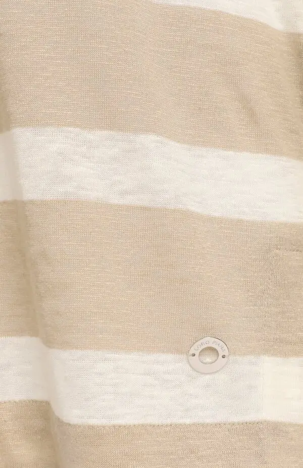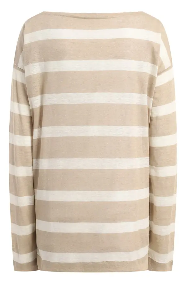 Льняной пуловер Loro Piana в широкой бежево-молочной полоске выполнен из мягкого, лёгкого и дышащего льна высшего качества. Прямой свободный крой и округлый вырез горловины обеспечивают комфорт и непринуждённый силуэт. Универсальная расцветка делает модель идеальной для летнего гардероба — пуловер гармонично сочетается с джинсами, льняными брюками или юбками, создавая расслабленные элегантные образы.