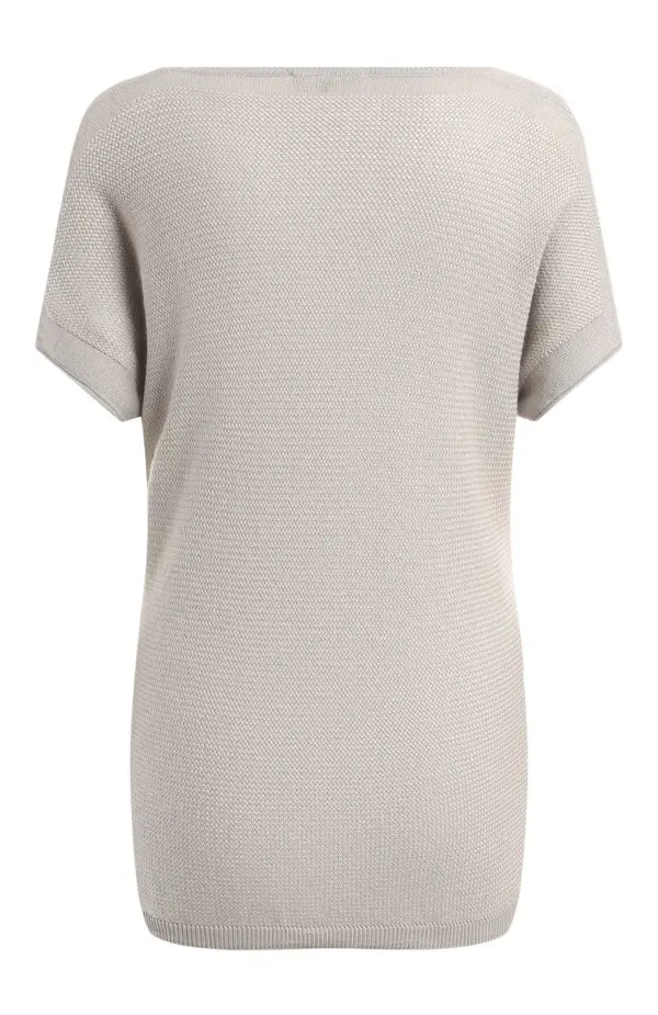 Пуловер Loro Piana из кашемира и шелка выполнен в светло-сером оттенке с изысканной текстурой вязки. Модель имеет короткие рукава, мягкий округлый вырез и лаконичный силуэт, подчеркивающий утонченность бренда. Комбинация кашемира и шелка придаёт изделию лёгкость, воздушность и деликатный блеск. Универсальный базовый пуловер идеально сочетается как с классическими брюками, так и с повседневными джинсами, создавая безупречный образ в стиле casual luxe.