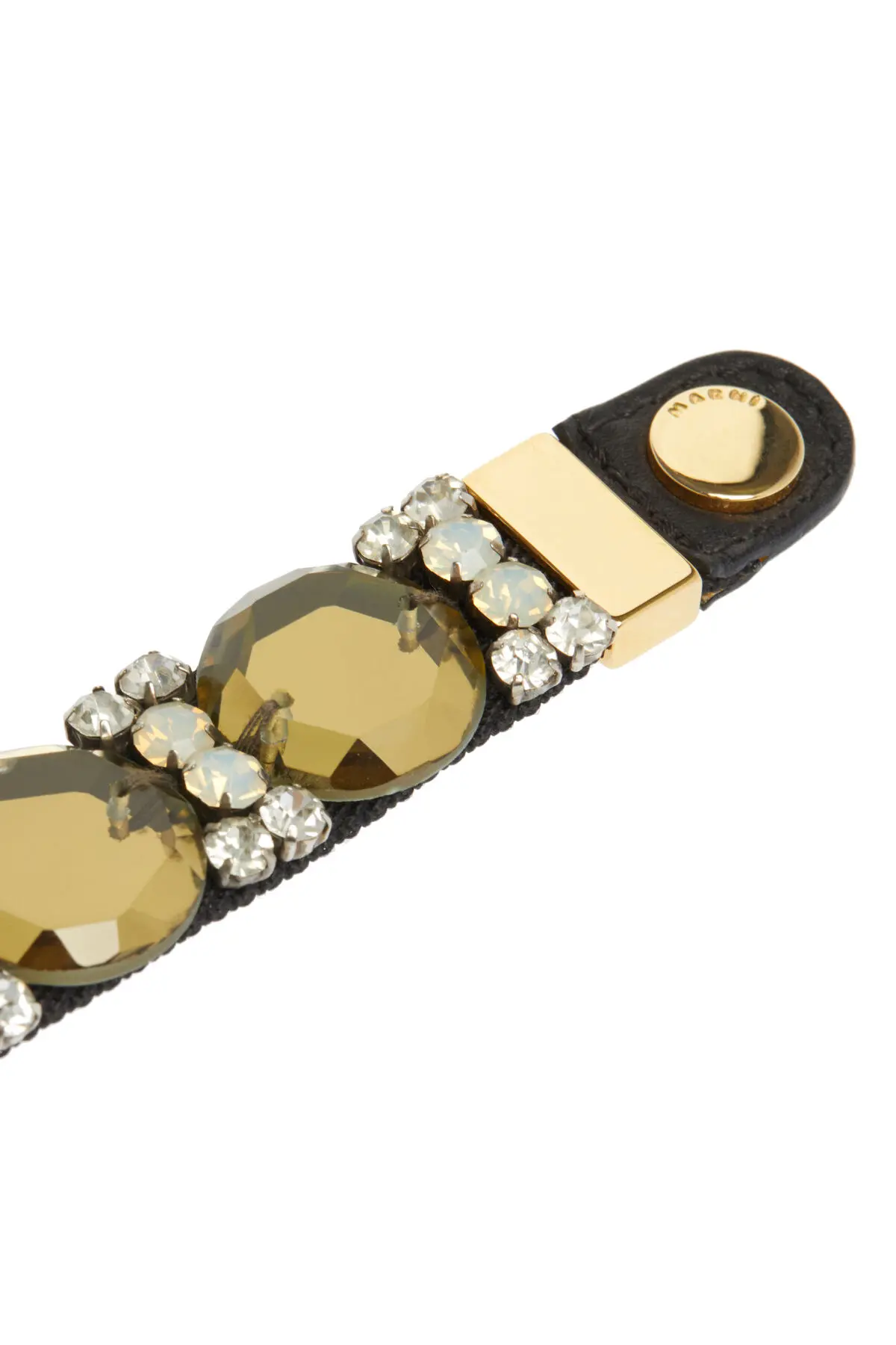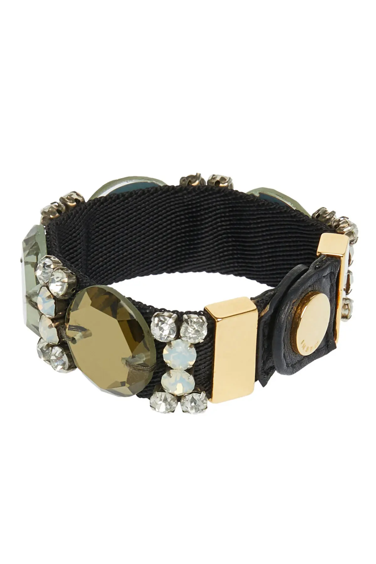 Узкий браслет-манжет на кнопке с крупными гранёными кристаллами «smoky» и россыпью светлых страз, закреплённых на кожаной основе. Золотистая фурнитура подчёркивает графичность, браслет эффектно завершает как вечерние, так и дневные образы.